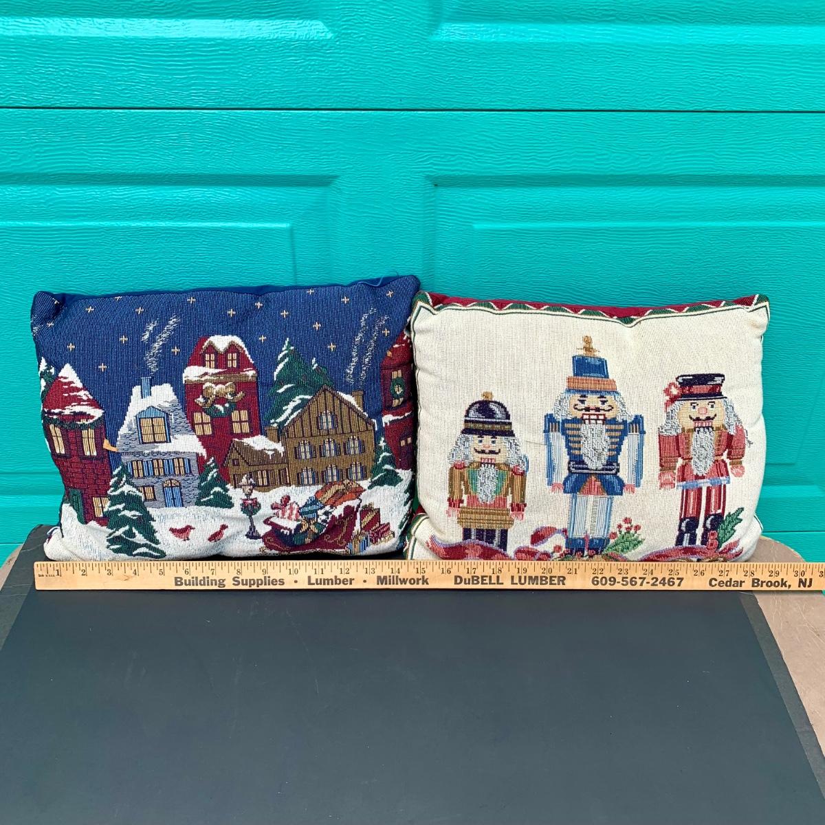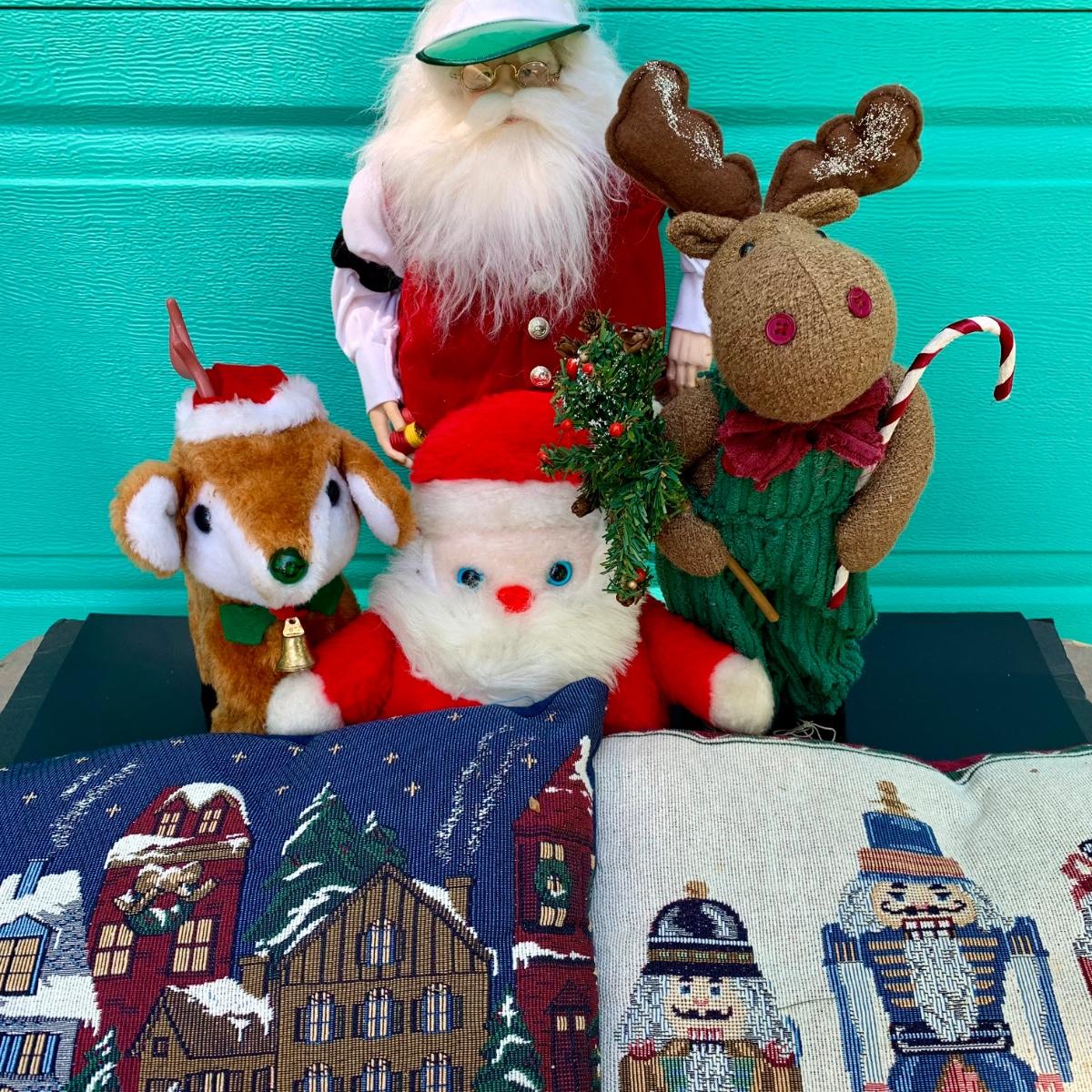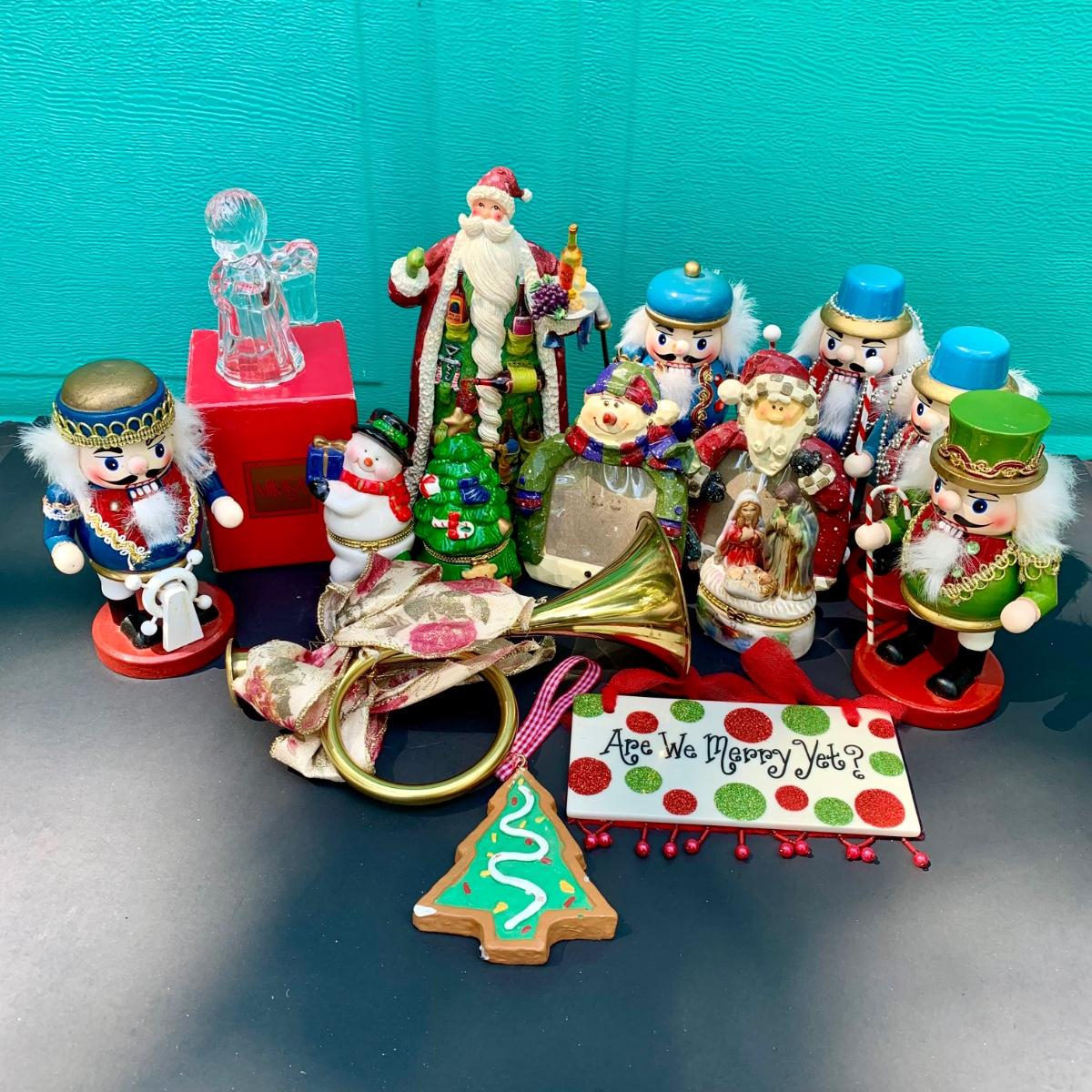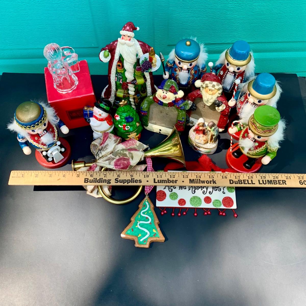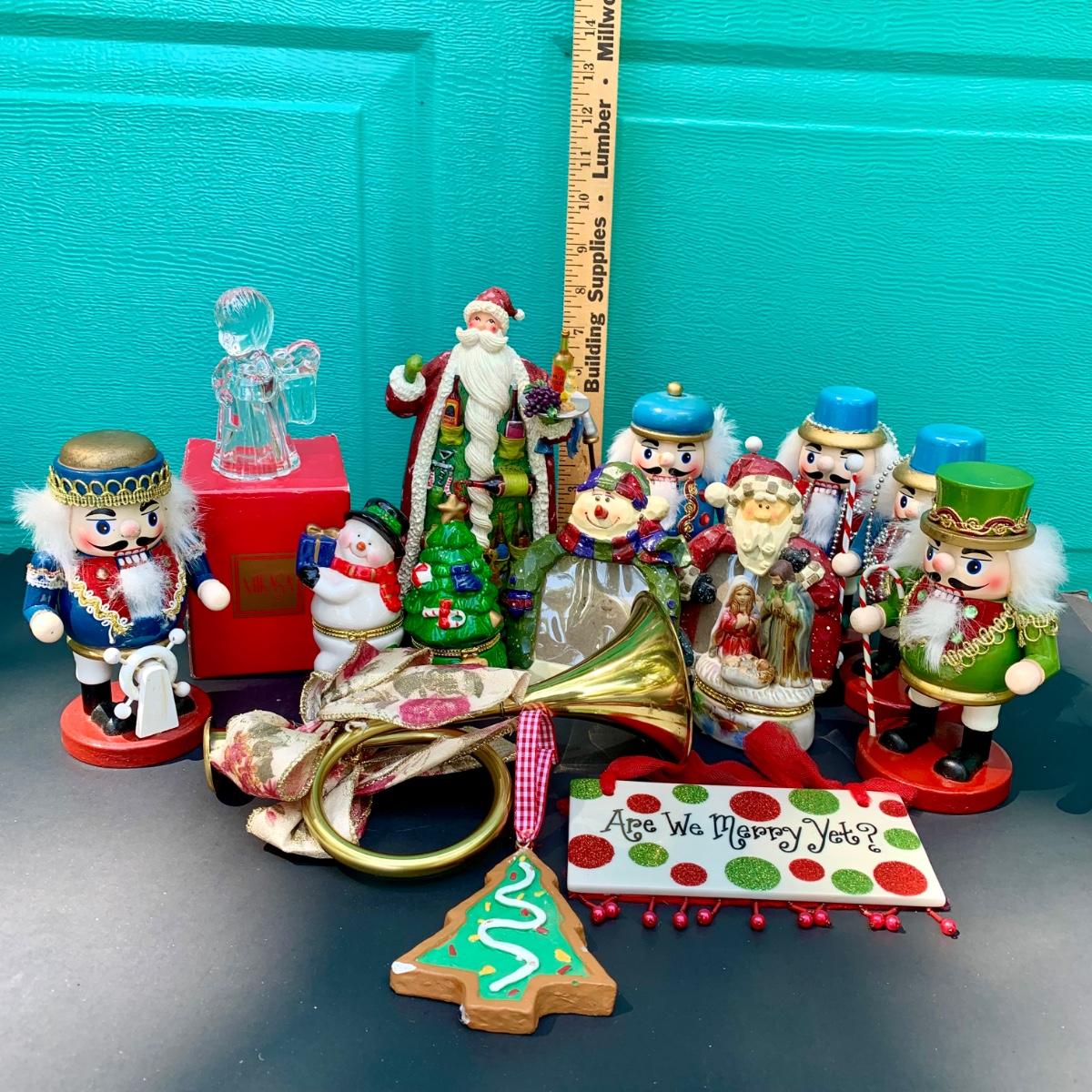 LOT 184 G: Christmas Decor Collection: Throw Pillows, Nutcrackers, Misaka Crystal Angel Candle Holder, Poker & Wine Santas, Musical Wind Up Nose Frosty The Snowman, & More