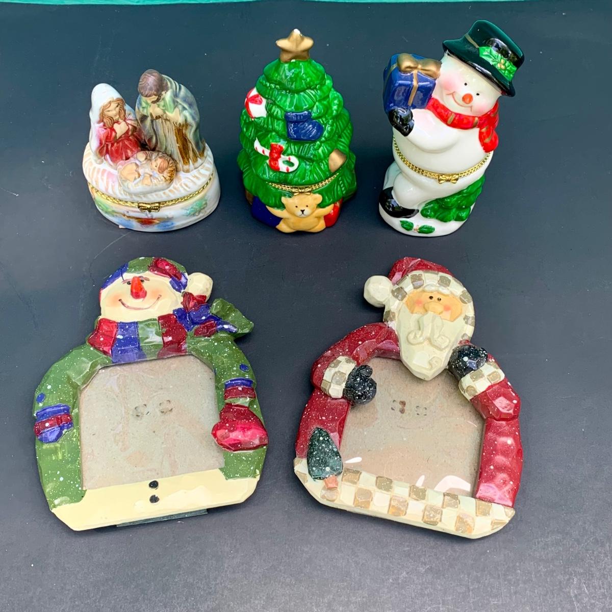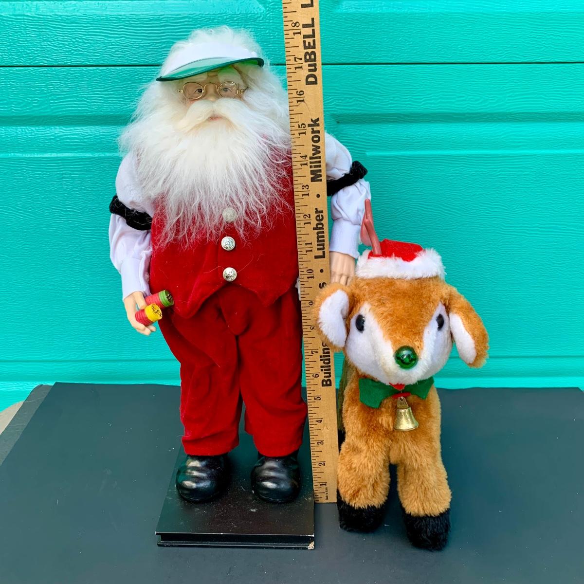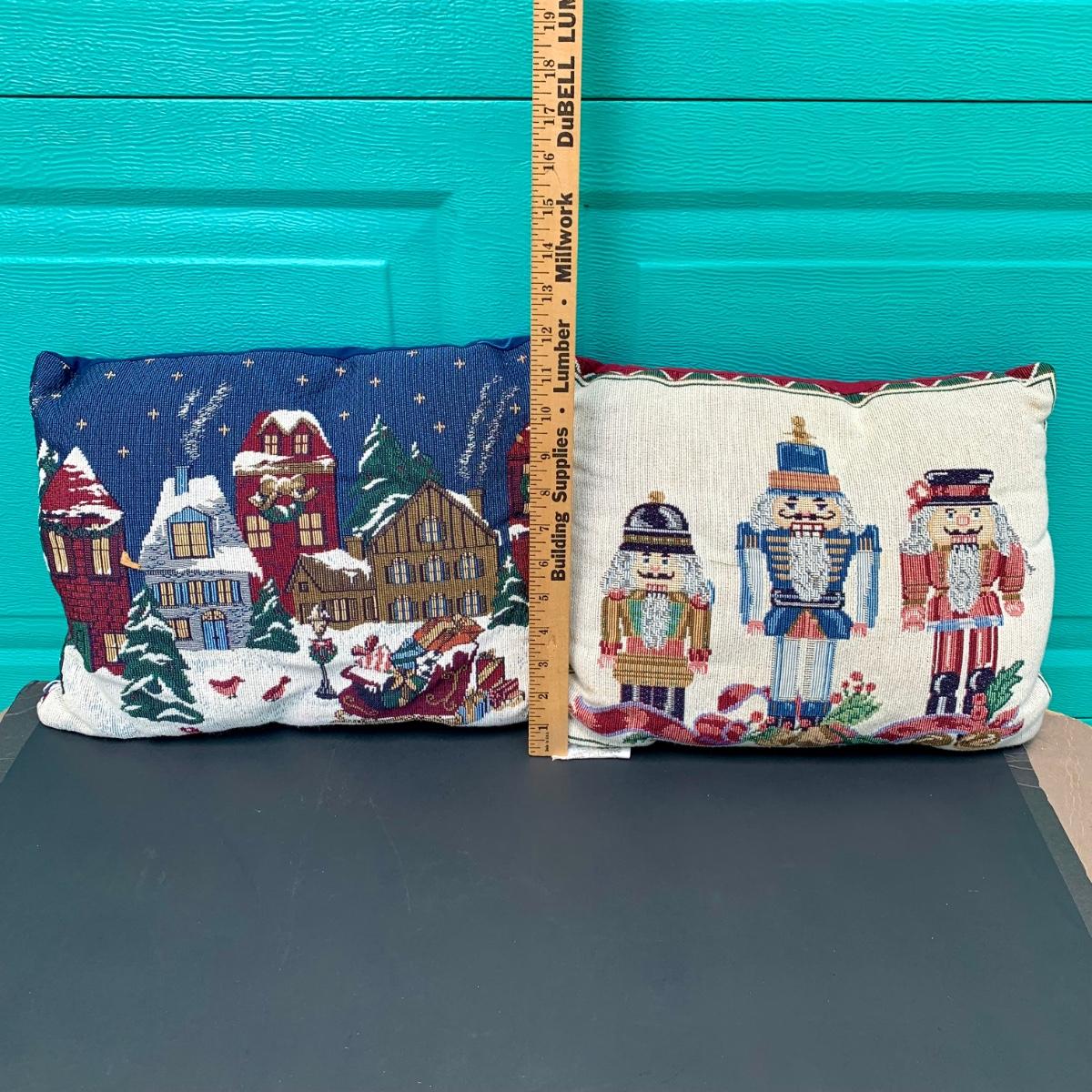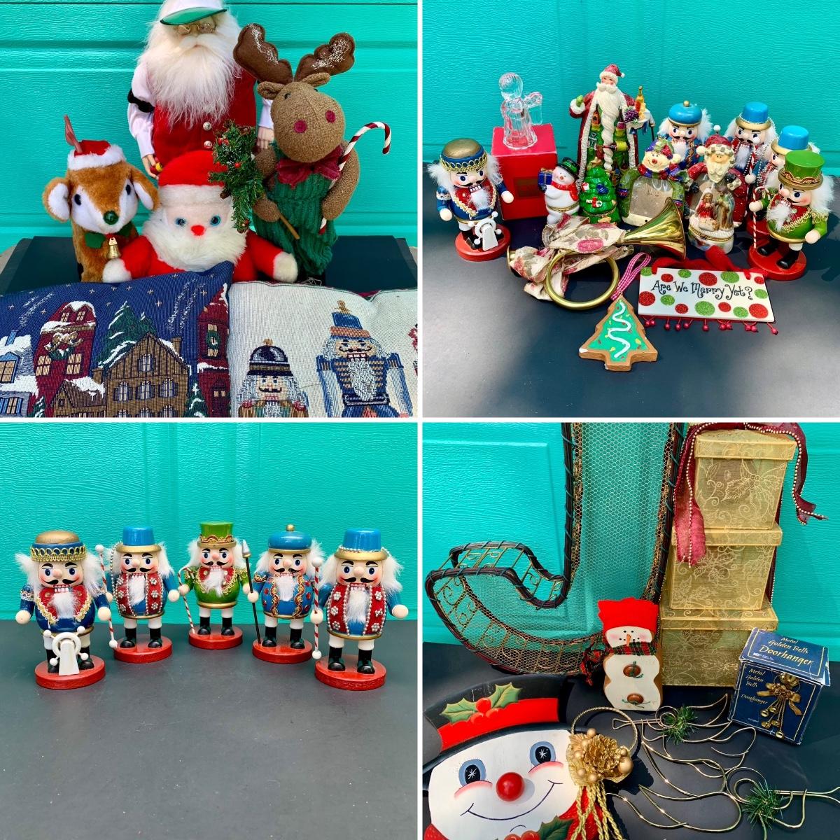 LOT 184 G: Christmas Decor Collection: Throw Pillows, Nutcrackers, Misaka Crystal Angel Candle Holder, Poker & Wine Santas, Musical Wind Up Nose Frosty The Snowman, & More