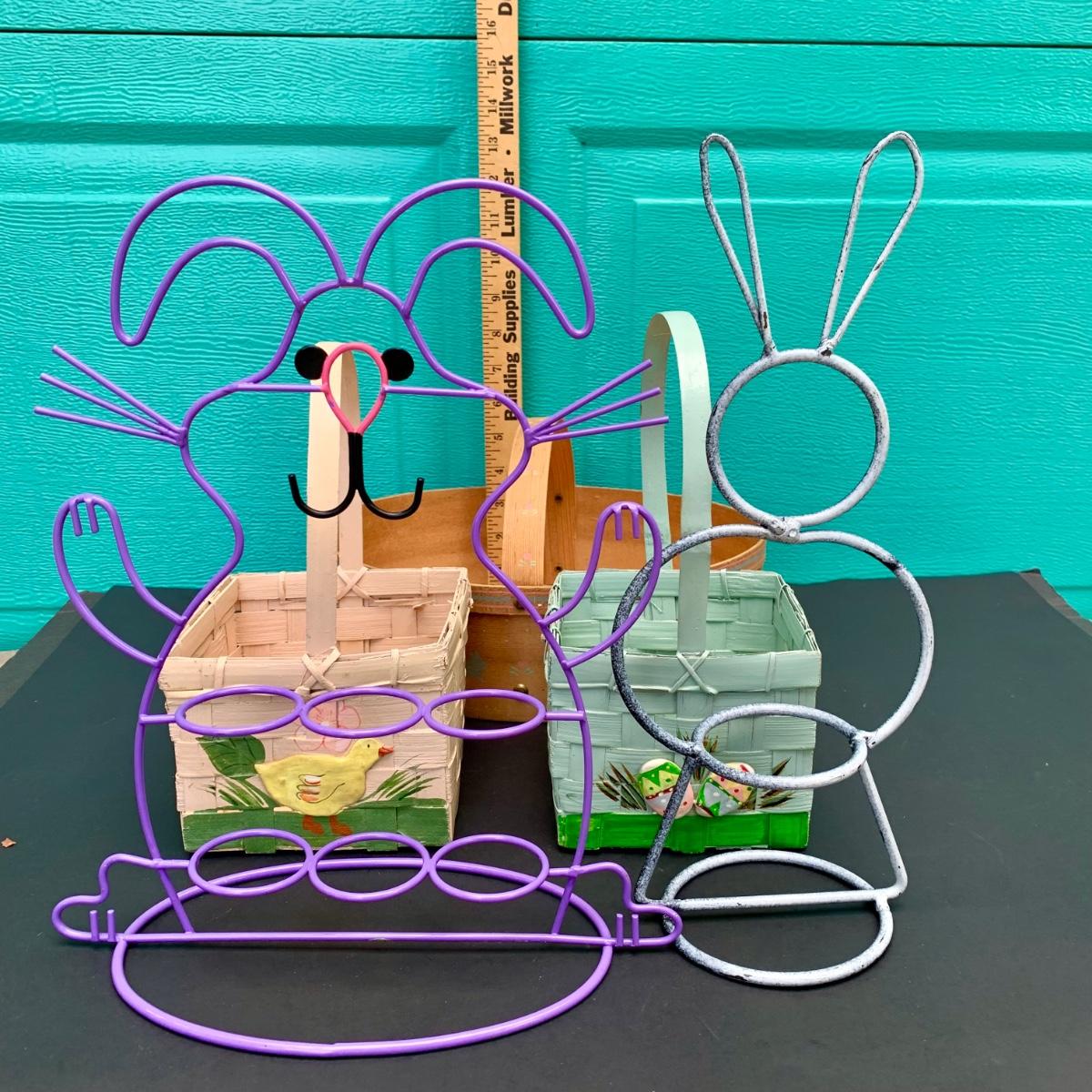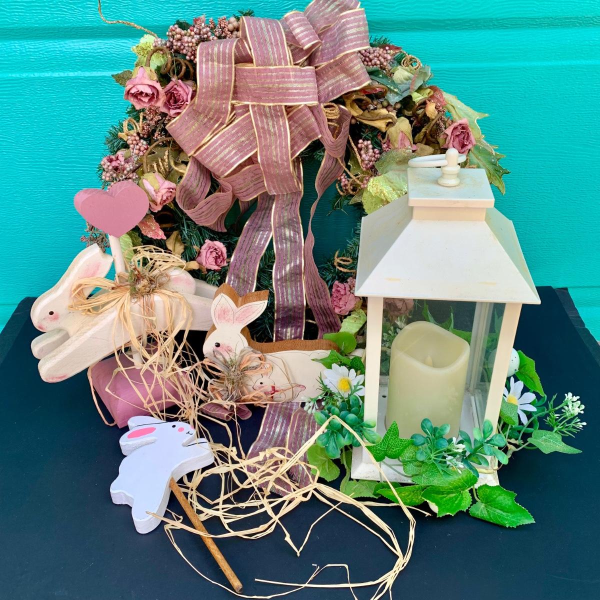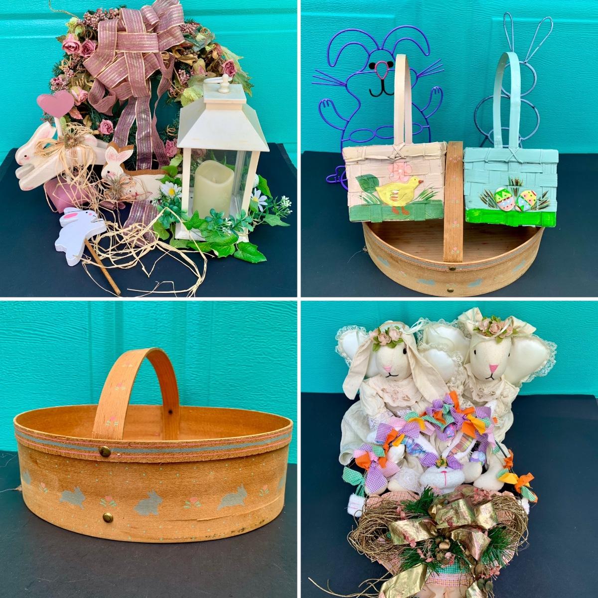 LOT 187 G: Easter Basket & Decor Collection: Wreath, Battery Operated Lantern, Baskets, Wire Egg Holder, Stuffed Angel Bunny Set & More