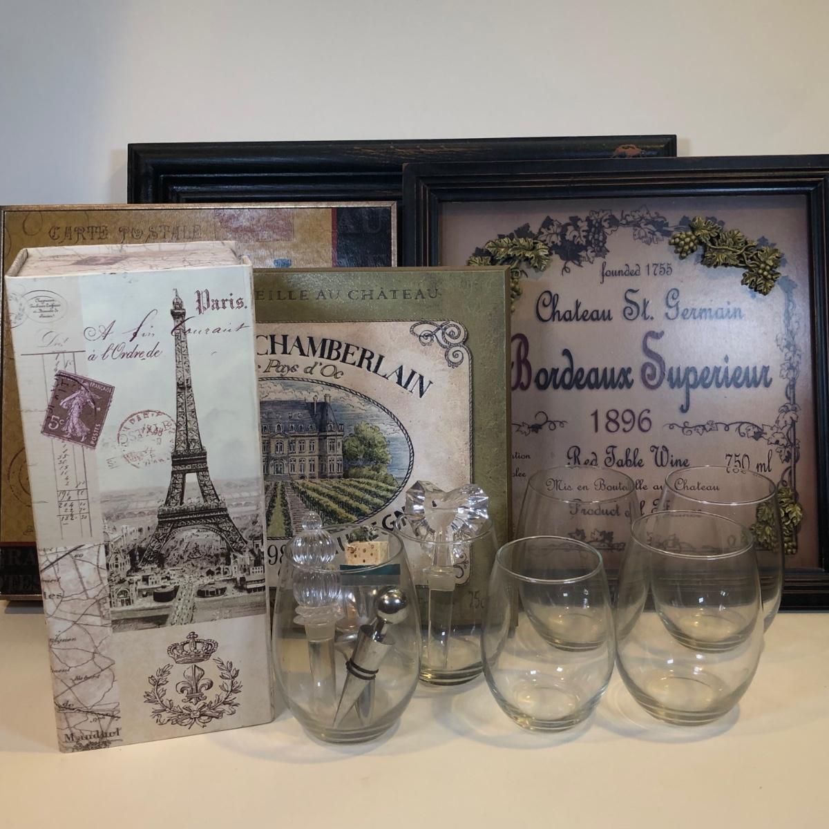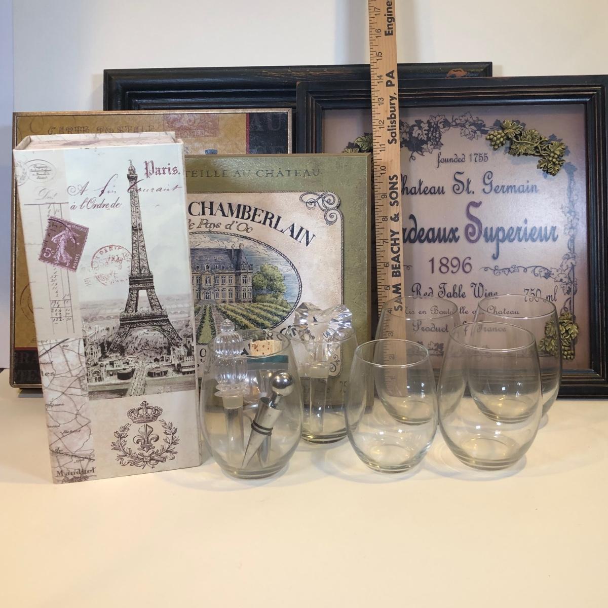 LOT 201K: French Themed Wine Decor, Stemless Wine Glasses & More