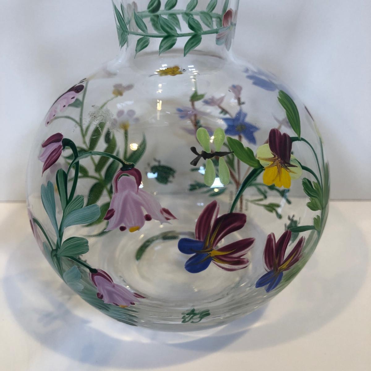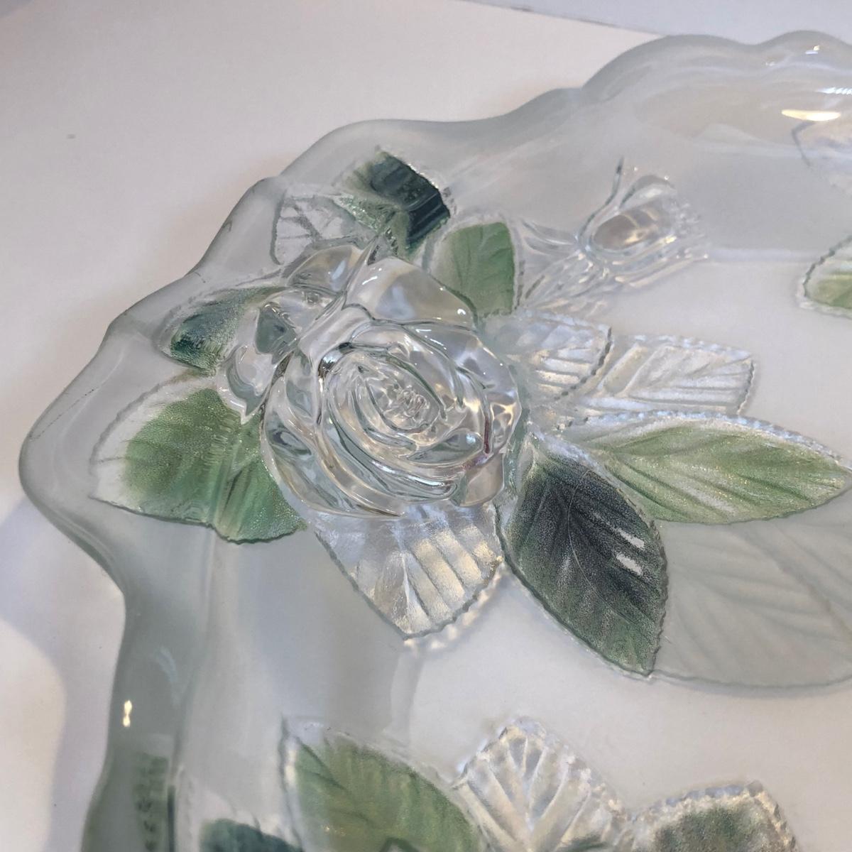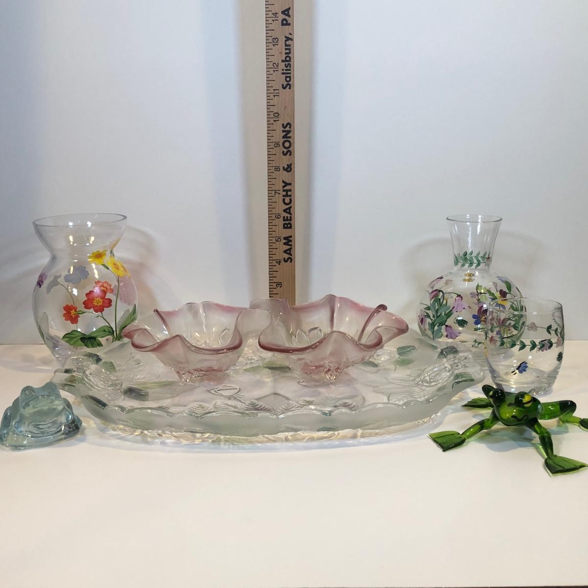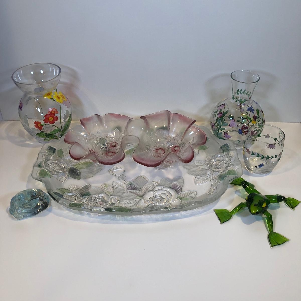 LOT 203K: Wheaton Village Glass Frog Paperweight, Godinger Floral Painted Decanter, Blown Glass Frog & Pretty Colorful Glass Floral Serving Dishes