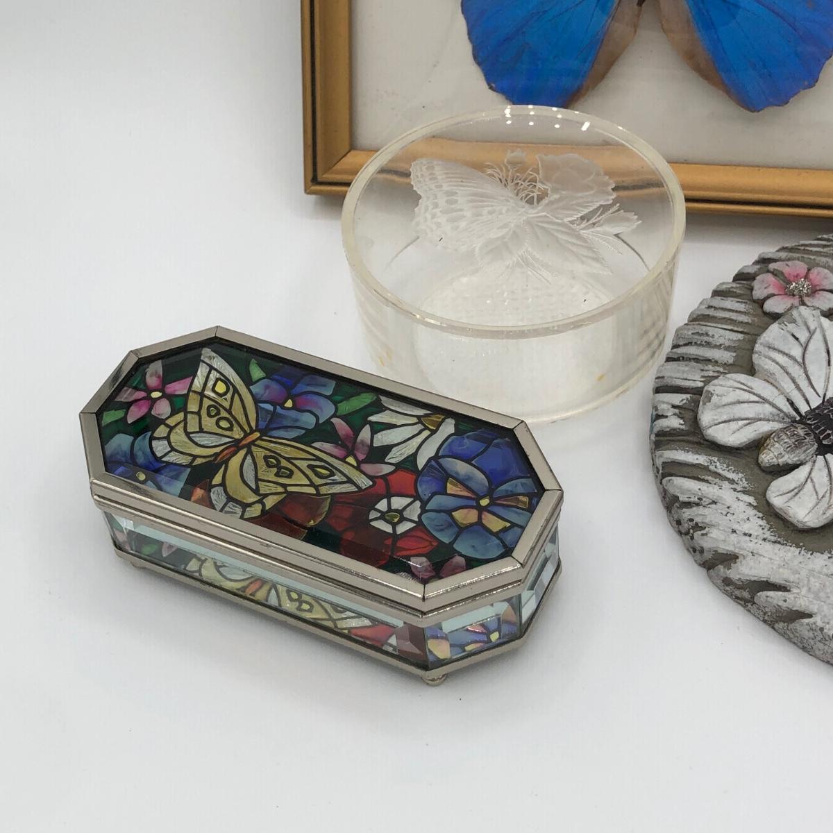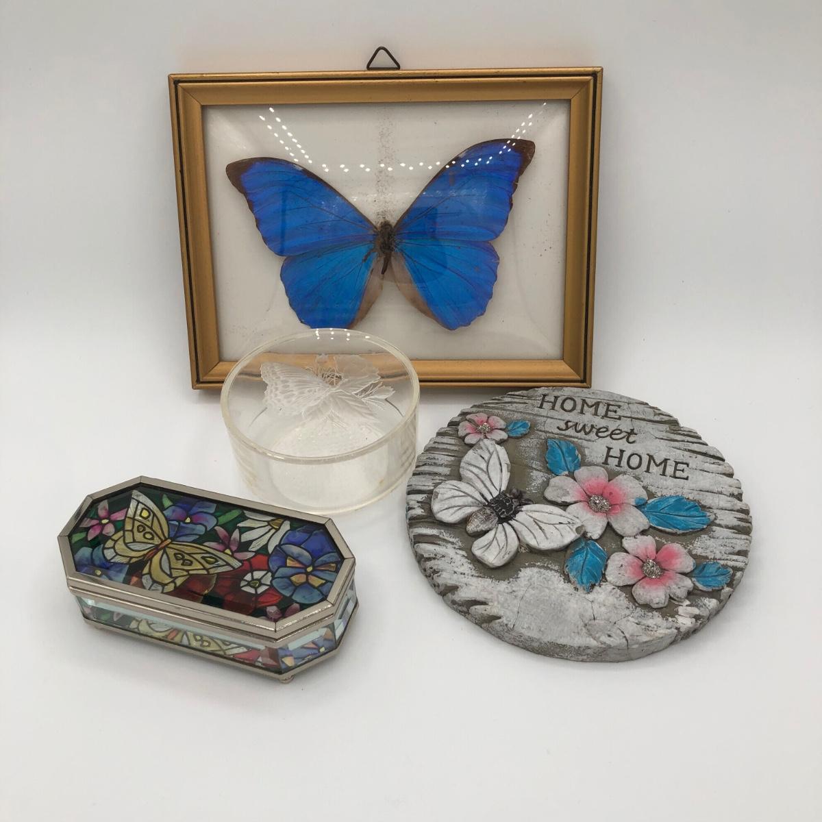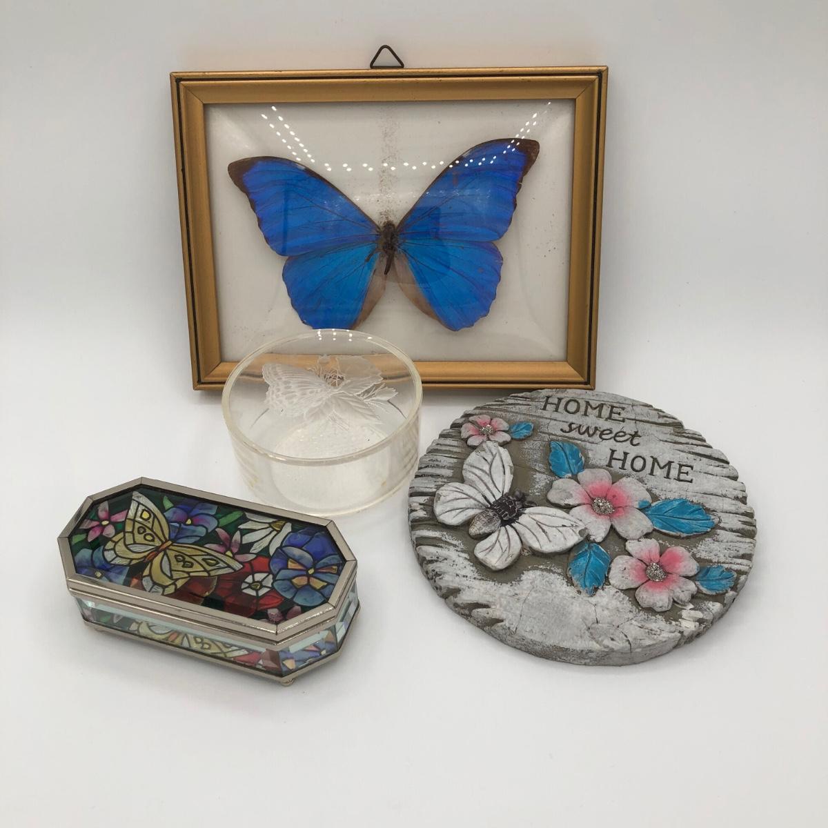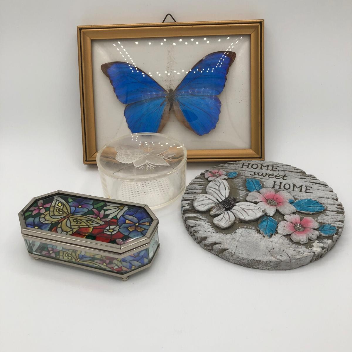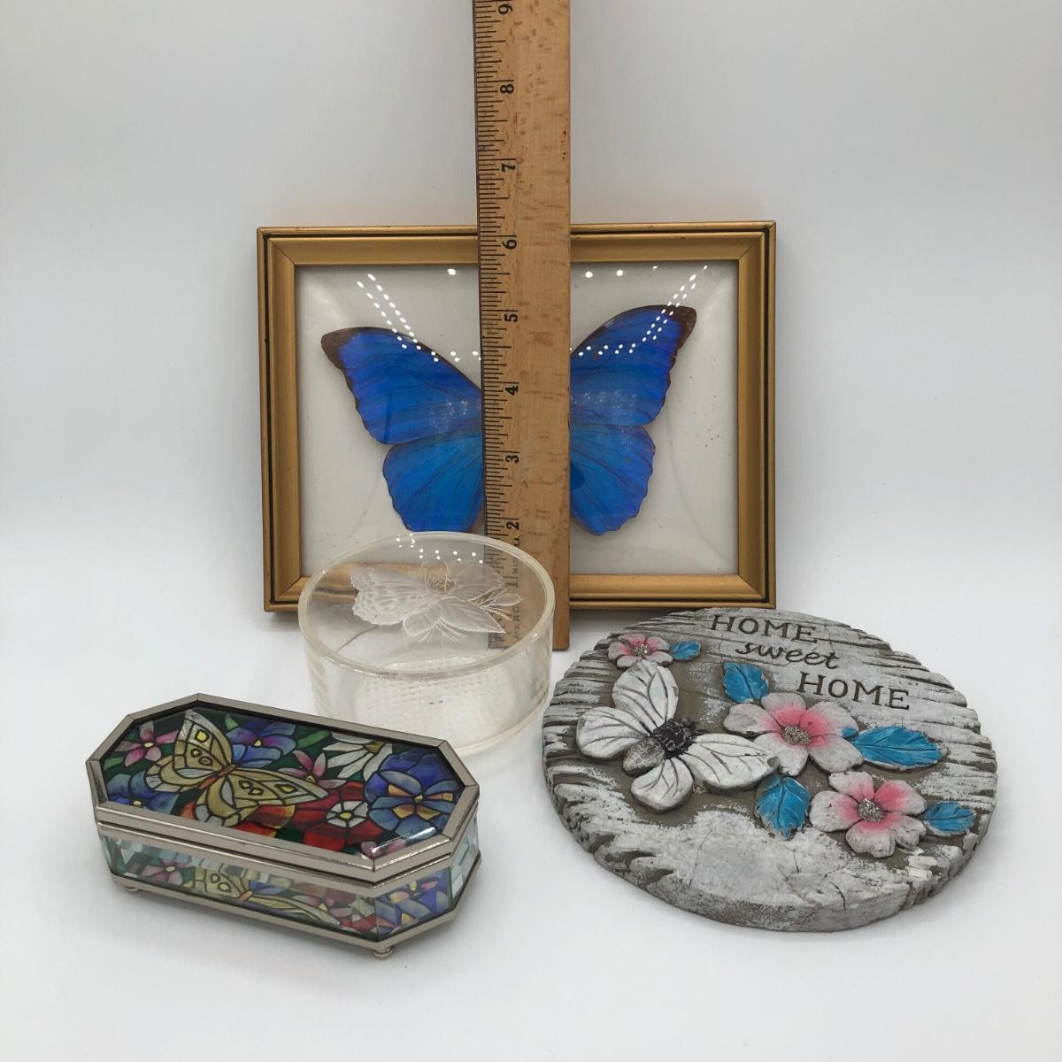 LOT 205K: Framed Morpho Didius Butterfly w/ Curved Glass, Stained Glass Butterfly Trinket Dish & More