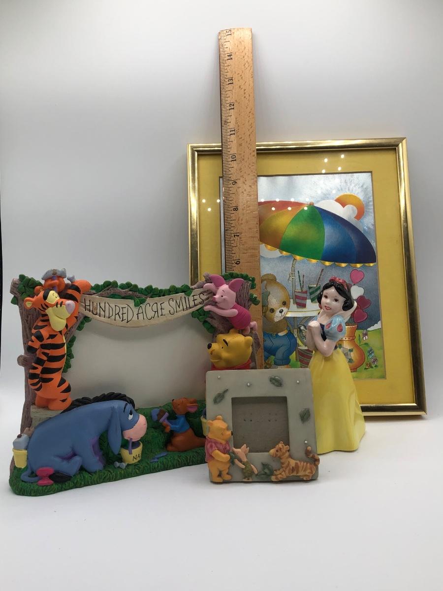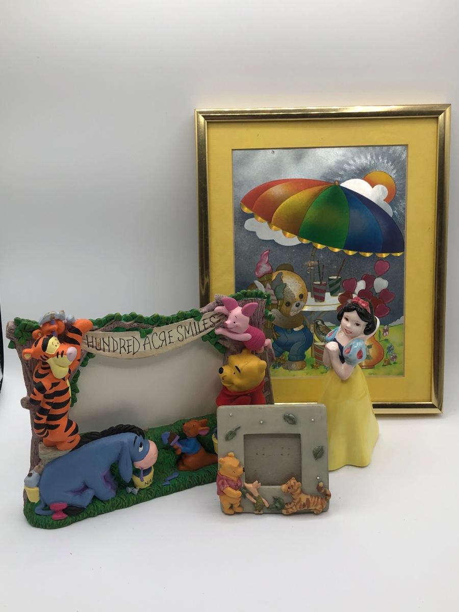 LOT 209K: Disney & More - Ceramic Snow White Figurine, Winnie the Pooh Picture Frames & Framed Foil Bear Art