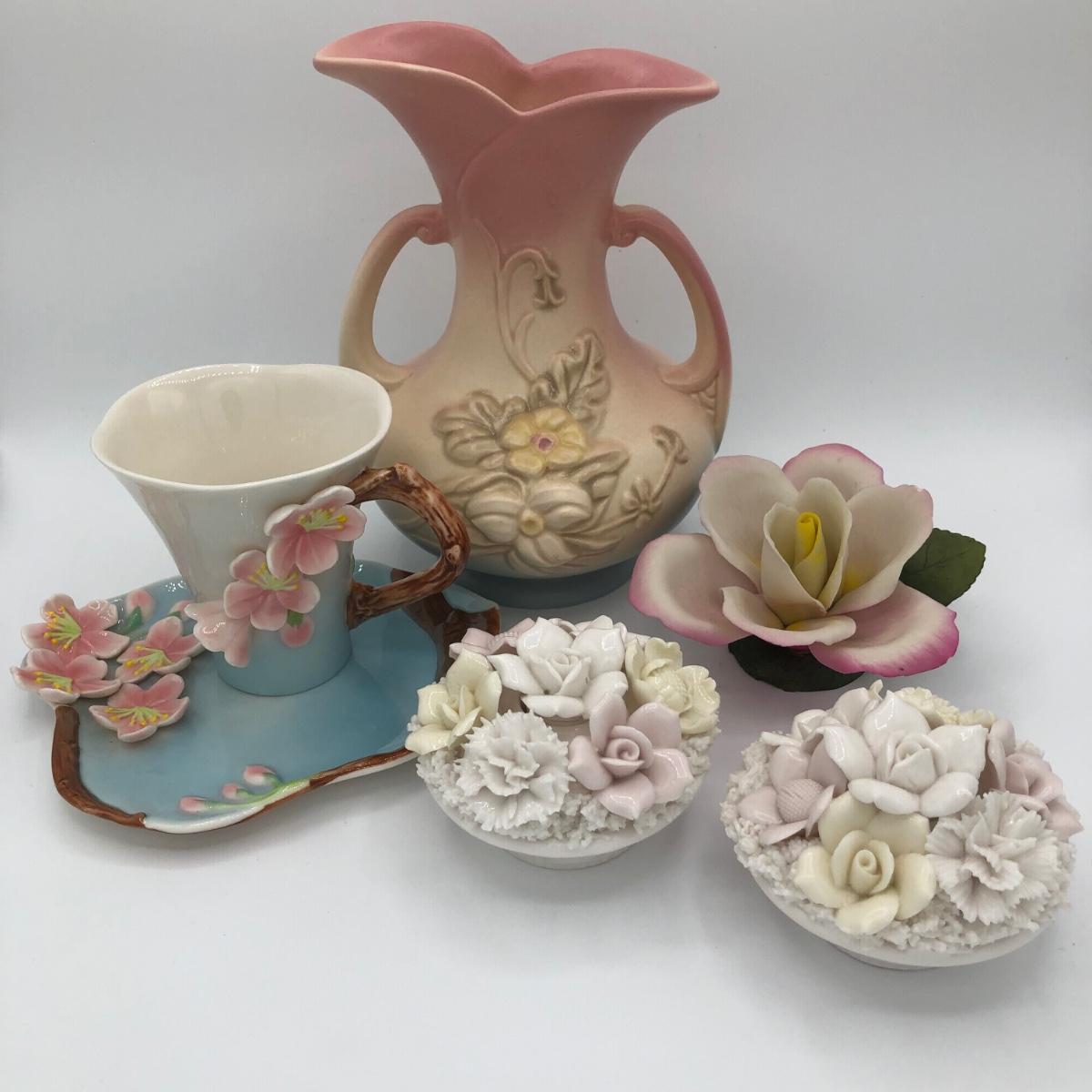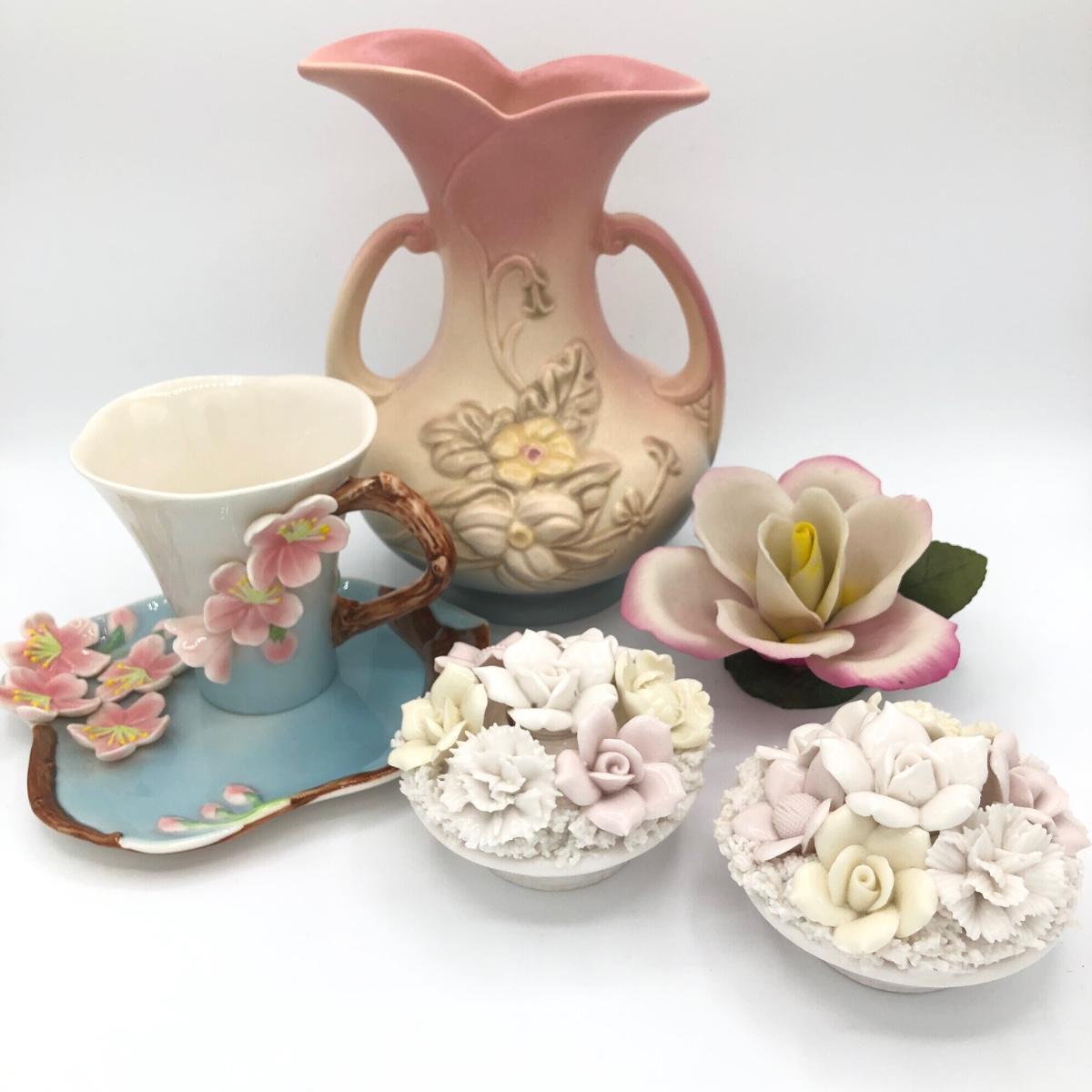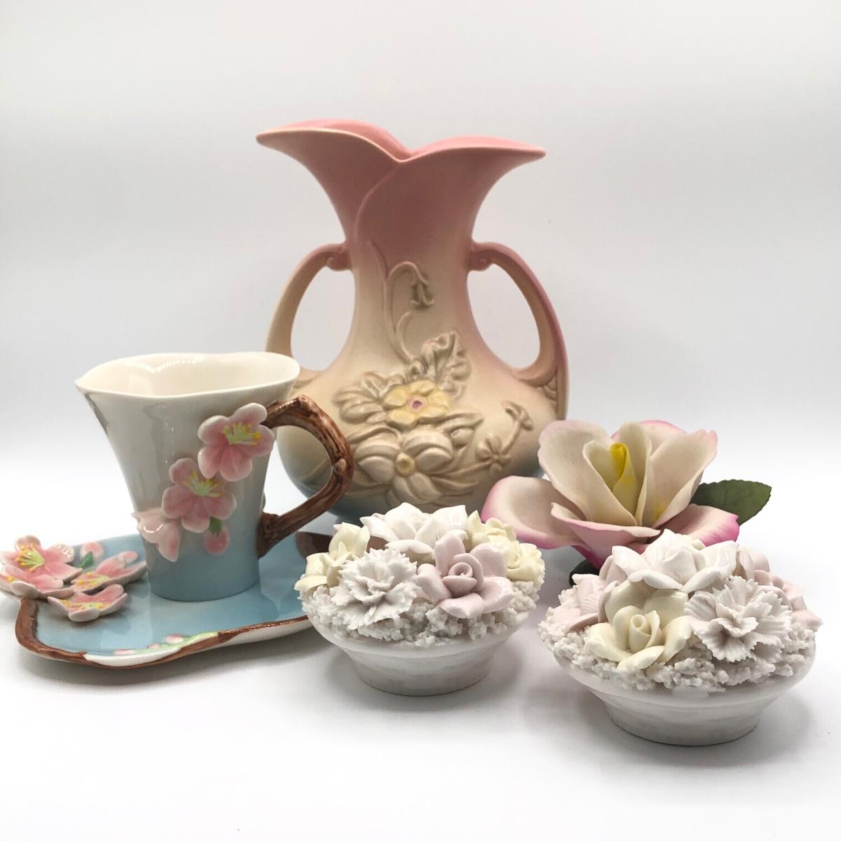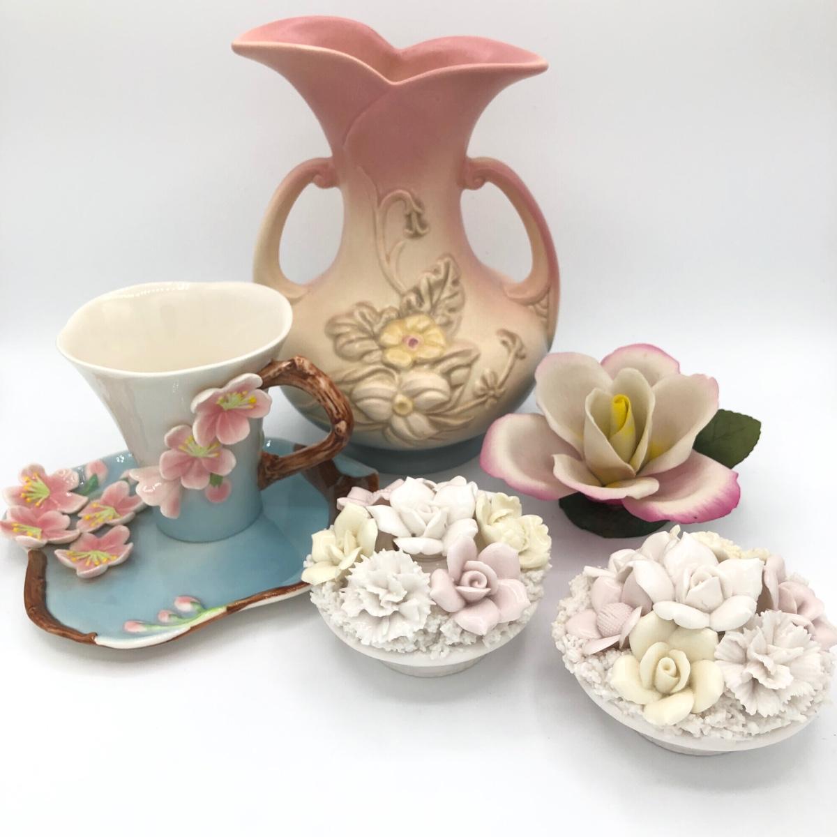 LOT 210K: Hull Art Pottery Pink Wildflower Vase W8-7 1/2, Napoleon Italy Porcelain Flower, Two's Company Porcelain Cherry Blossom Tea Cup / Saucer & Ardalt Lenwile China Flower Baskets