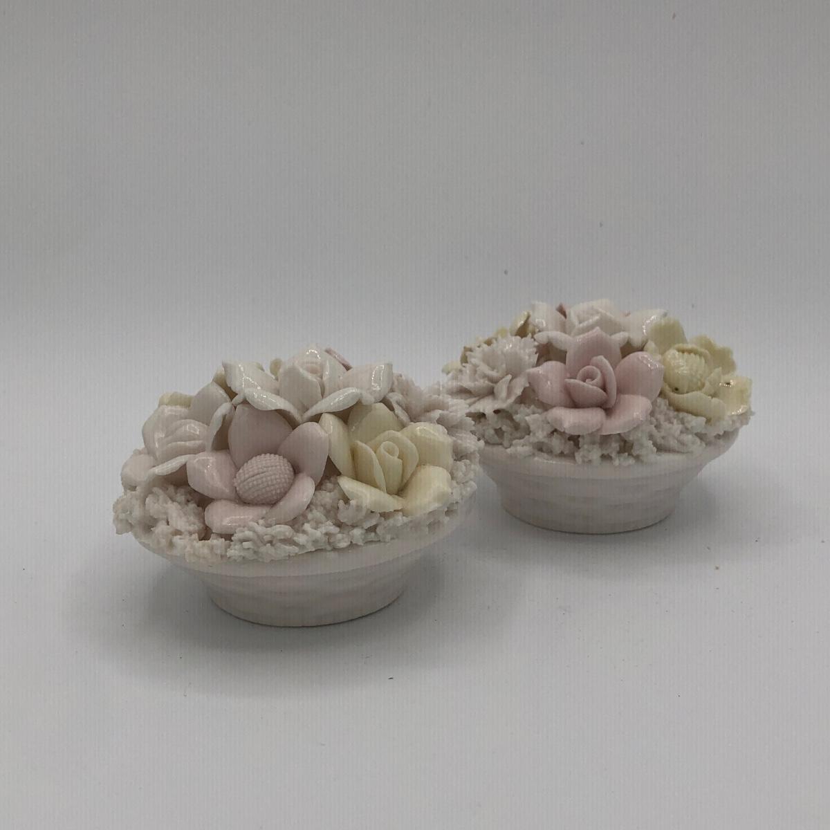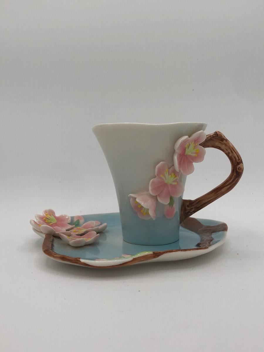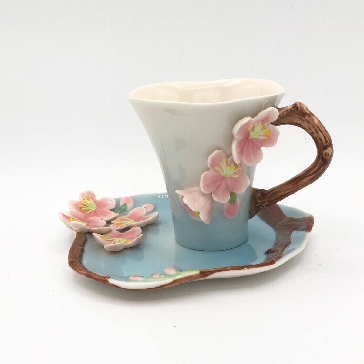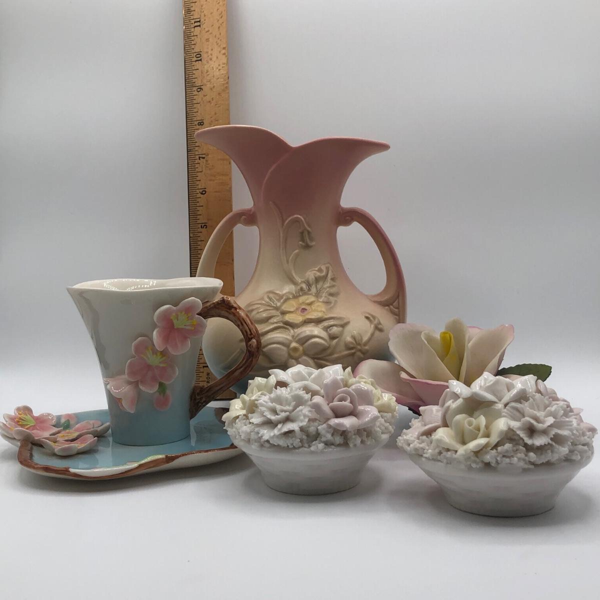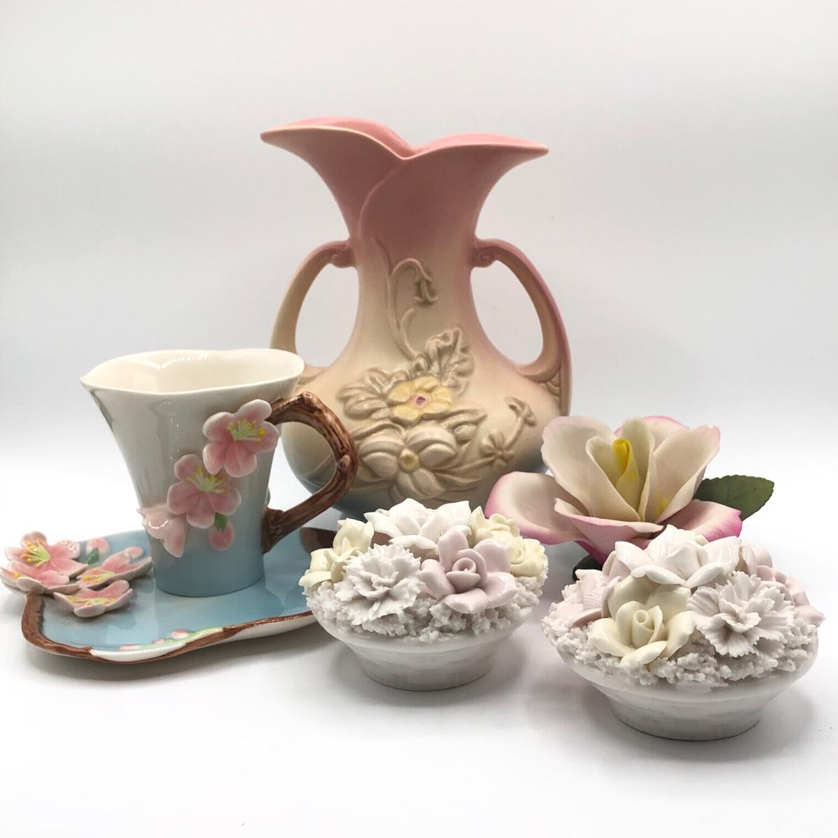 LOT 210K: Hull Art Pottery Pink Wildflower Vase W8-7 1/2, Napoleon Italy Porcelain Flower, Two's Company Porcelain Cherry Blossom Tea Cup / Saucer & Ardalt Lenwile China Flower Baskets