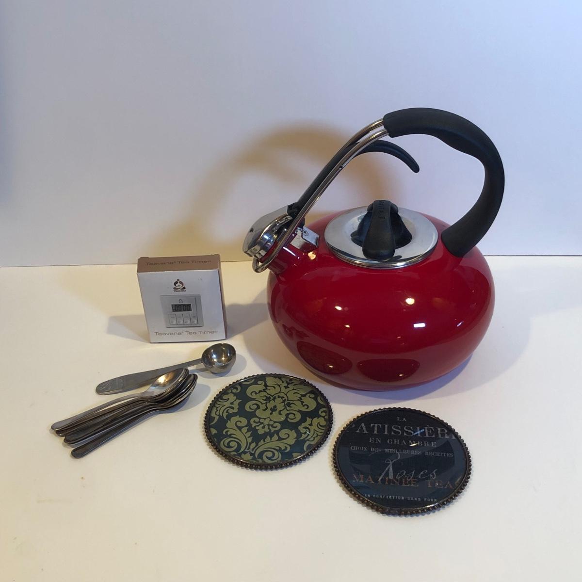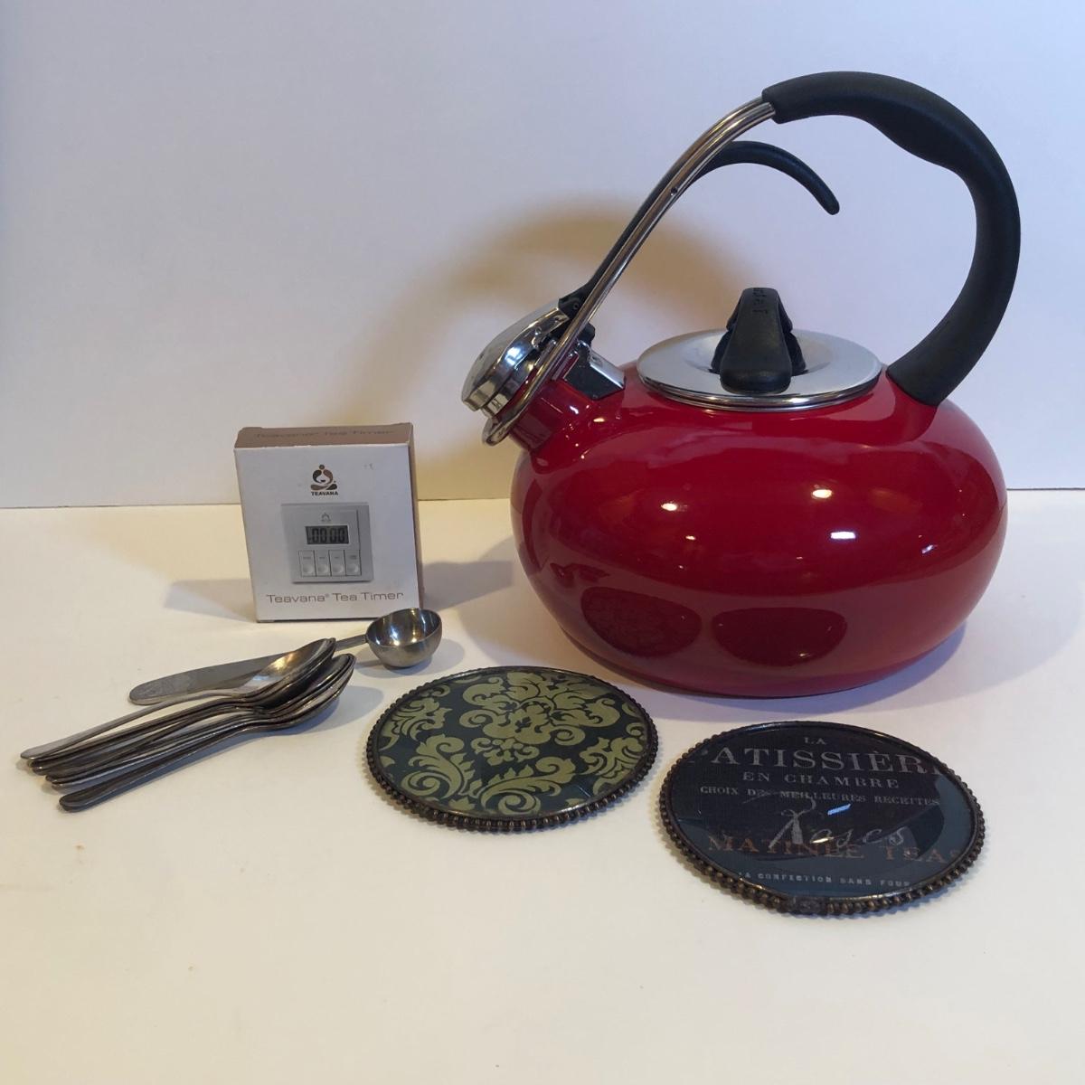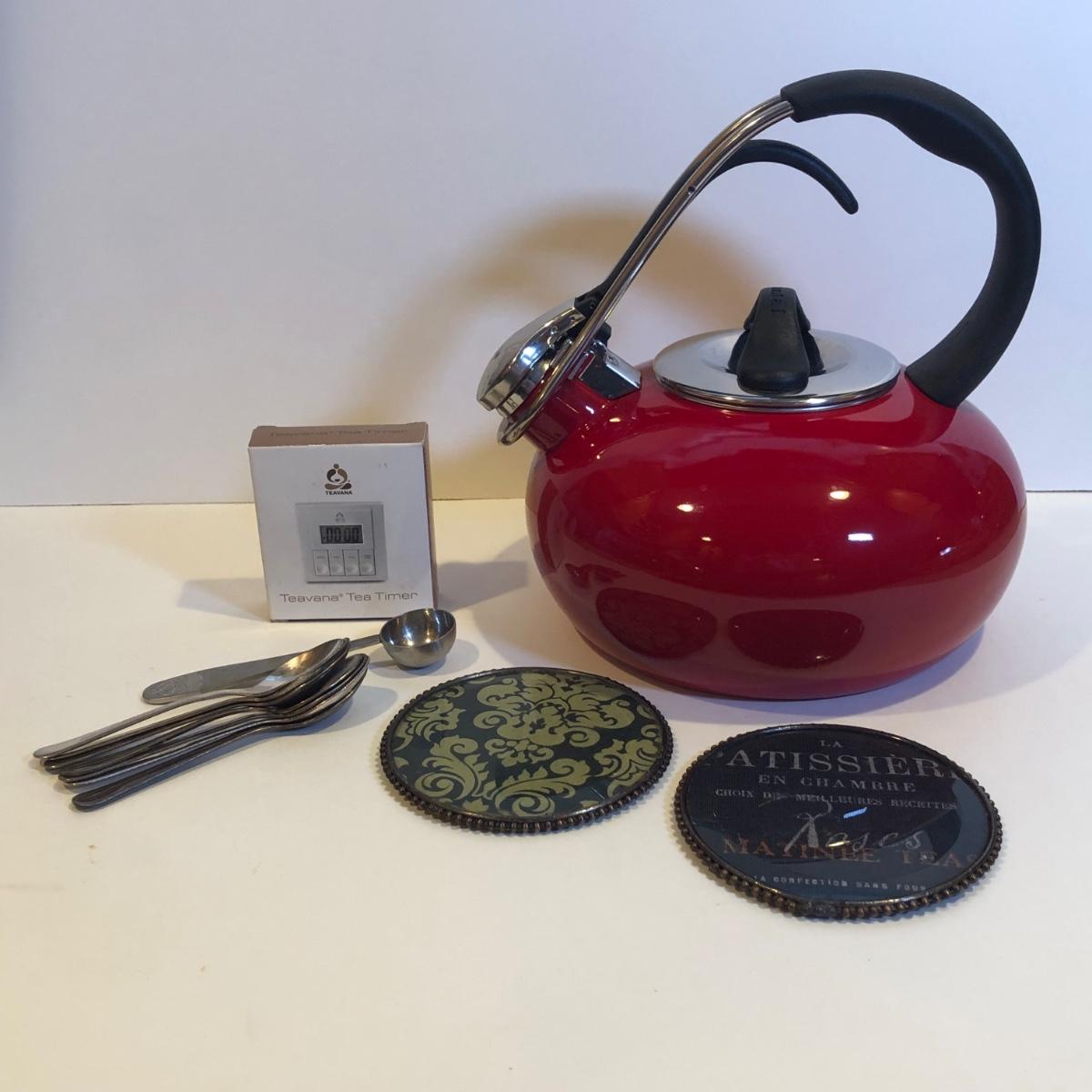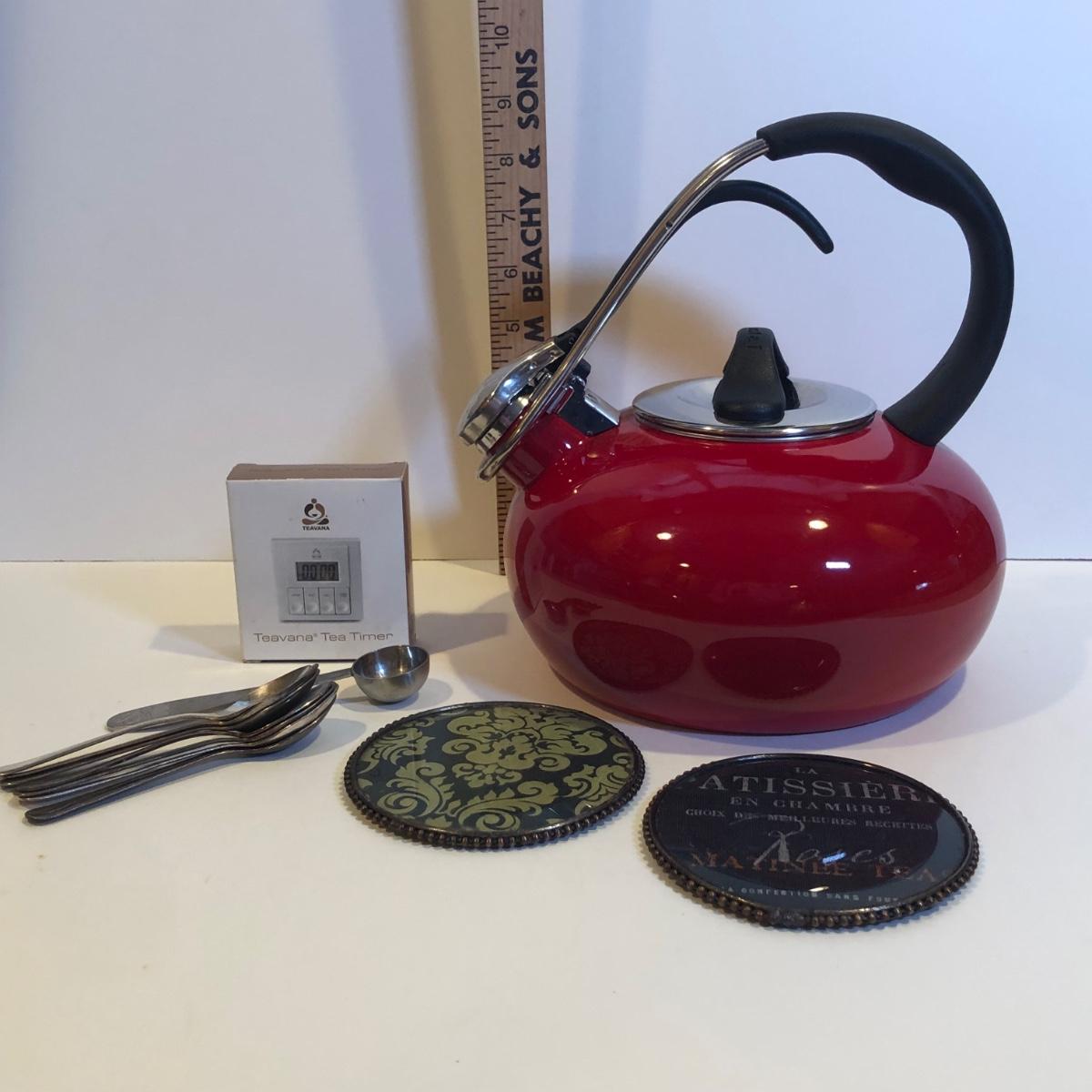 LOT 266K: Tea Time! Teavanna Digital Tea Timer, Fringe Studio Coasters, Red Chantal Kettle & More