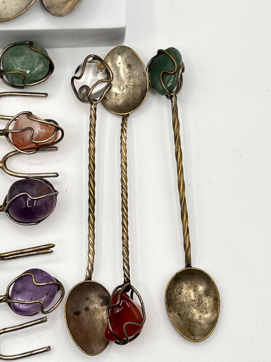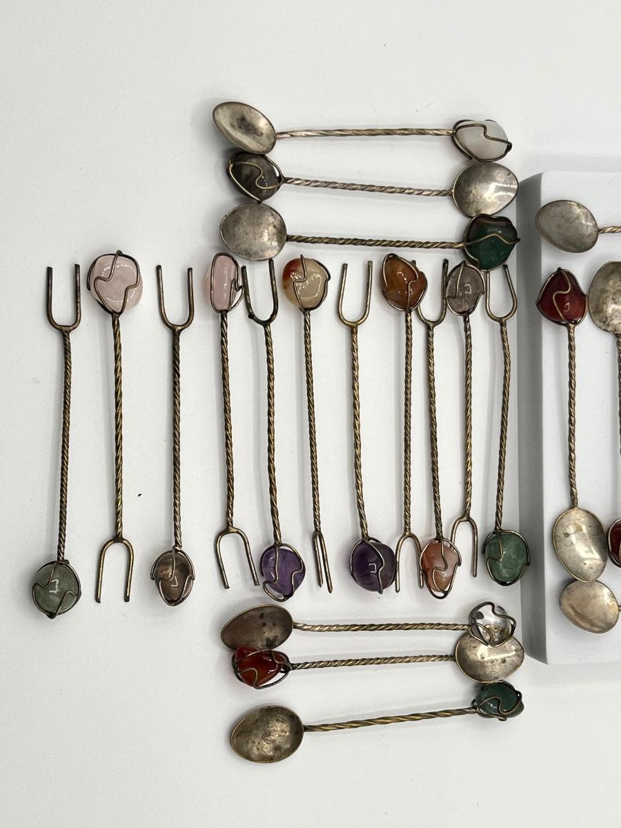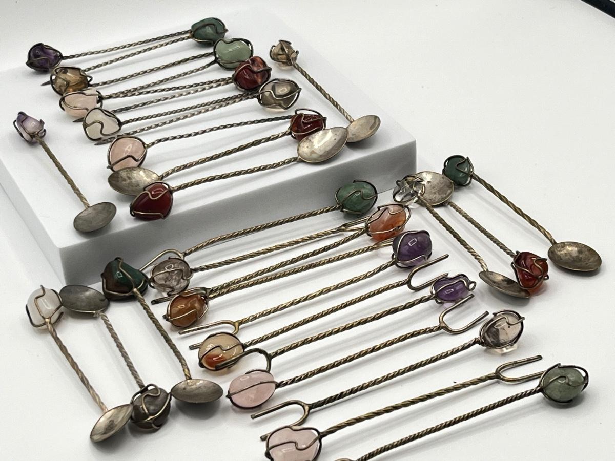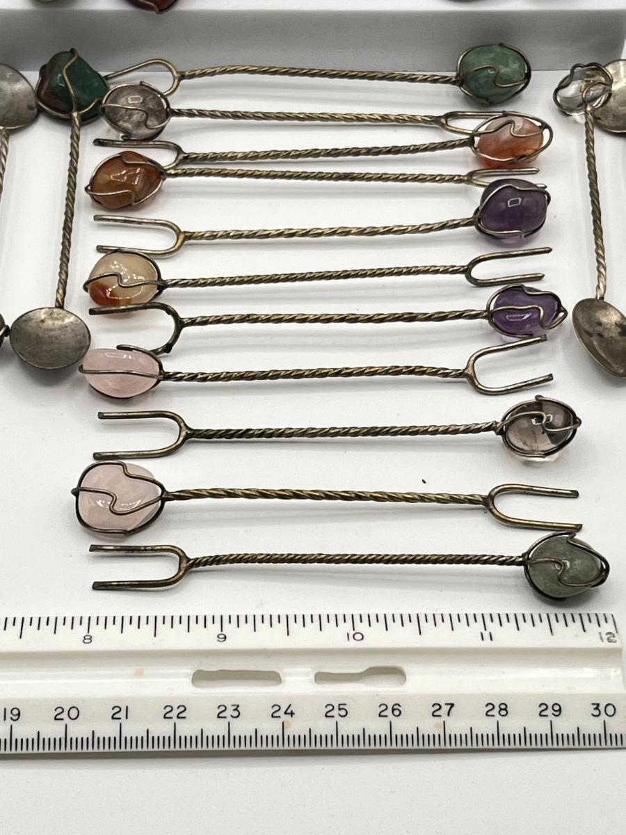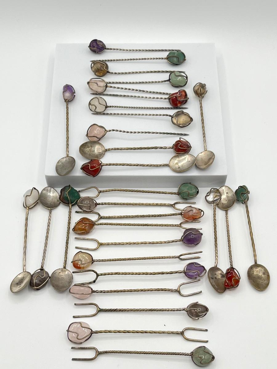 LOT 284J: Vintage Cocktail/Appetizer Picks, Forks, Spoons with Semi-Precious Stones