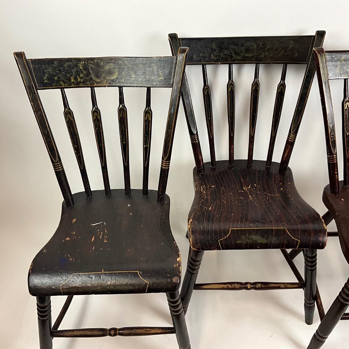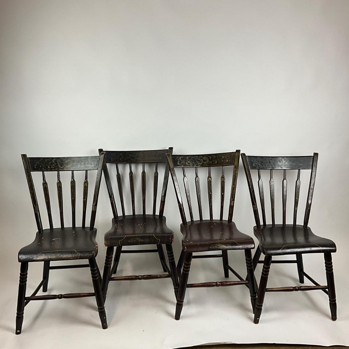 Set of four Hitchcock style plank bottom dining side chairs with ebony finish and faded gold painted decoration. Measure 18"W, 15"D, 33"H, Seat 16.5"H