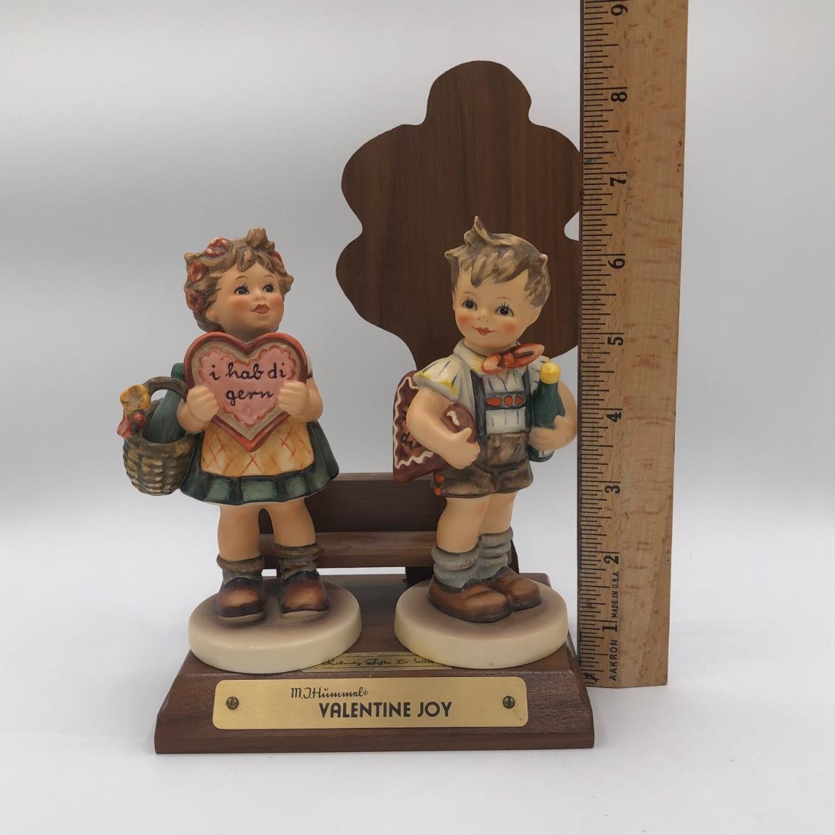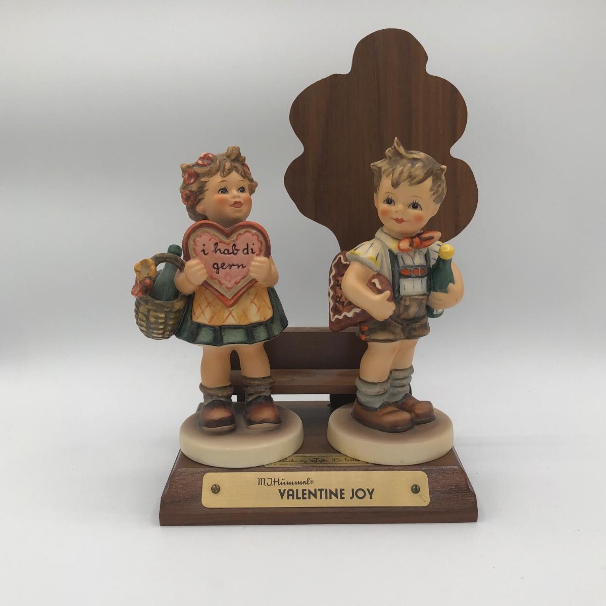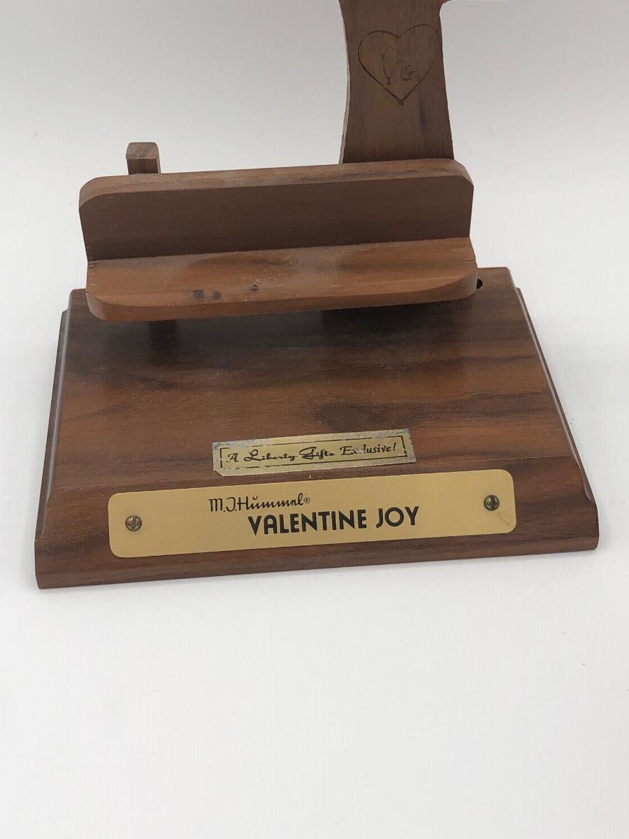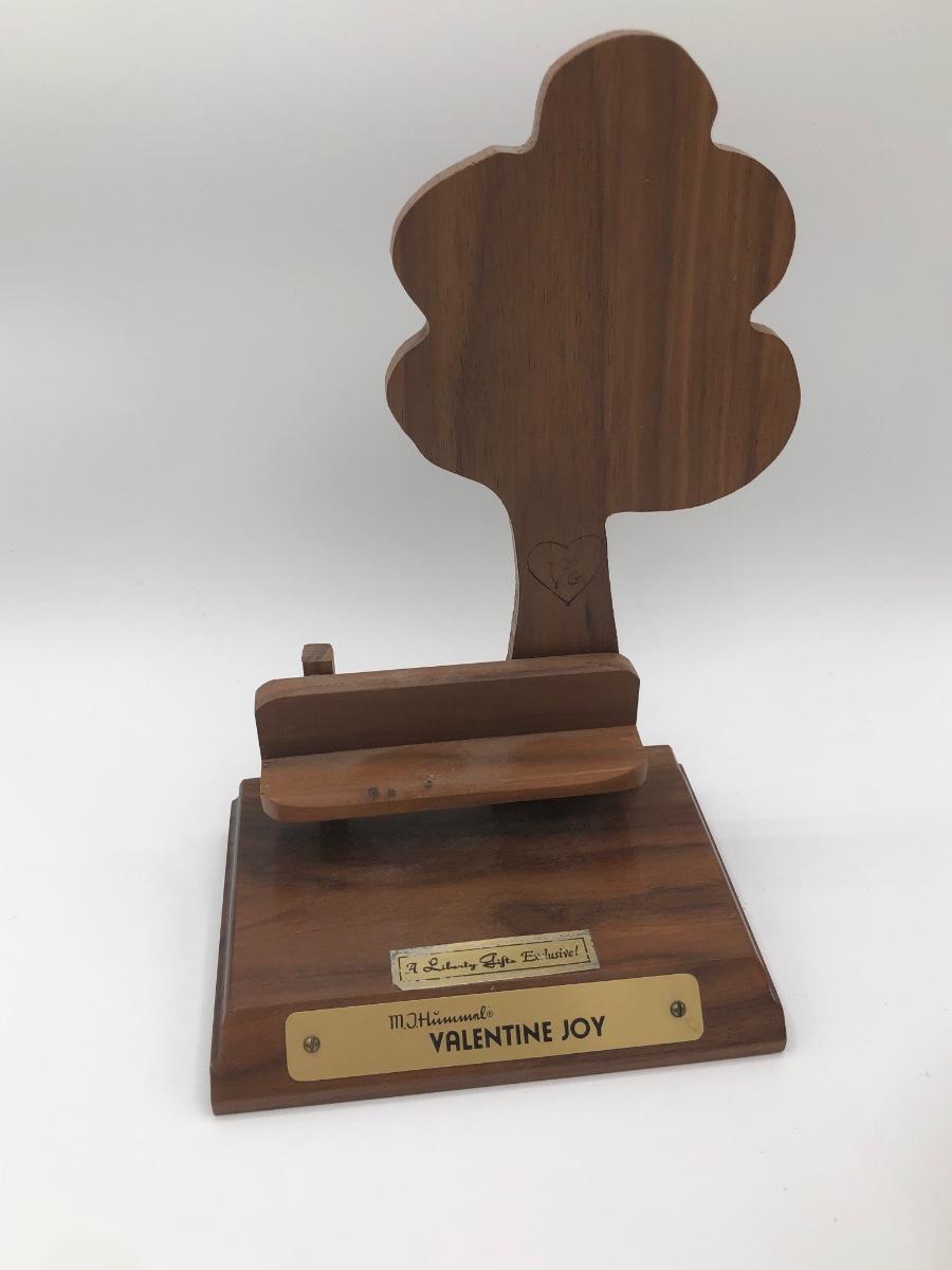 LOT 20D: Vintage 1970s Goebel Collectors Club M.I. Hummel Figurines w/ Wooden Liberty Gifts Display Stand - No 4 "Valentine Joy 399 & No 1 "Valentine Gift" 387