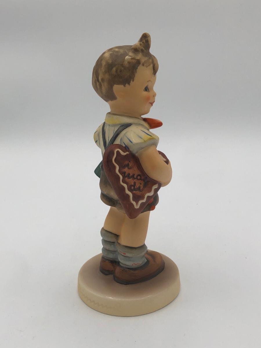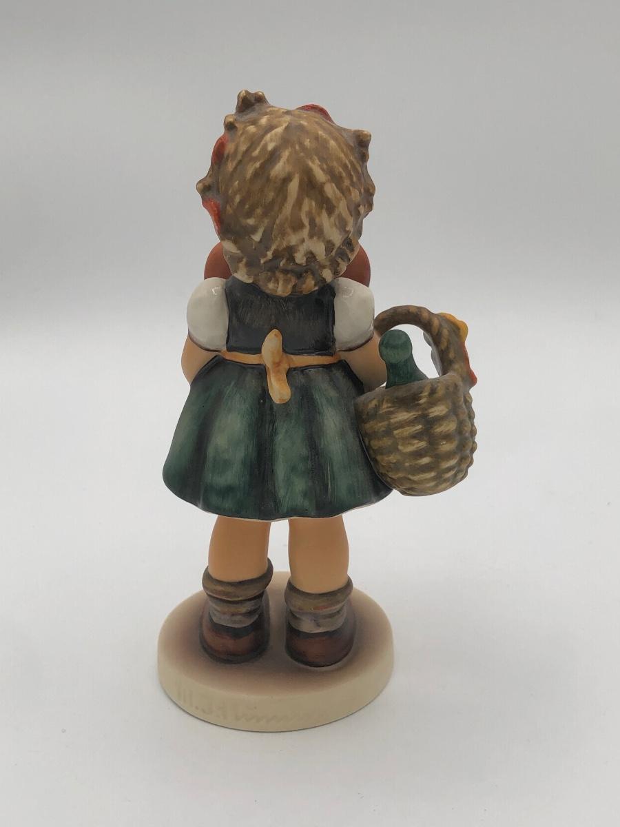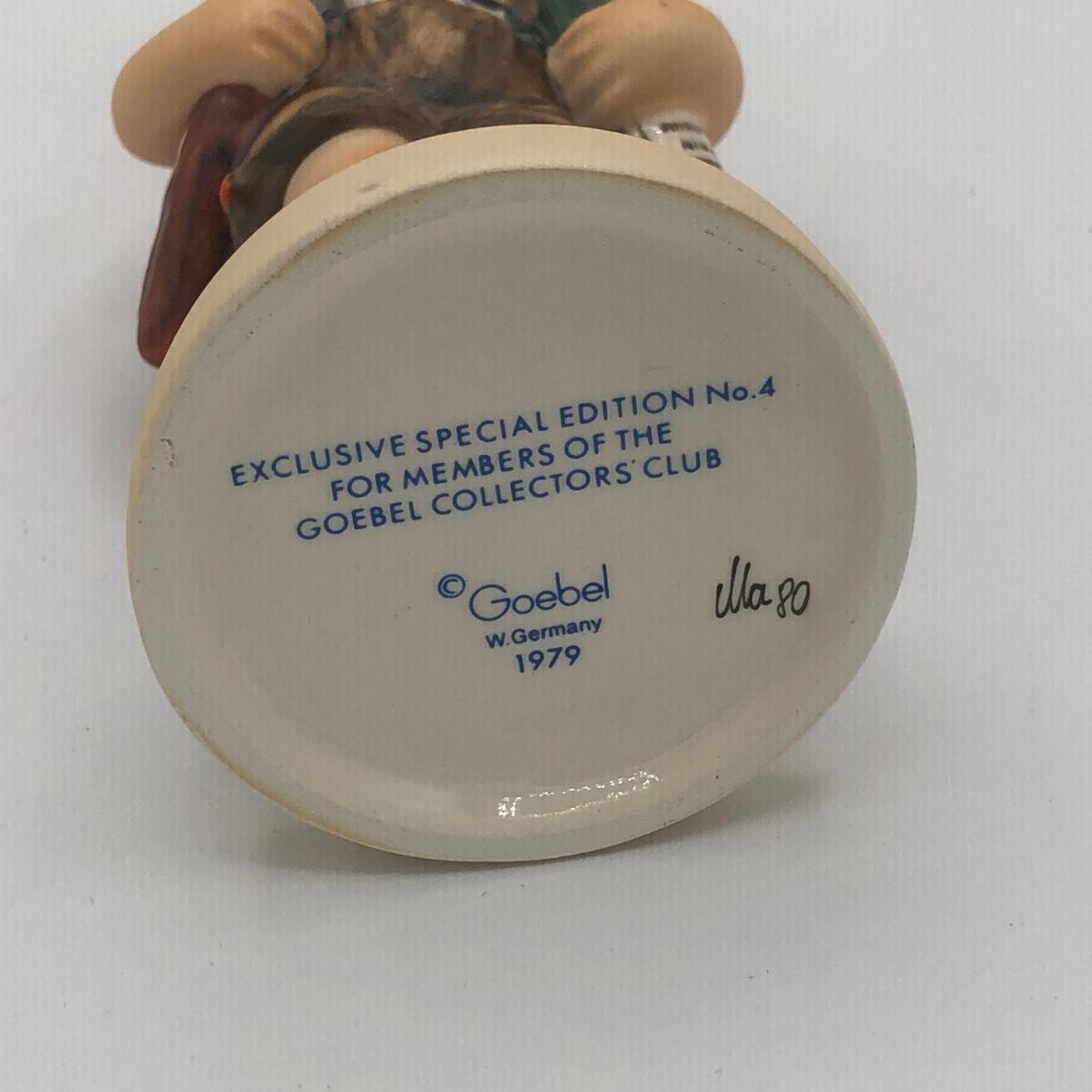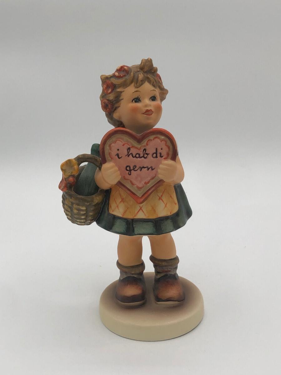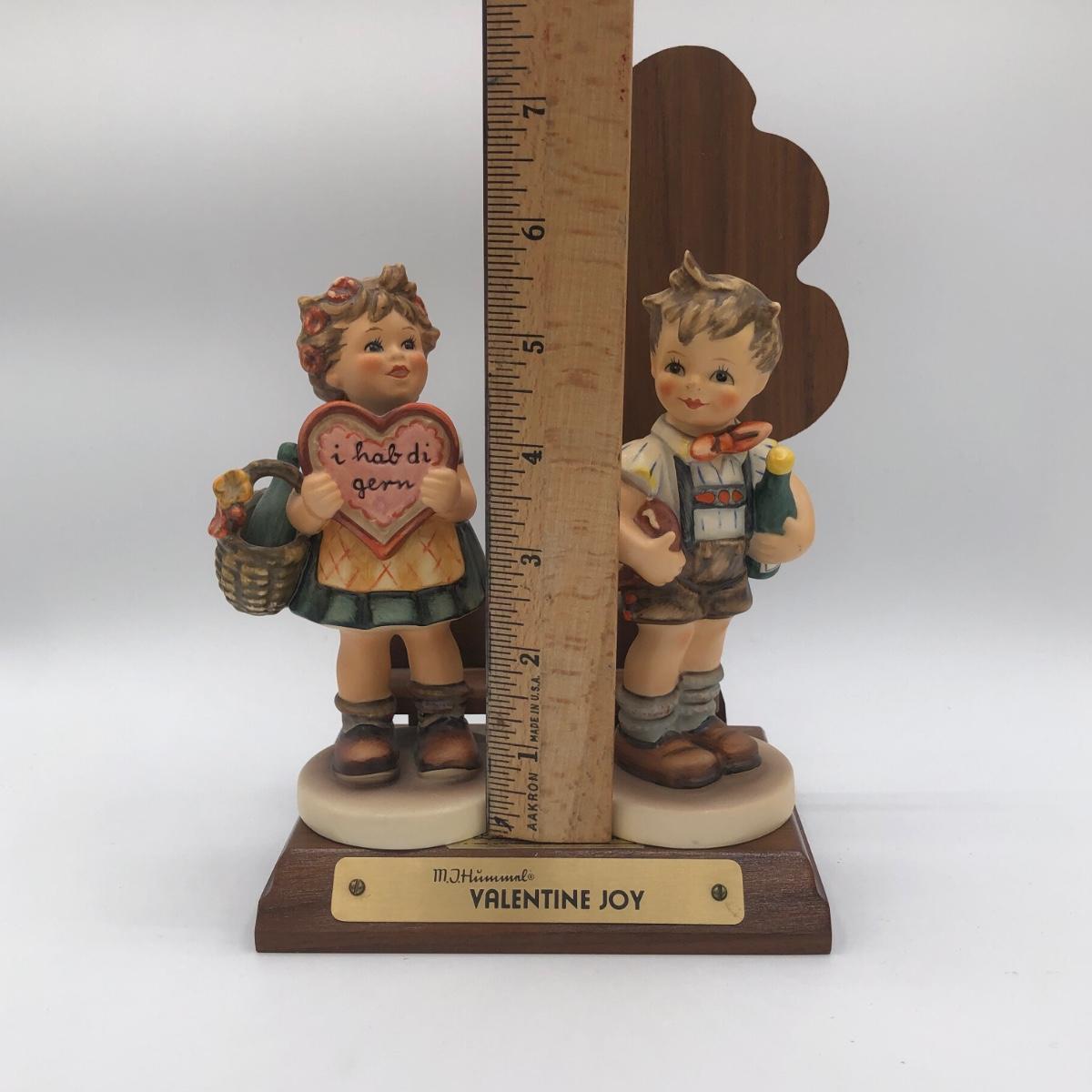 LOT 20D: Vintage 1970s Goebel Collectors Club M.I. Hummel Figurines w/ Wooden Liberty Gifts Display Stand - No 4 "Valentine Joy 399 & No 1 "Valentine Gift" 387