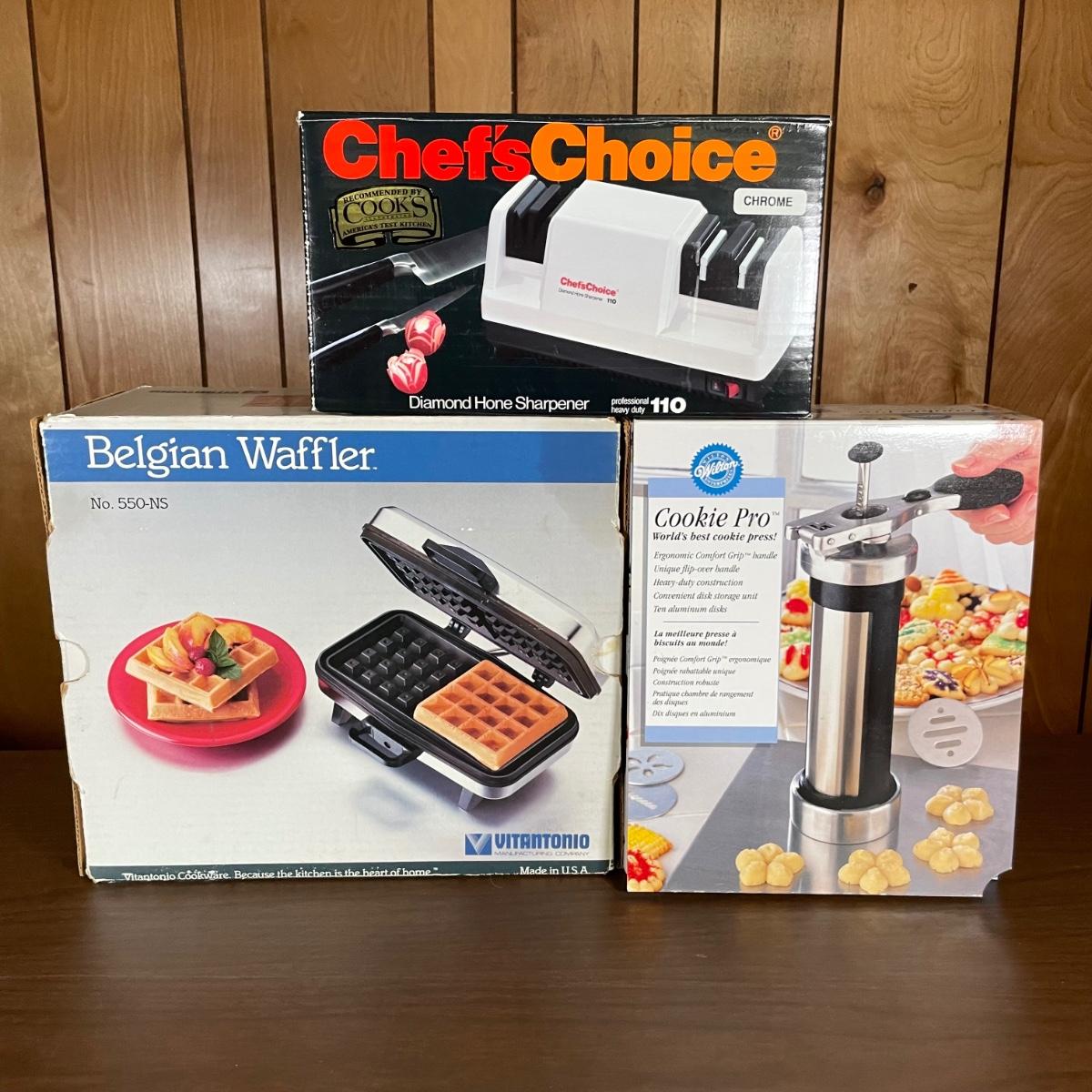 LOT 57B: Chefs Choice Diamond Hone Sharpener, Wilton Cookie Press & Vitantonio Belgian Waffle Maker w/ Boxes