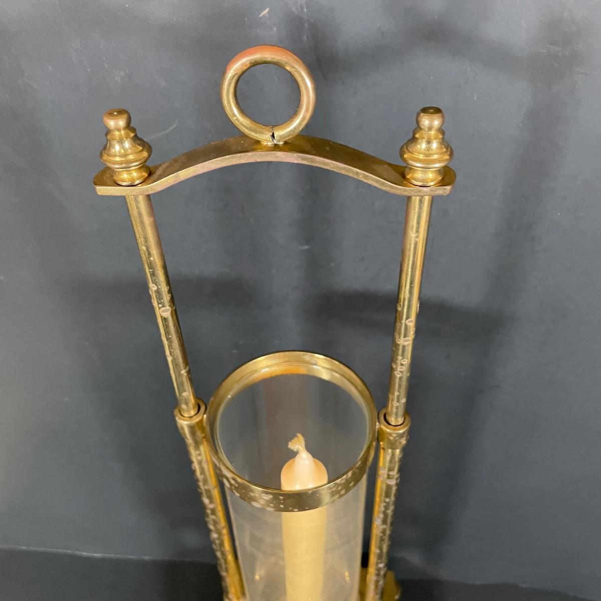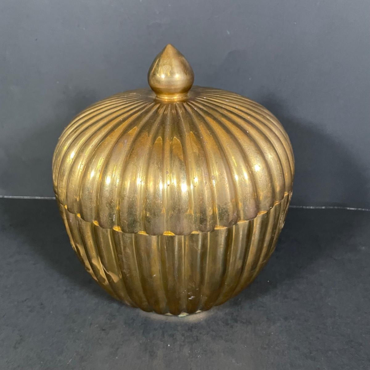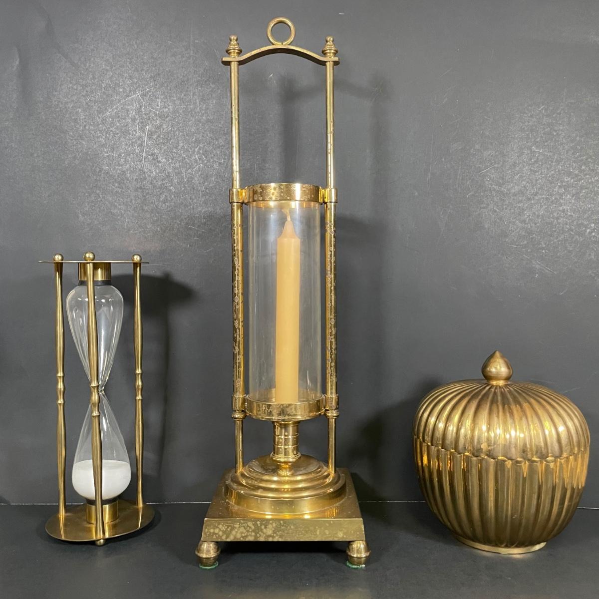 LOT 69B: Vintage Brass Home Decor Collection - Mid-Century Solid Brass Fluted Lidded Cachepot, Hour Glass & Lantern