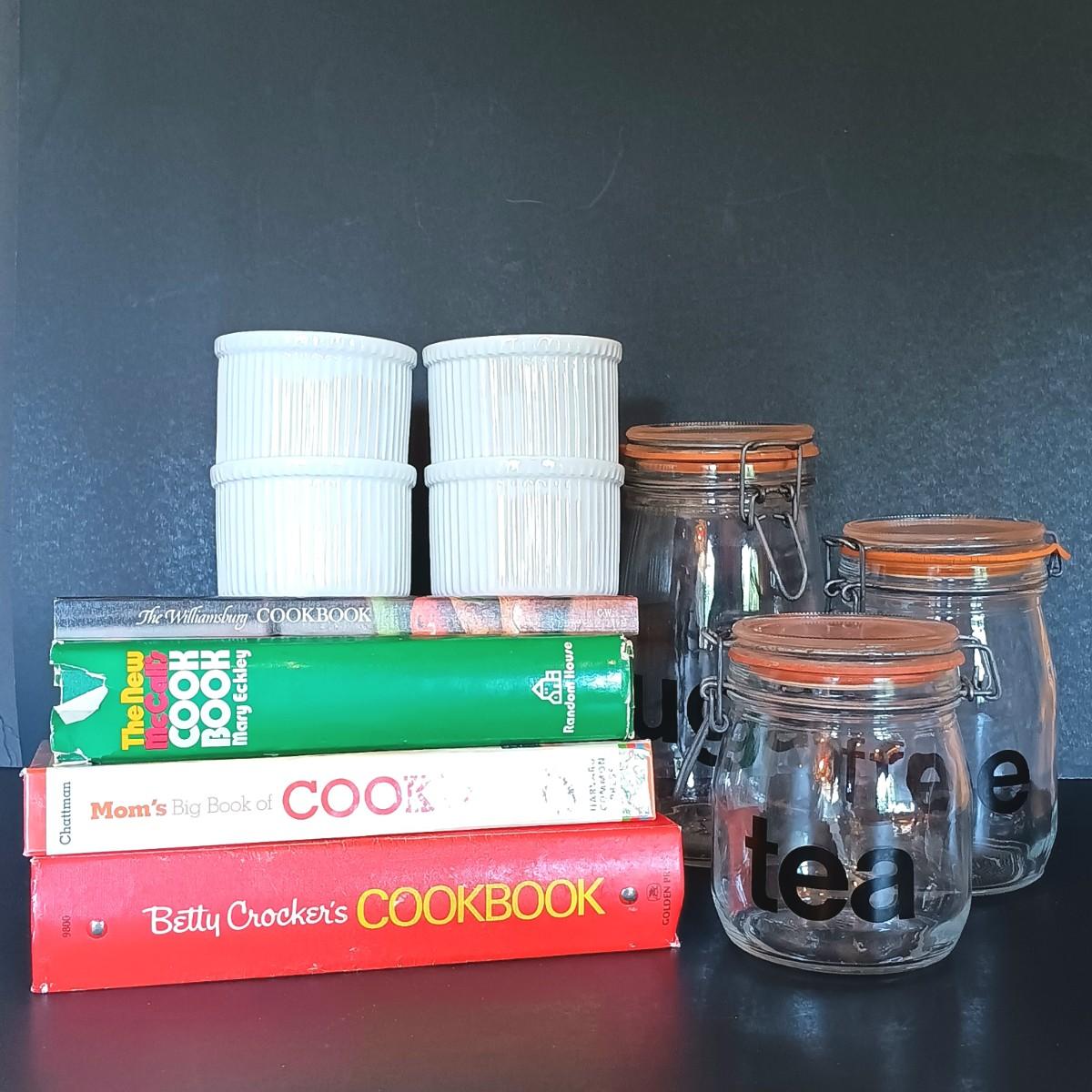 LOT 87K: Vintage Triomphe Glass Canisters w/ Apilco Soufflé Dishes & Cookbooks