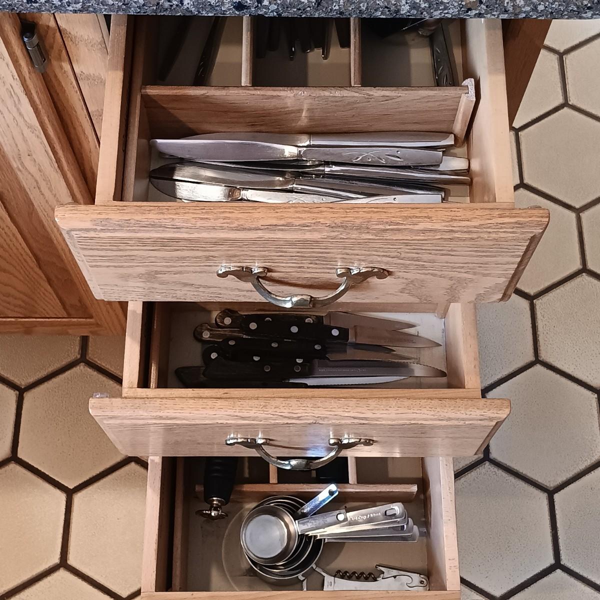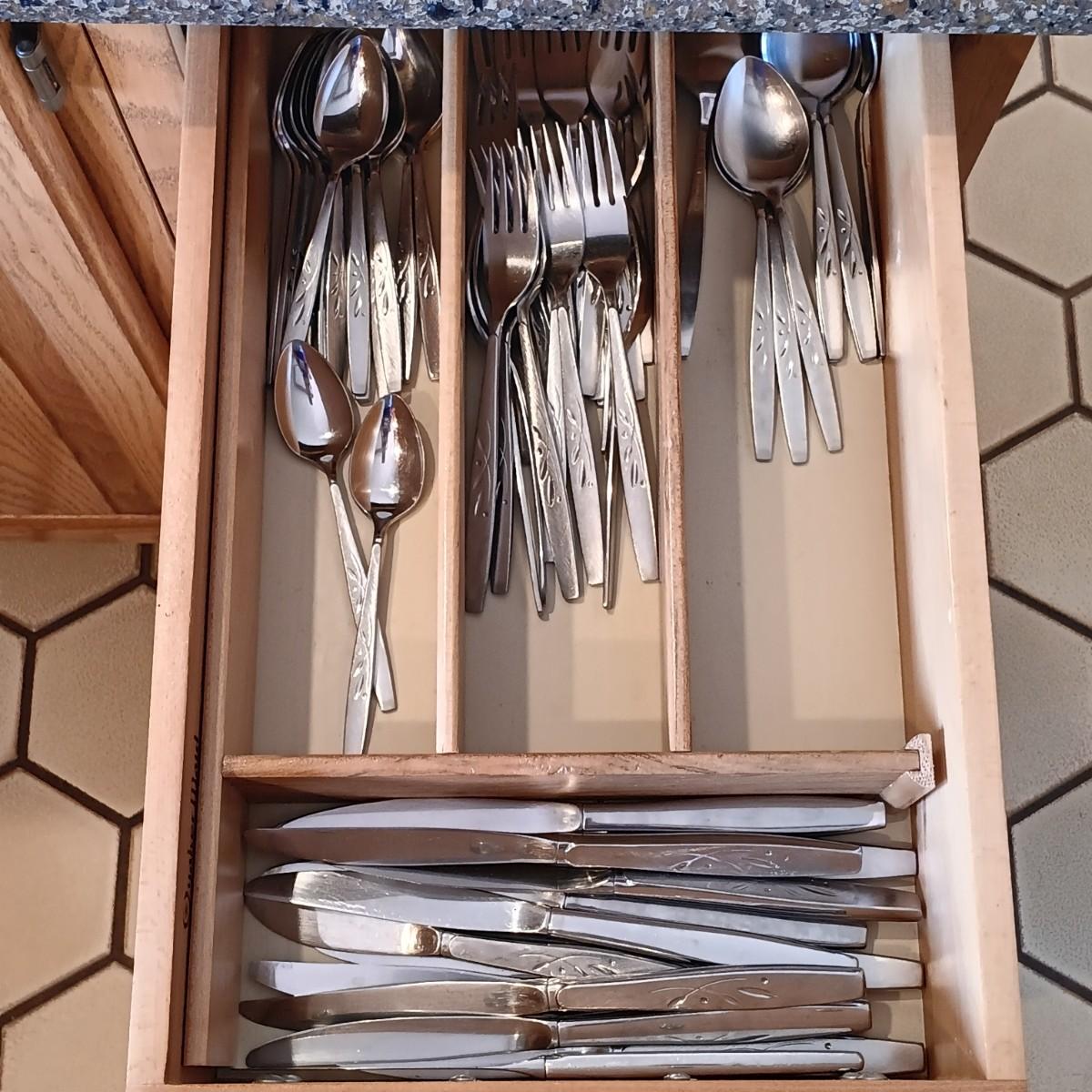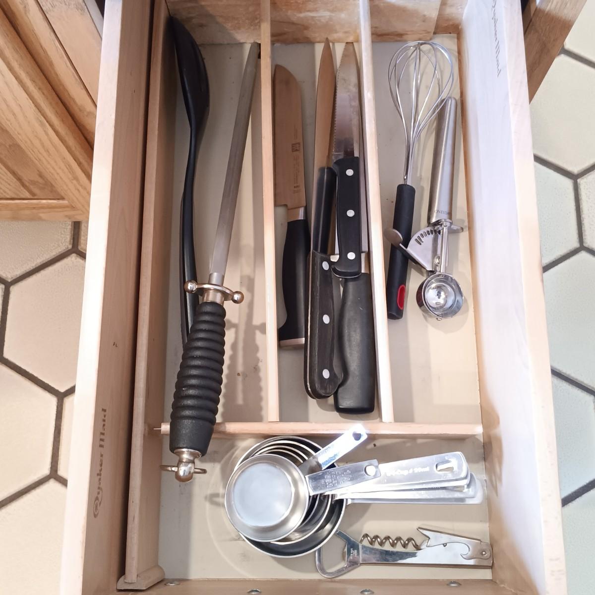 LOT 88K: Oneida 'Will 'O' Wisp' Stainless Steel Cutlery w/ Ekco Flint and Henckels Knives, William-Sonoma Measuring Cups & More