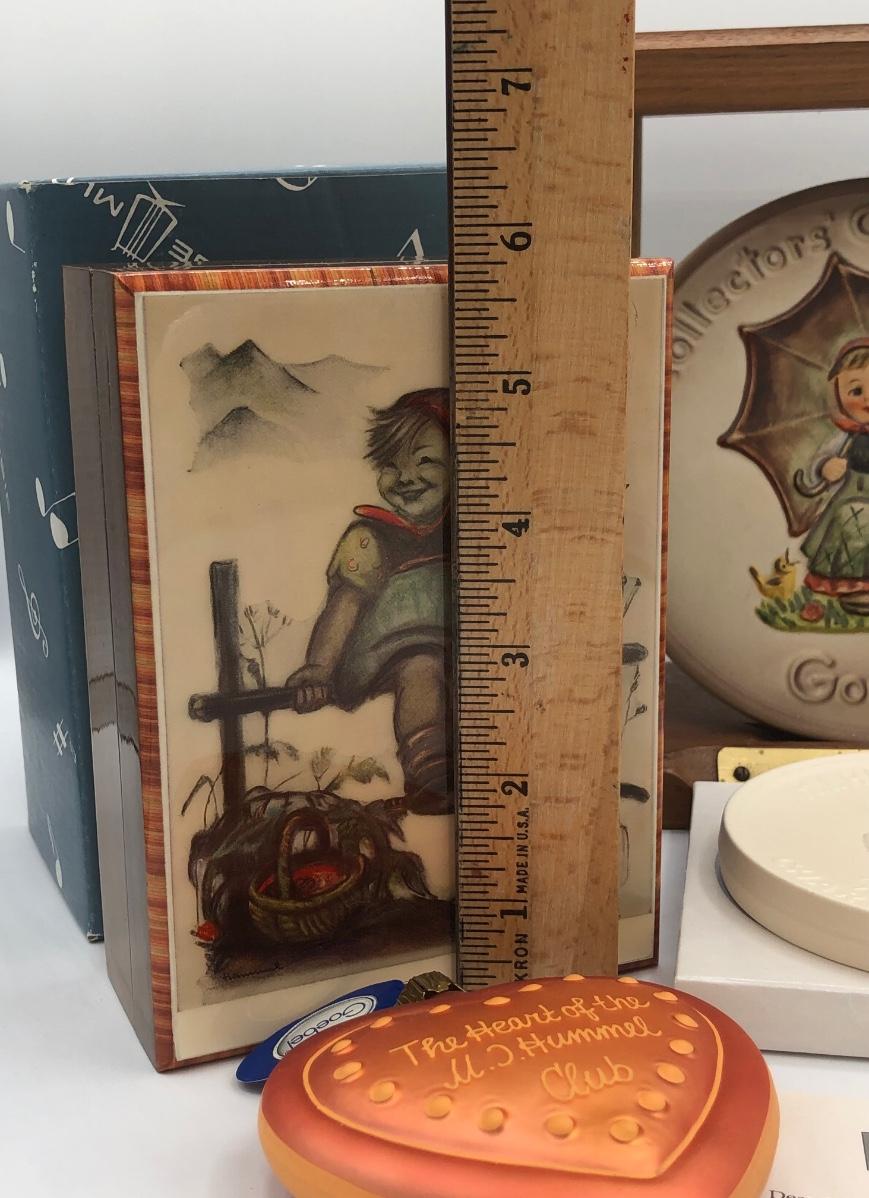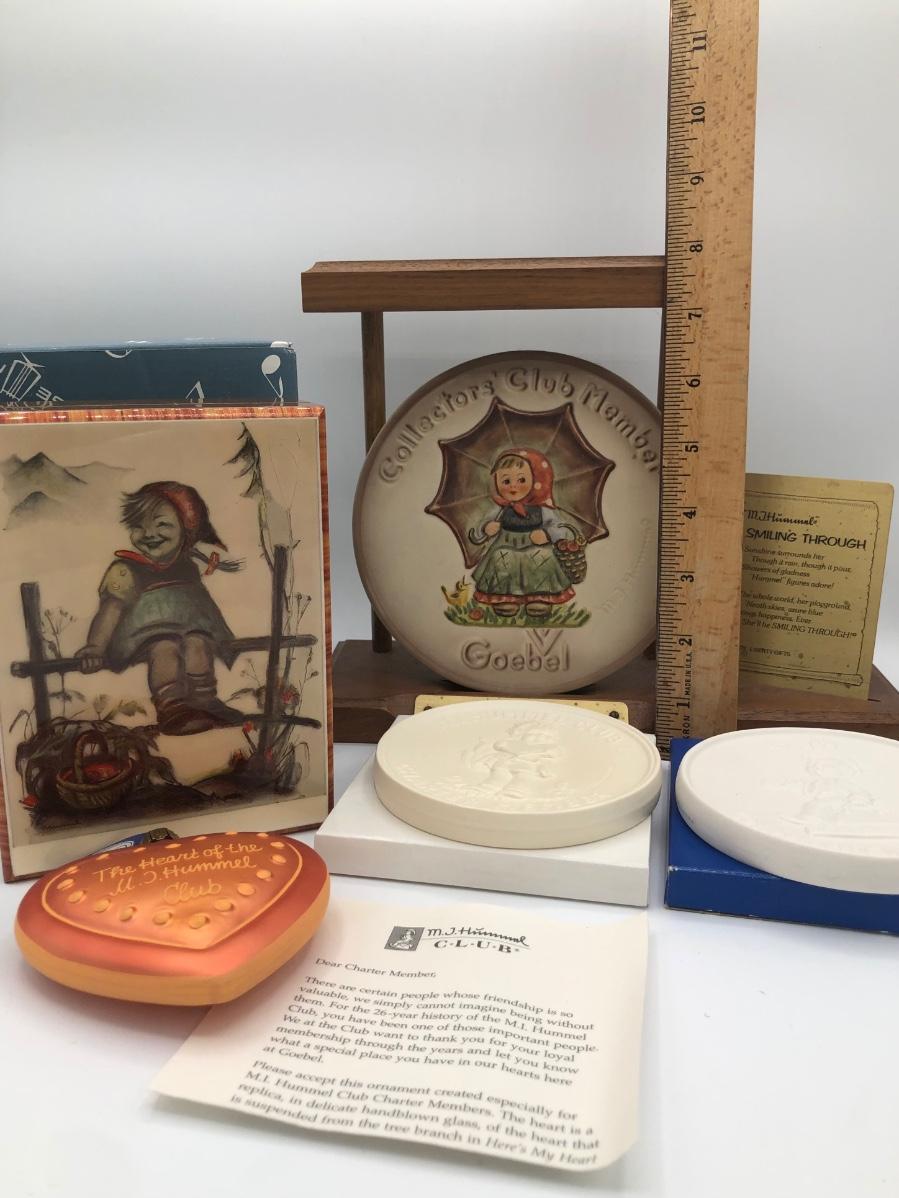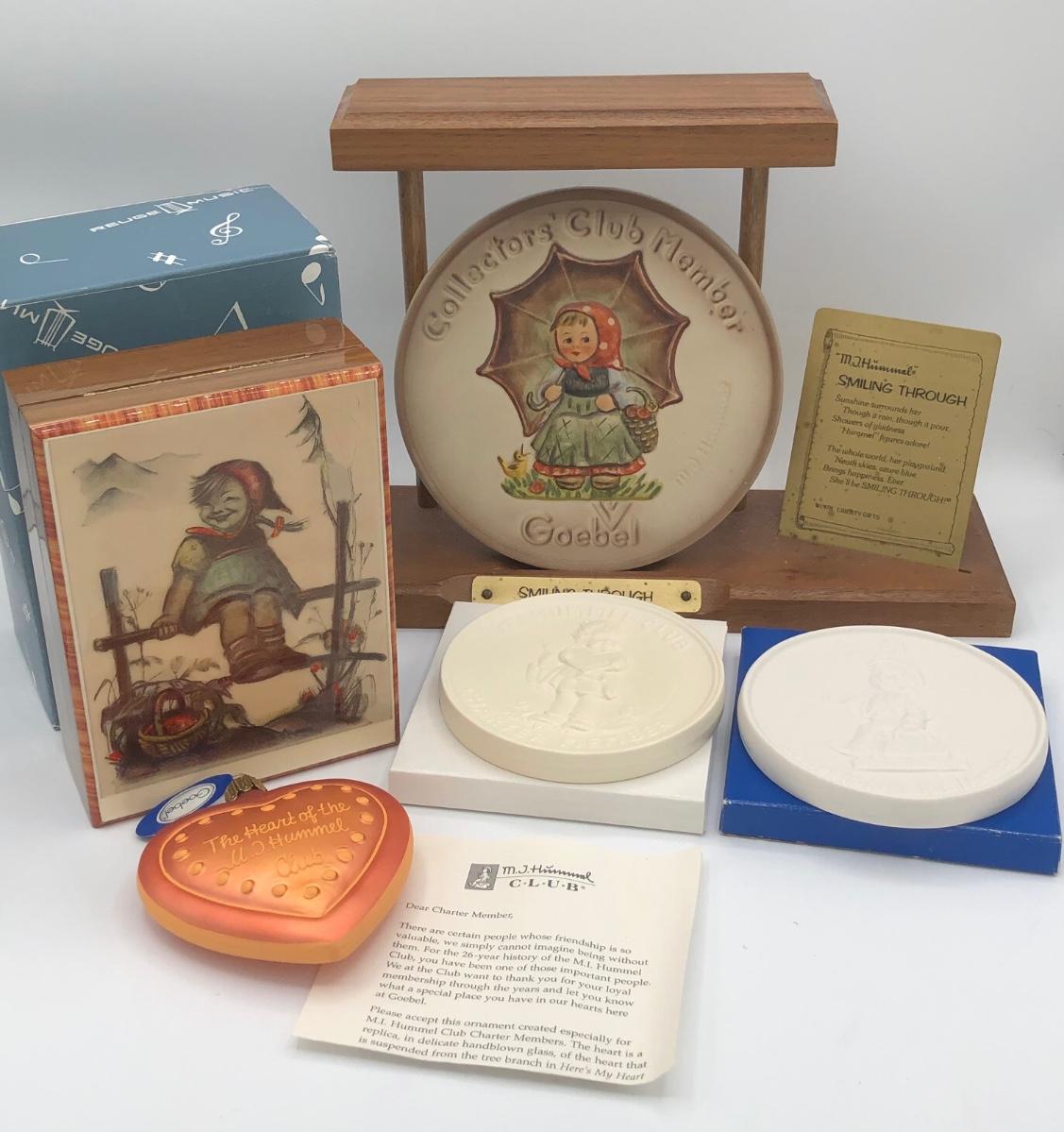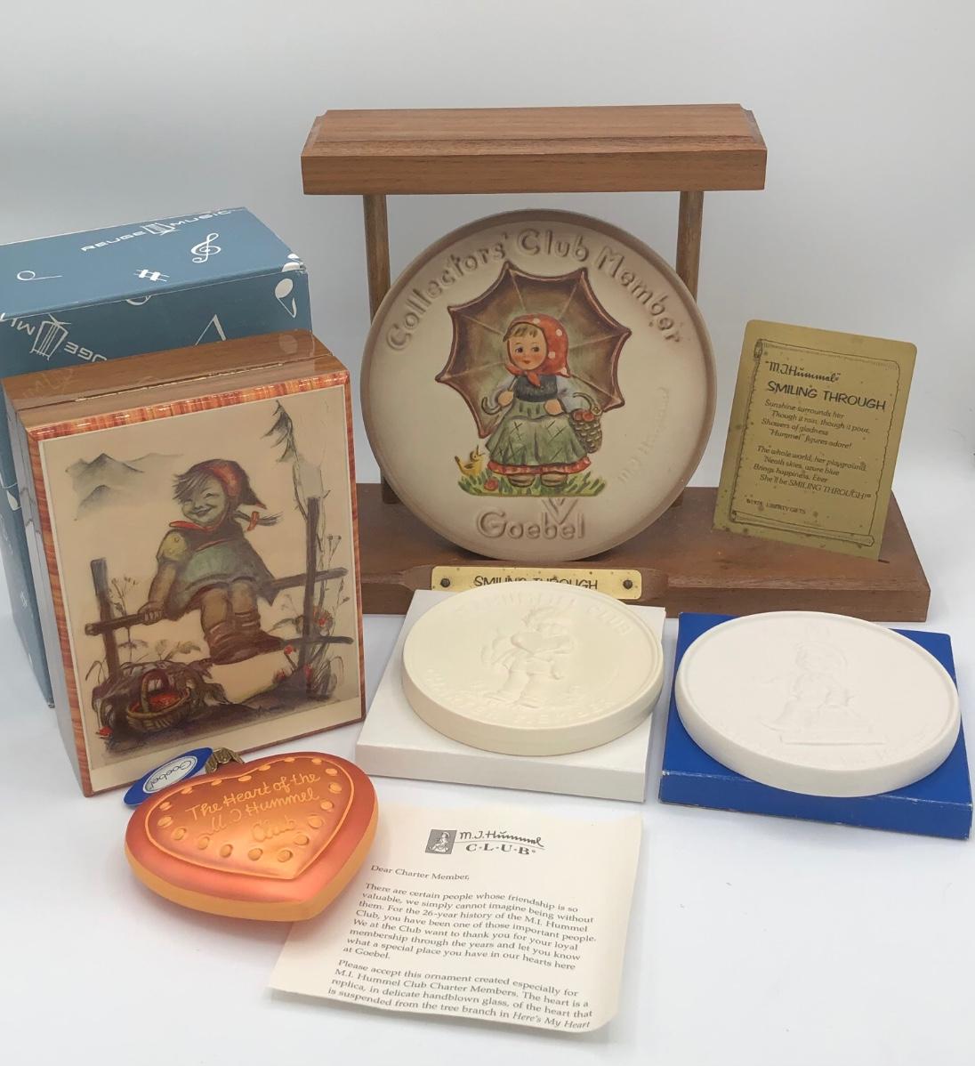 LOT 177K: Vintage Reuge Hummel Music Box w/ Collector's Club Merchandise - Charter Member Heart Ornament, Porcelain Member Coins w/ Box & 1978 "Smiling Through" Plate w/ Liberty Gifts Stand & Plaque