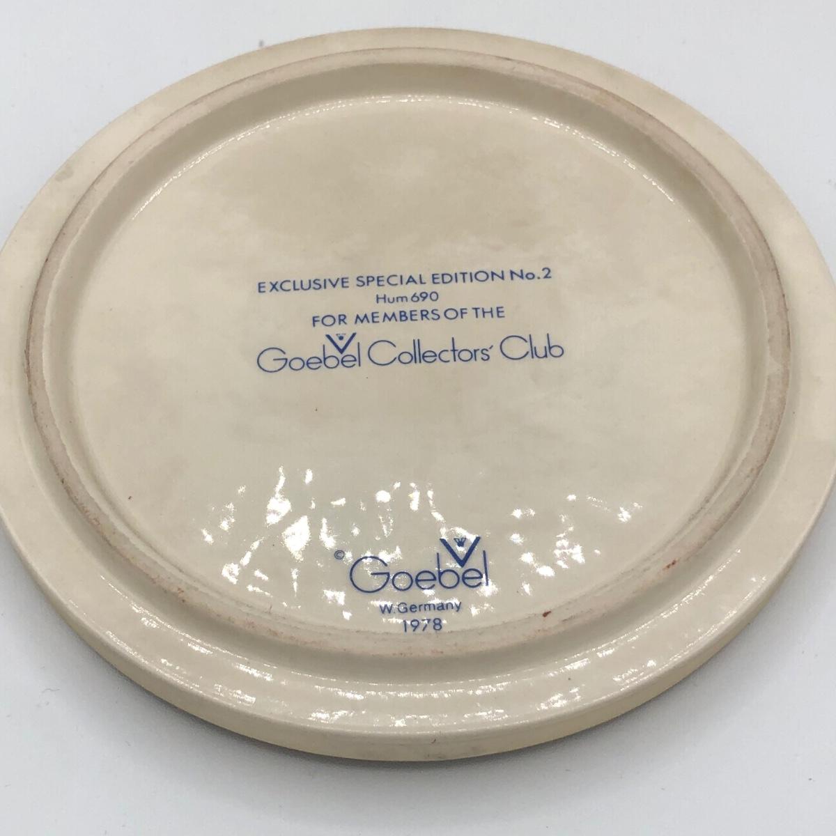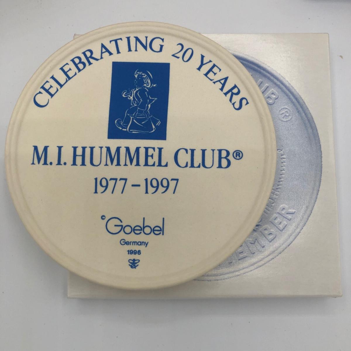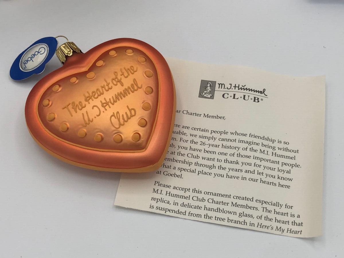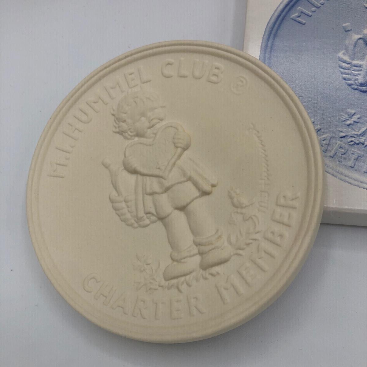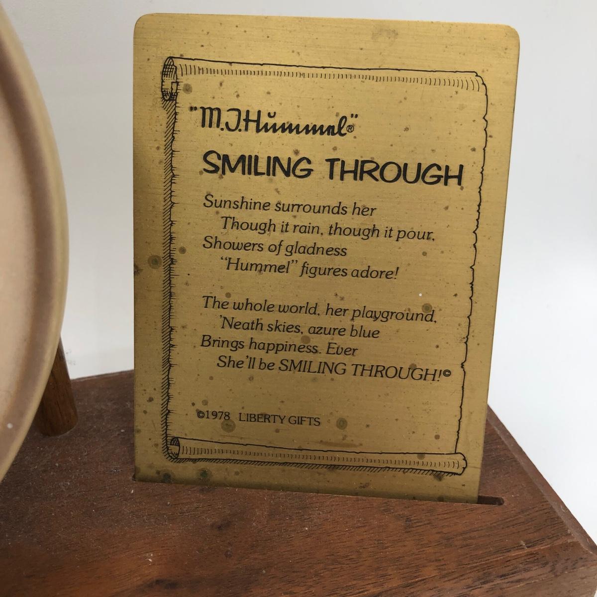 LOT 177K: Vintage Reuge Hummel Music Box w/ Collector's Club Merchandise - Charter Member Heart Ornament, Porcelain Member Coins w/ Box & 1978 "Smiling Through" Plate w/ Liberty Gifts Stand & Plaque