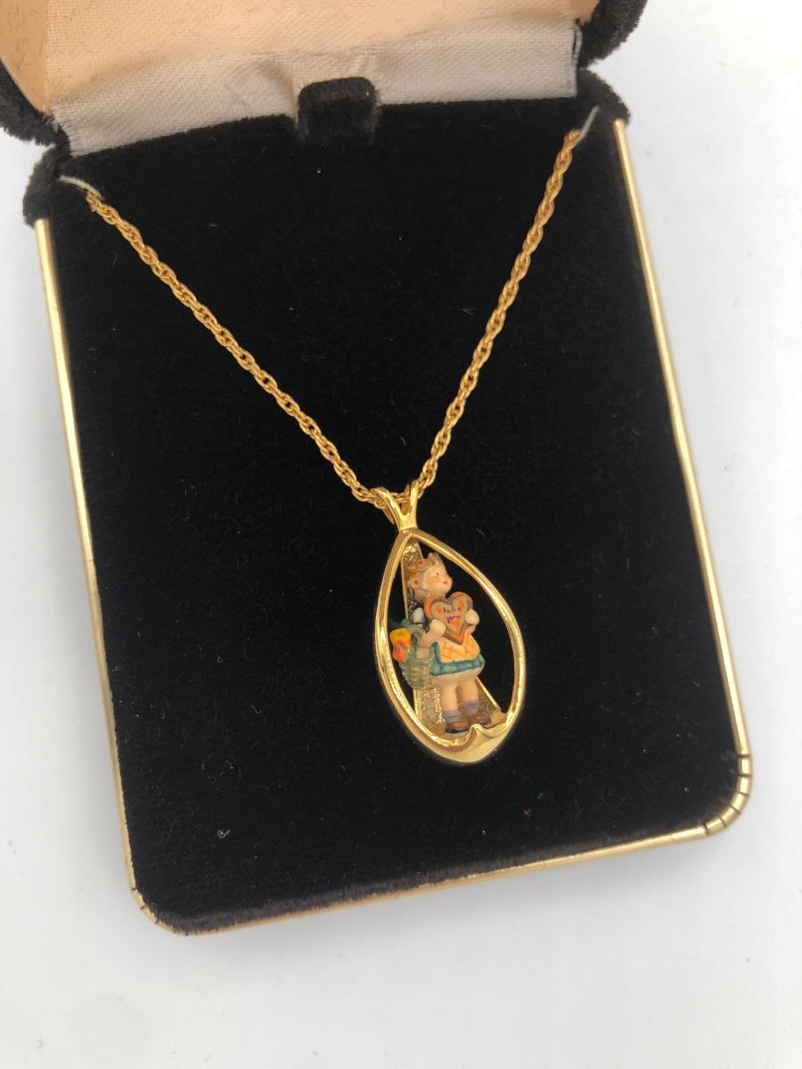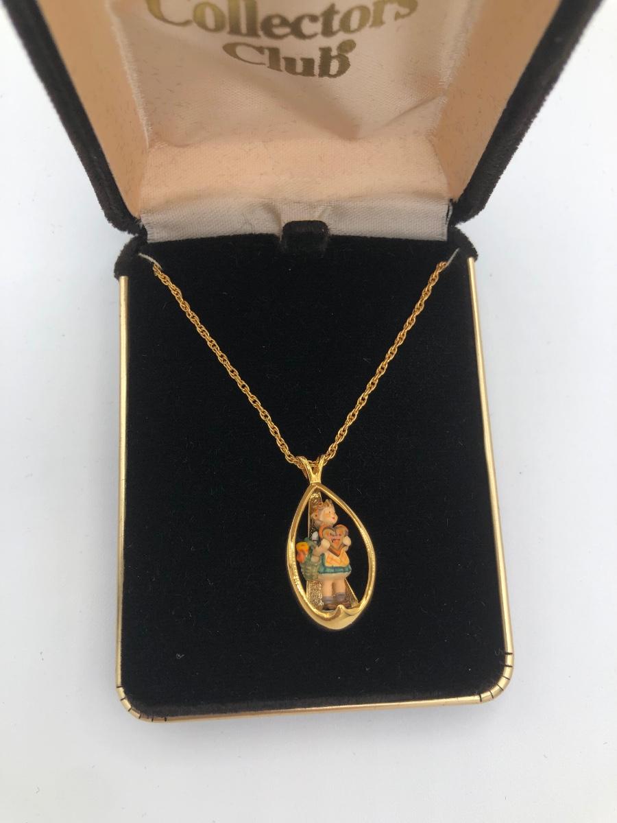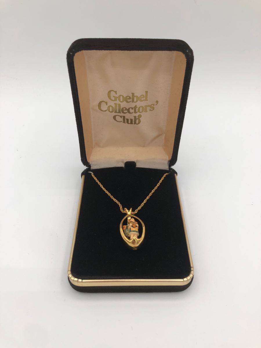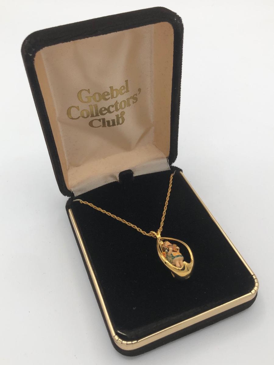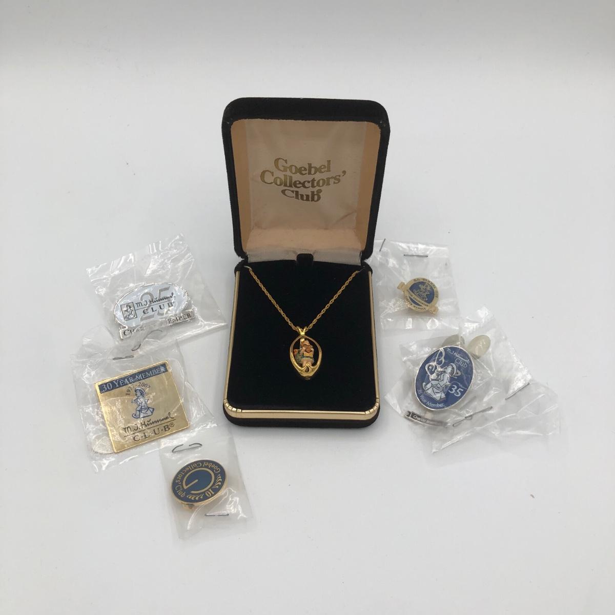 LOT 179K: Goebel Collector's Club "Valentine" Mini Hummel Necklace w/ Box & MI Hummel Club Member Anniversary Pins