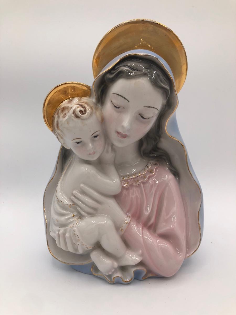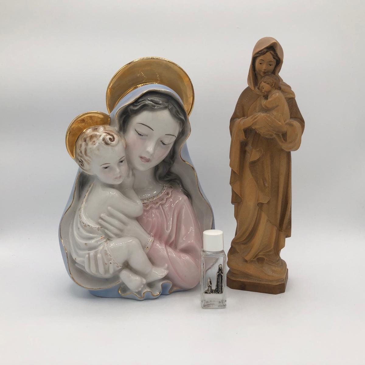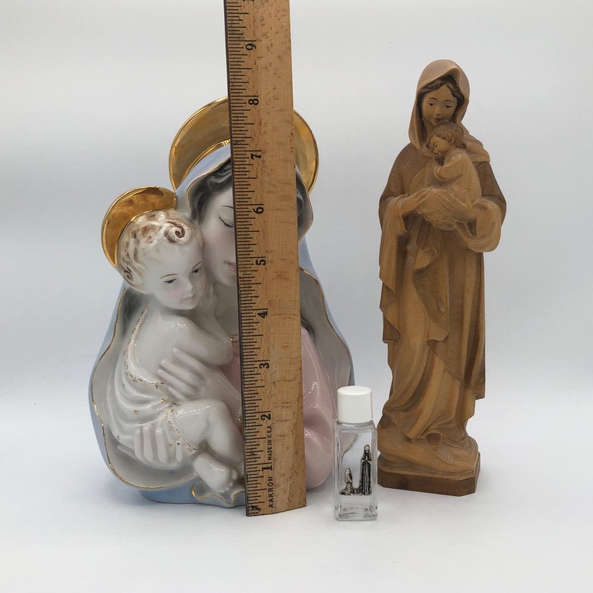 LOT 184K: Vintage Religious Decor - Italian Madonna and Child Bust Statue, Wooden Full body Madonna & Small Vial of Holy Water