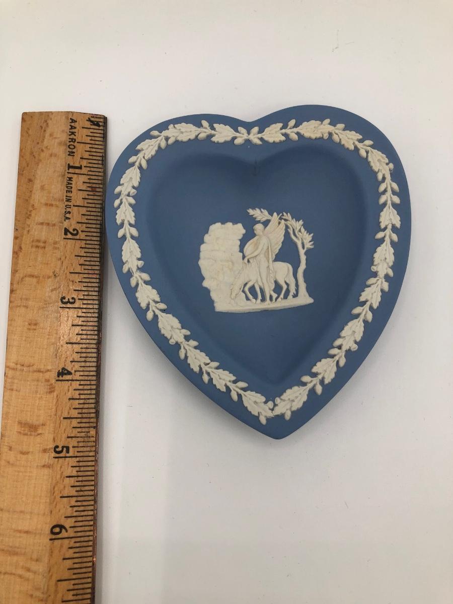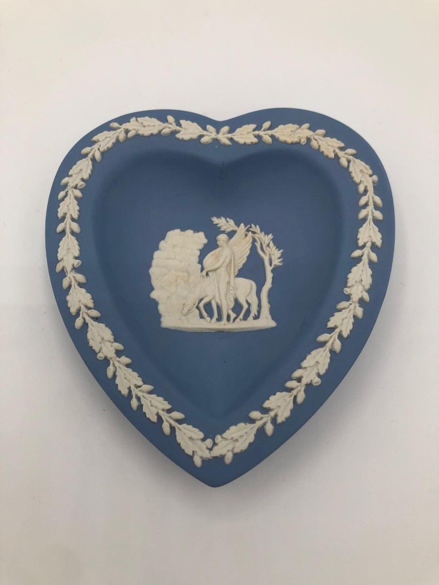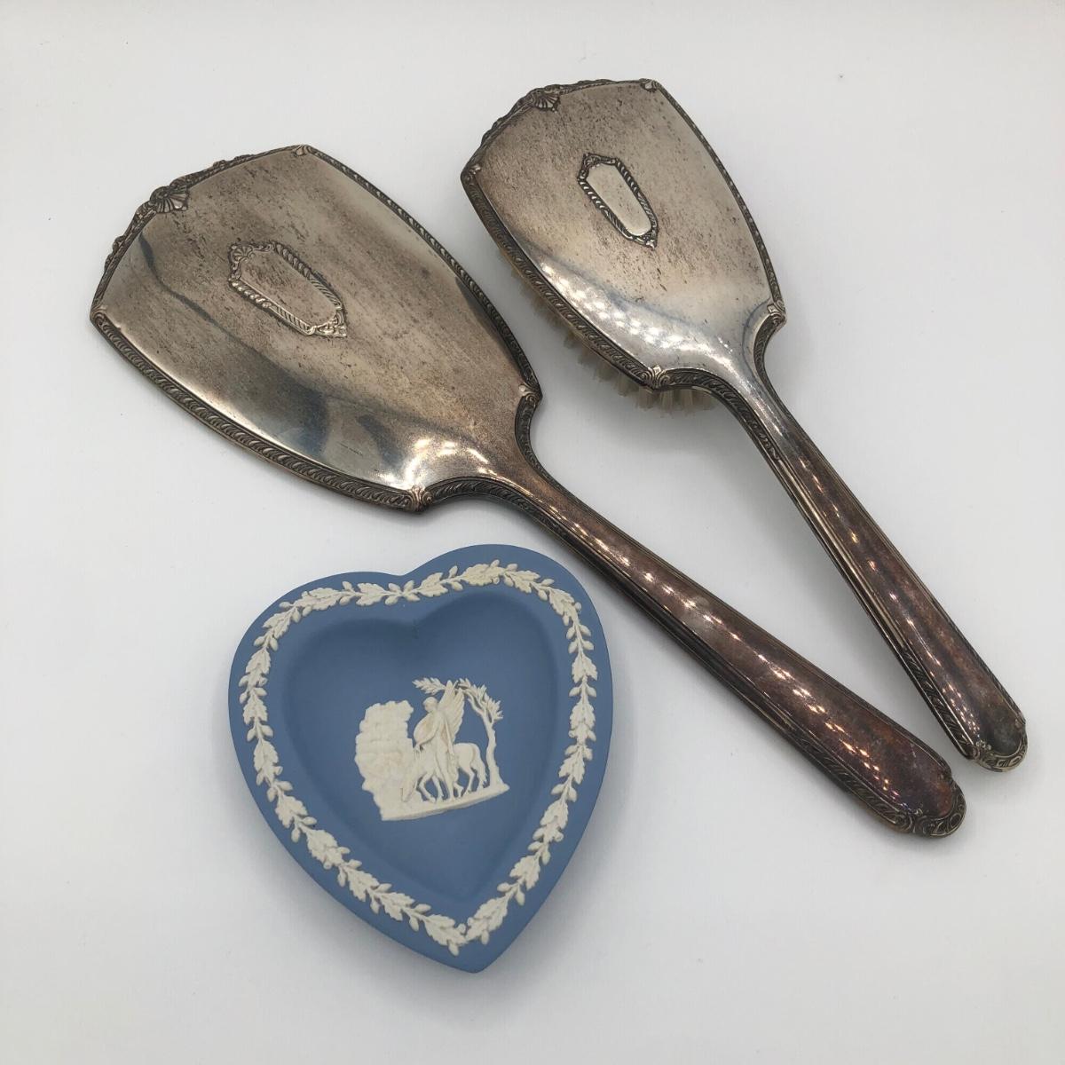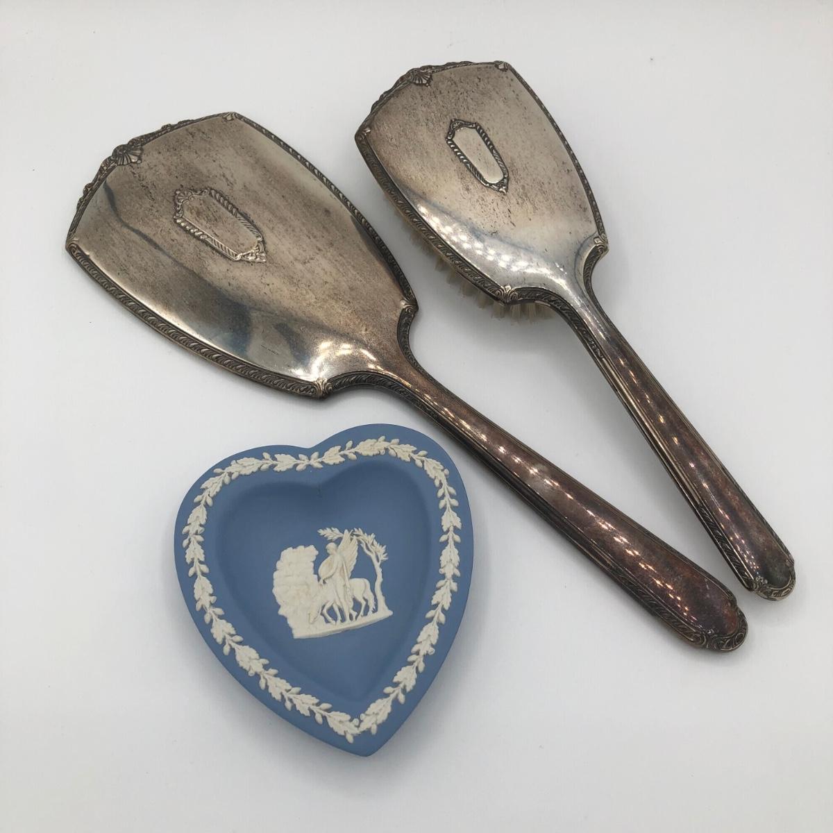 LOT 187K: Antique / Vintage S&B Sterling Silver 2 Piece Vanity Set w/ Vintage Blue Wedgewood Heart Trinket Dish