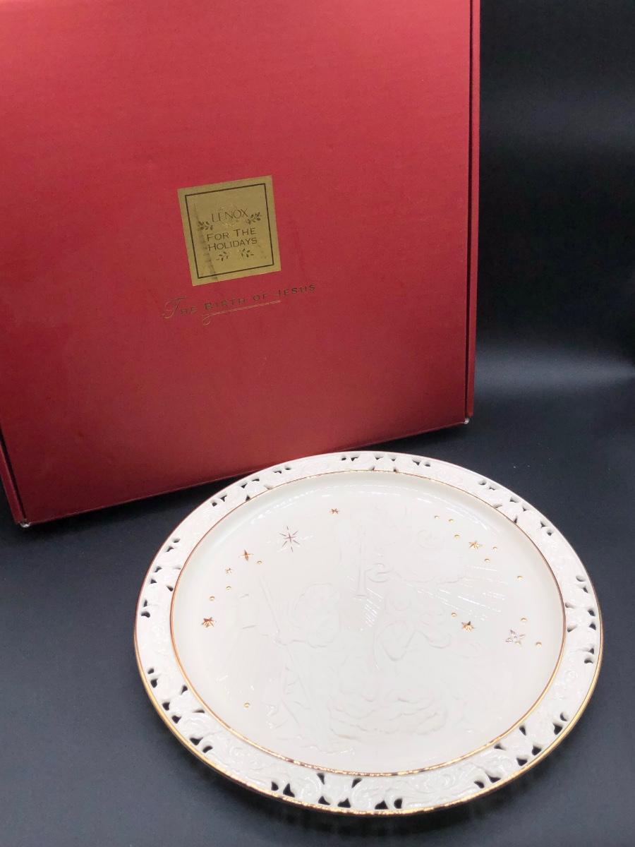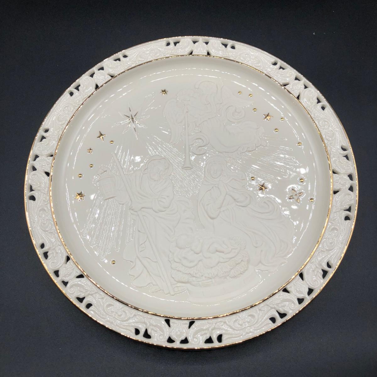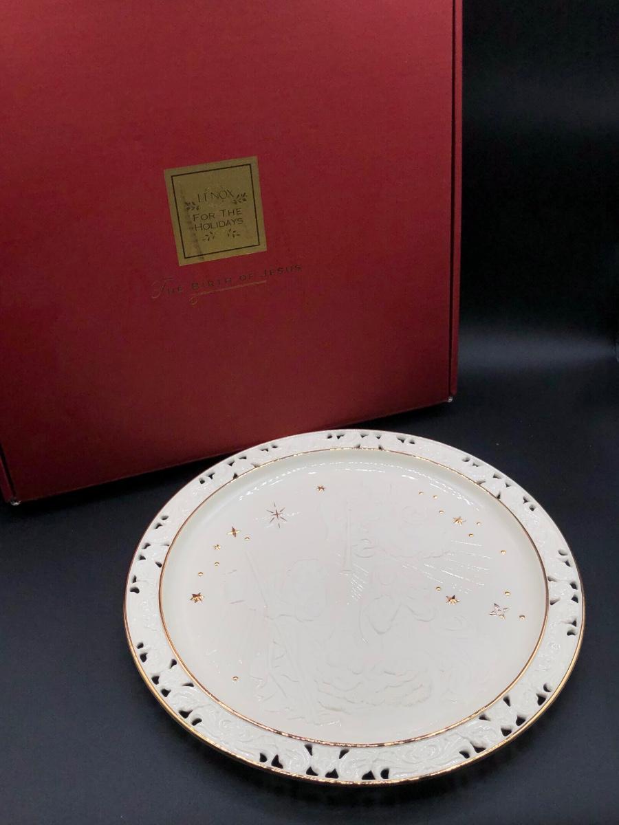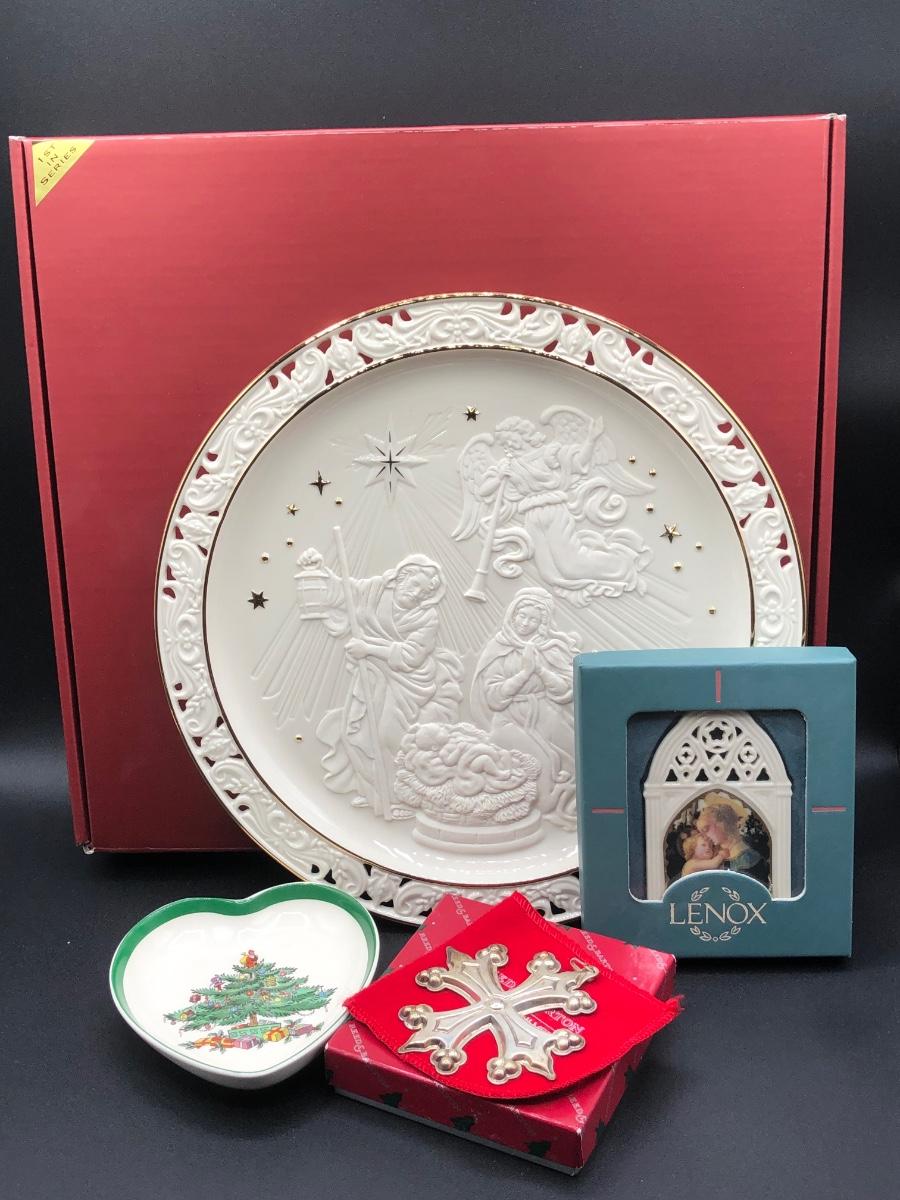 LOT 191K: Reed & Barton Sterling Silver 1998 Annual Cross Ornament, Lenox 15th Century Madonna and Child Ornament in Box, Lenox Nativity Story Birth of Jesus Plate w/ Box & More