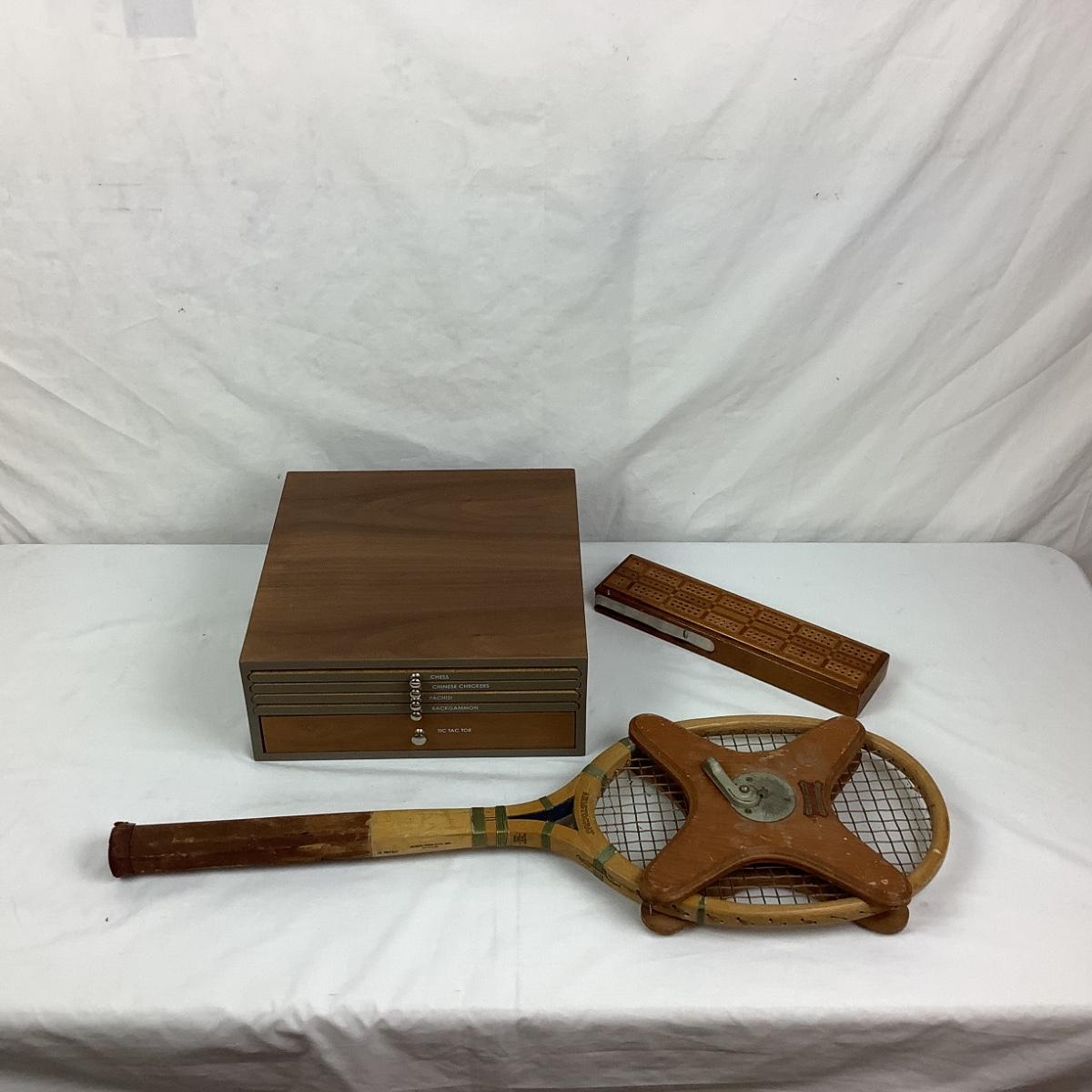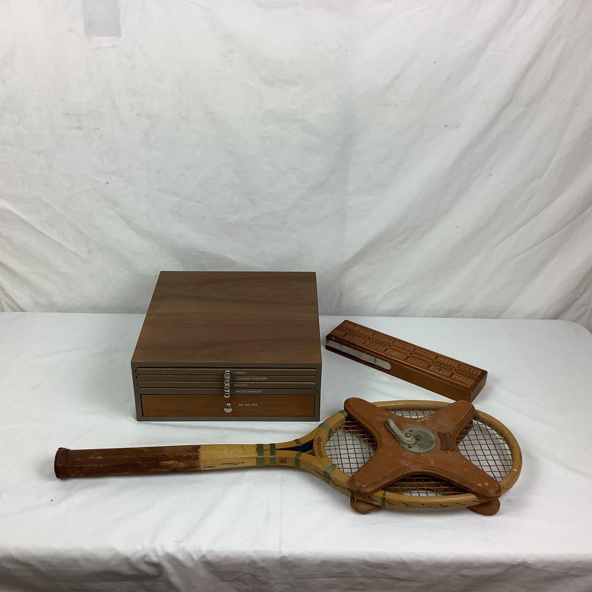 Lot 1045 Pair of Vintage Wooden Game Sets & Vintage J. Hunter Smith Aristocrat Tennis Racket