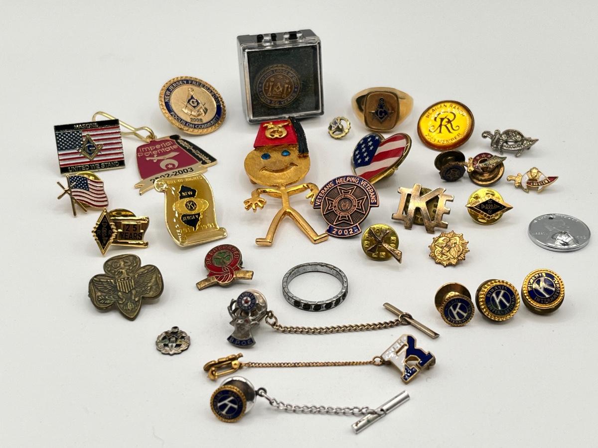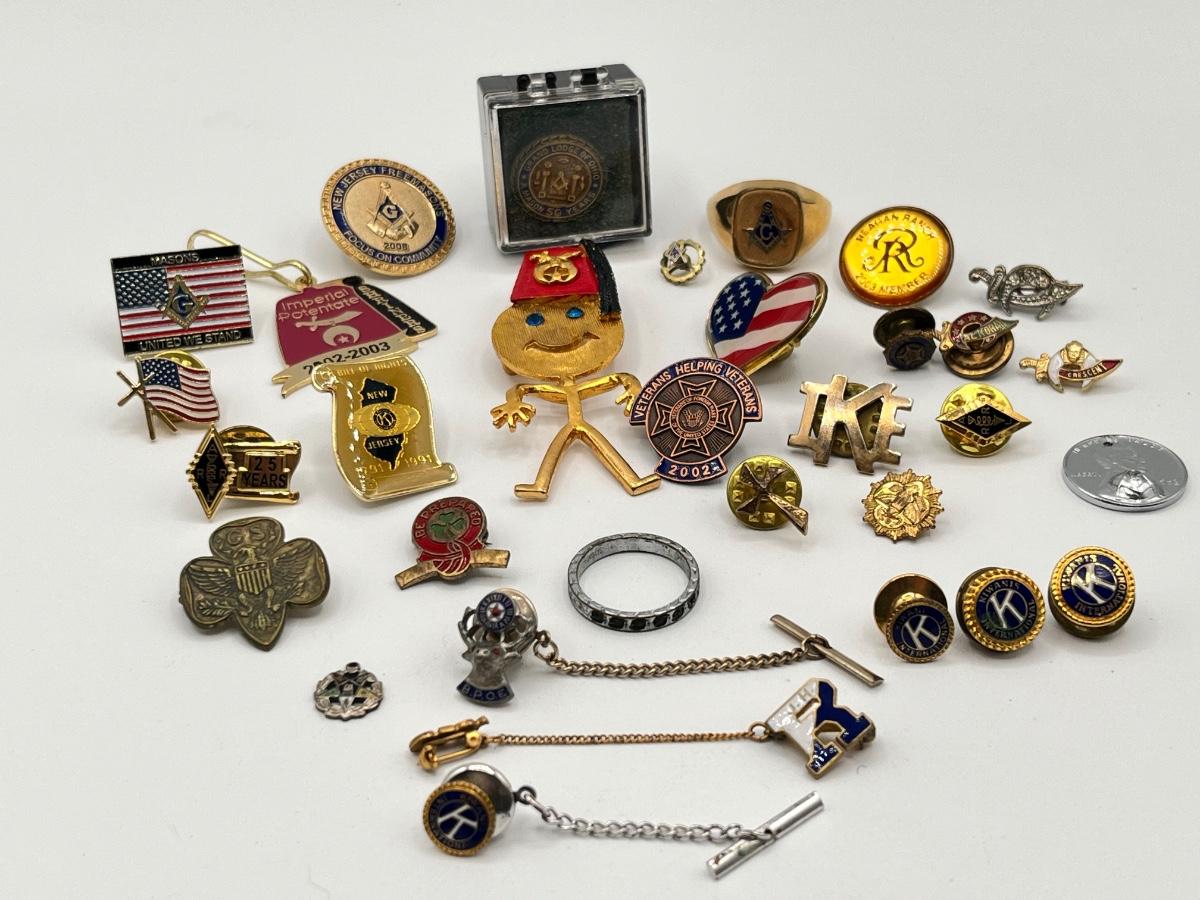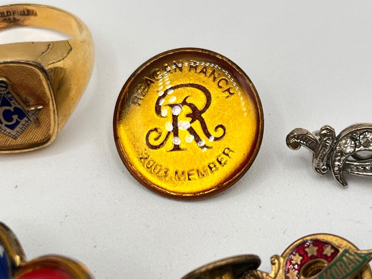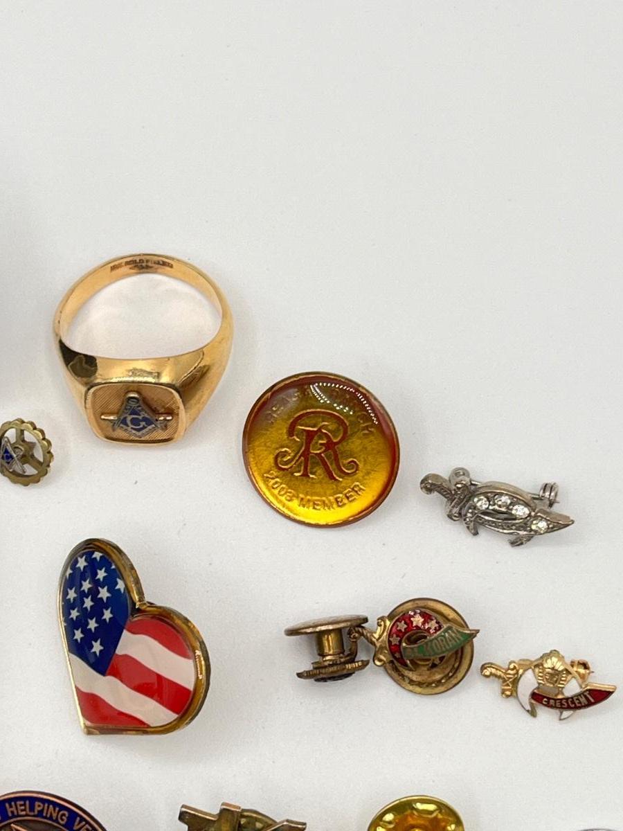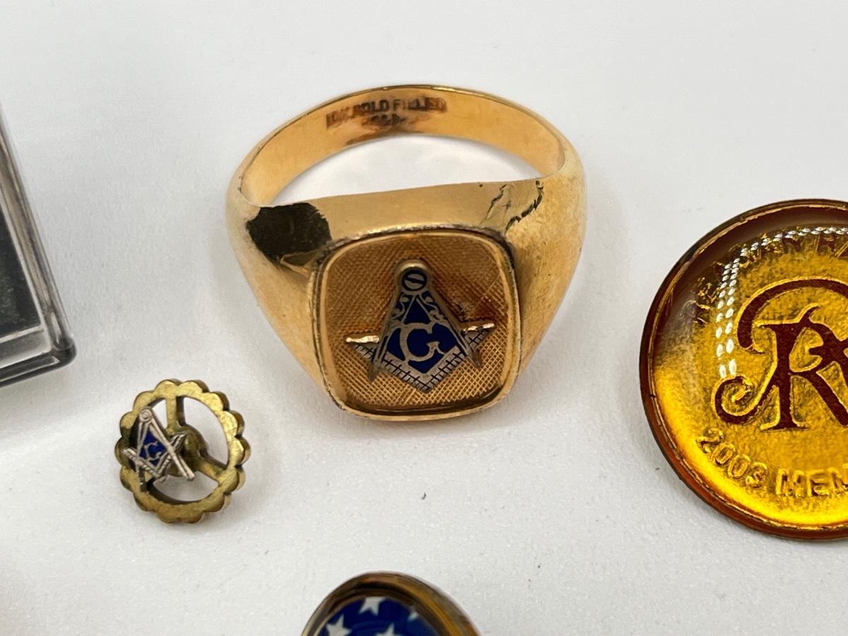 LOT 53: 10K Gold Filled Masonic Ring-Size 11-and Miscellaneous Pins: Kiwanis, Shriners, Masons and More!