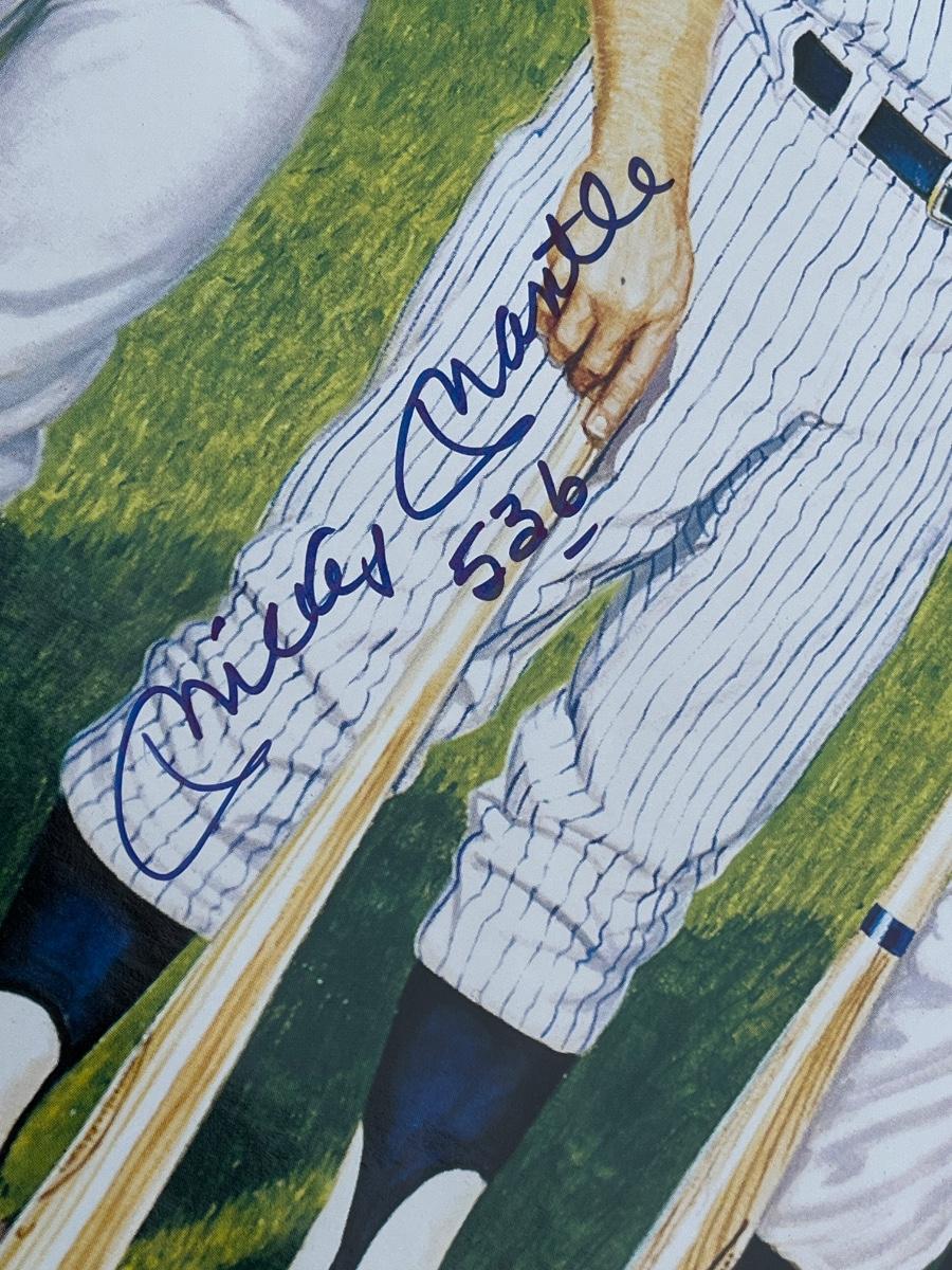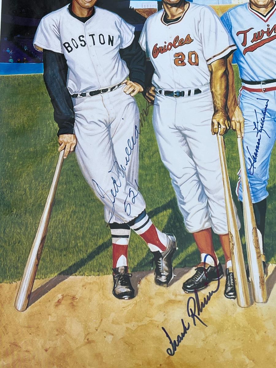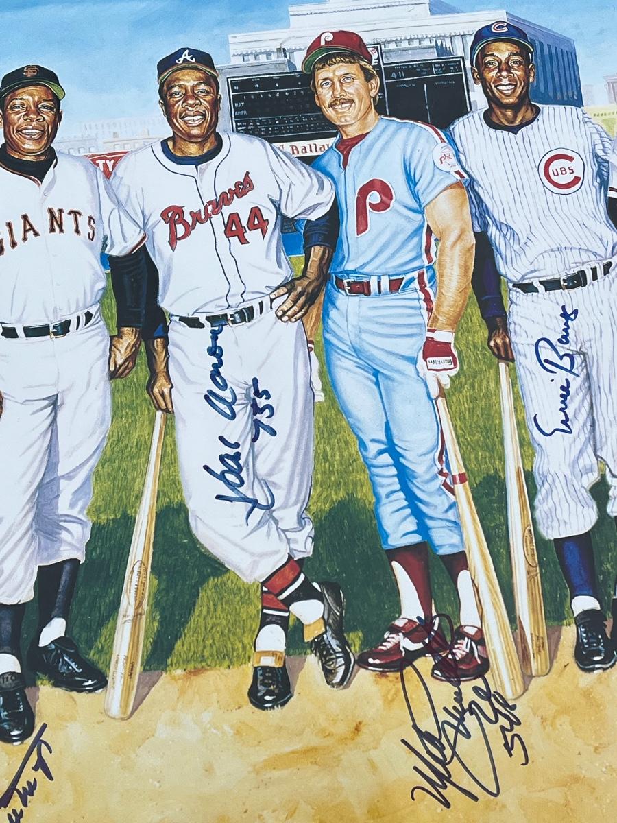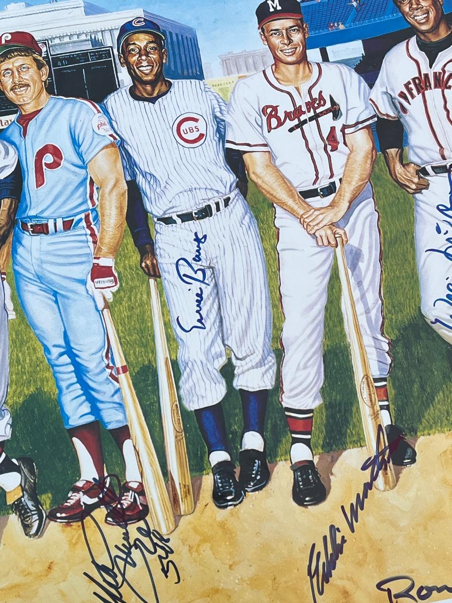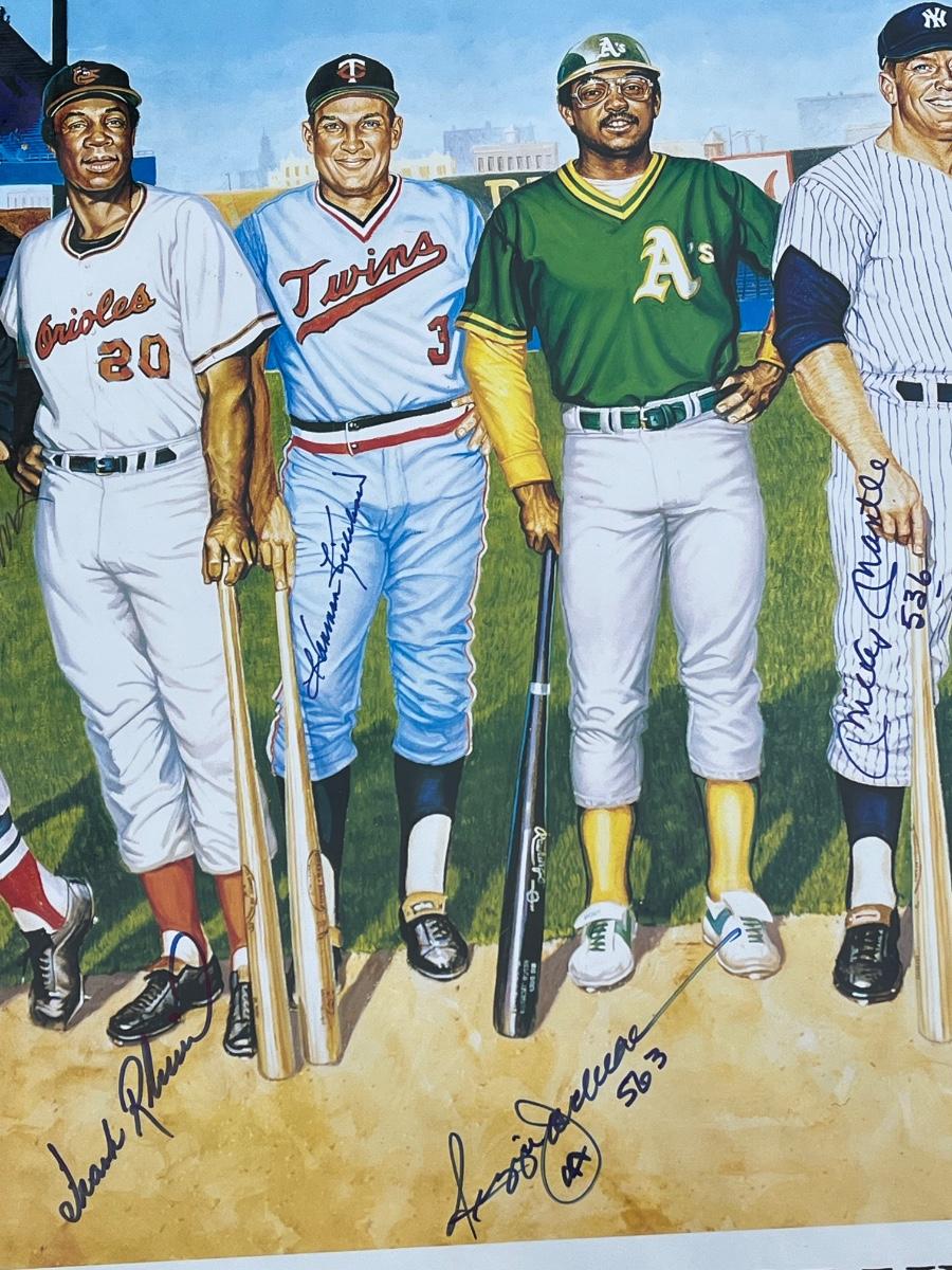 Has autographs of all 11 members of the 500 homerun club featured on the print - Ted Williams, Frank Robinson, Harmon Killebrew, Reggie Jackson, Mickey Mantle, Willie Mays, Hank Aaron, Mike Schmidt, Ernie Banks, Eddie Mathews and Willie McCovey - in blue ink, along with the signature of the artist - Ron Lewis.