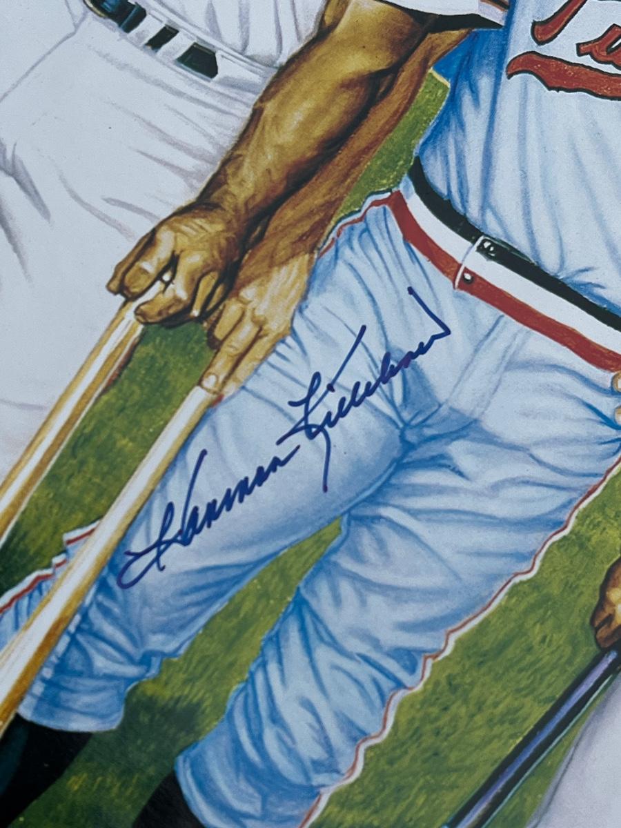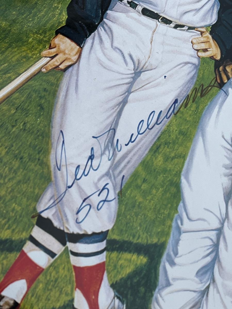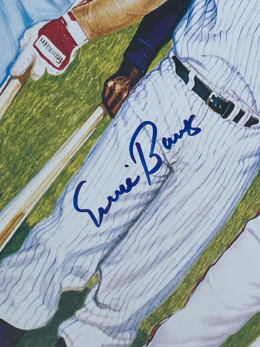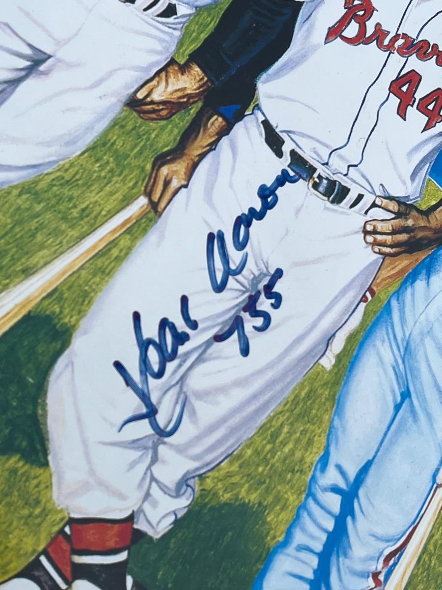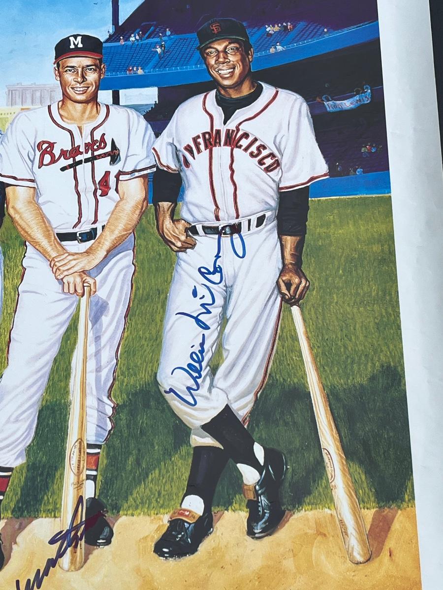 Has autographs of all 11 members of the 500 homerun club featured on the print - Ted Williams, Frank Robinson, Harmon Killebrew, Reggie Jackson, Mickey Mantle, Willie Mays, Hank Aaron, Mike Schmidt, Ernie Banks, Eddie Mathews and Willie McCovey - in blue ink, along with the signature of the artist - Ron Lewis.