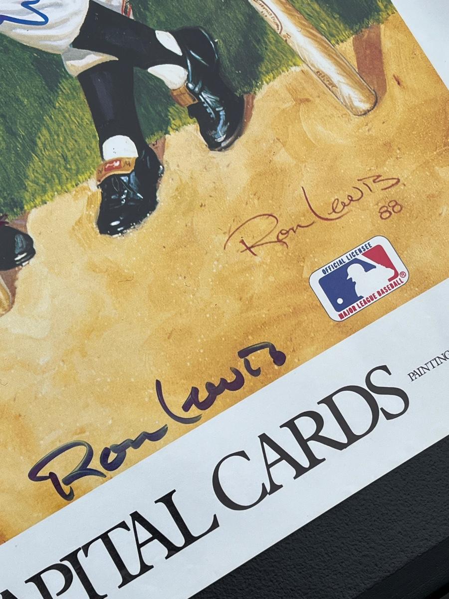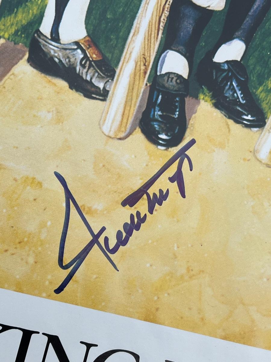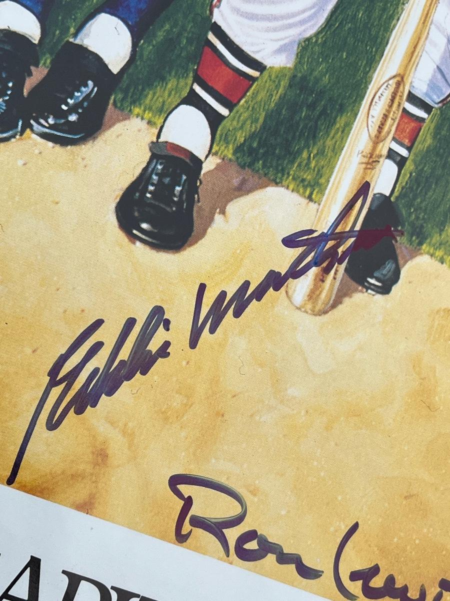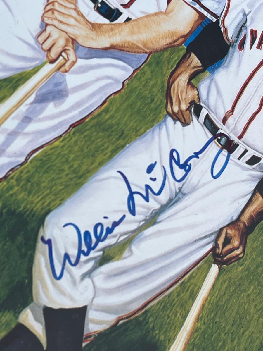 Has autographs of all 11 members of the 500 homerun club featured on the print - Ted Williams, Frank Robinson, Harmon Killebrew, Reggie Jackson, Mickey Mantle, Willie Mays, Hank Aaron, Mike Schmidt, Ernie Banks, Eddie Mathews and Willie McCovey - in blue ink, along with the signature of the artist - Ron Lewis.