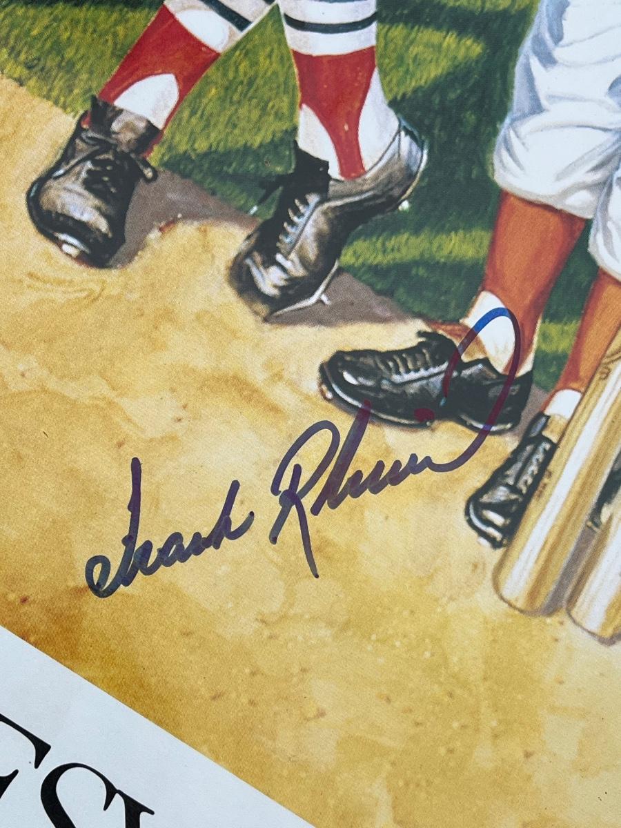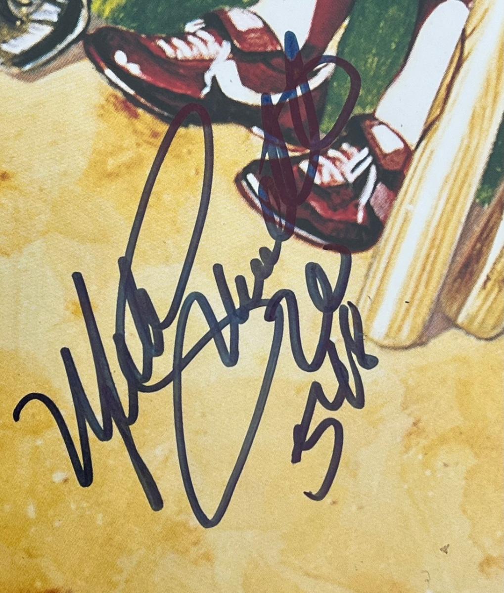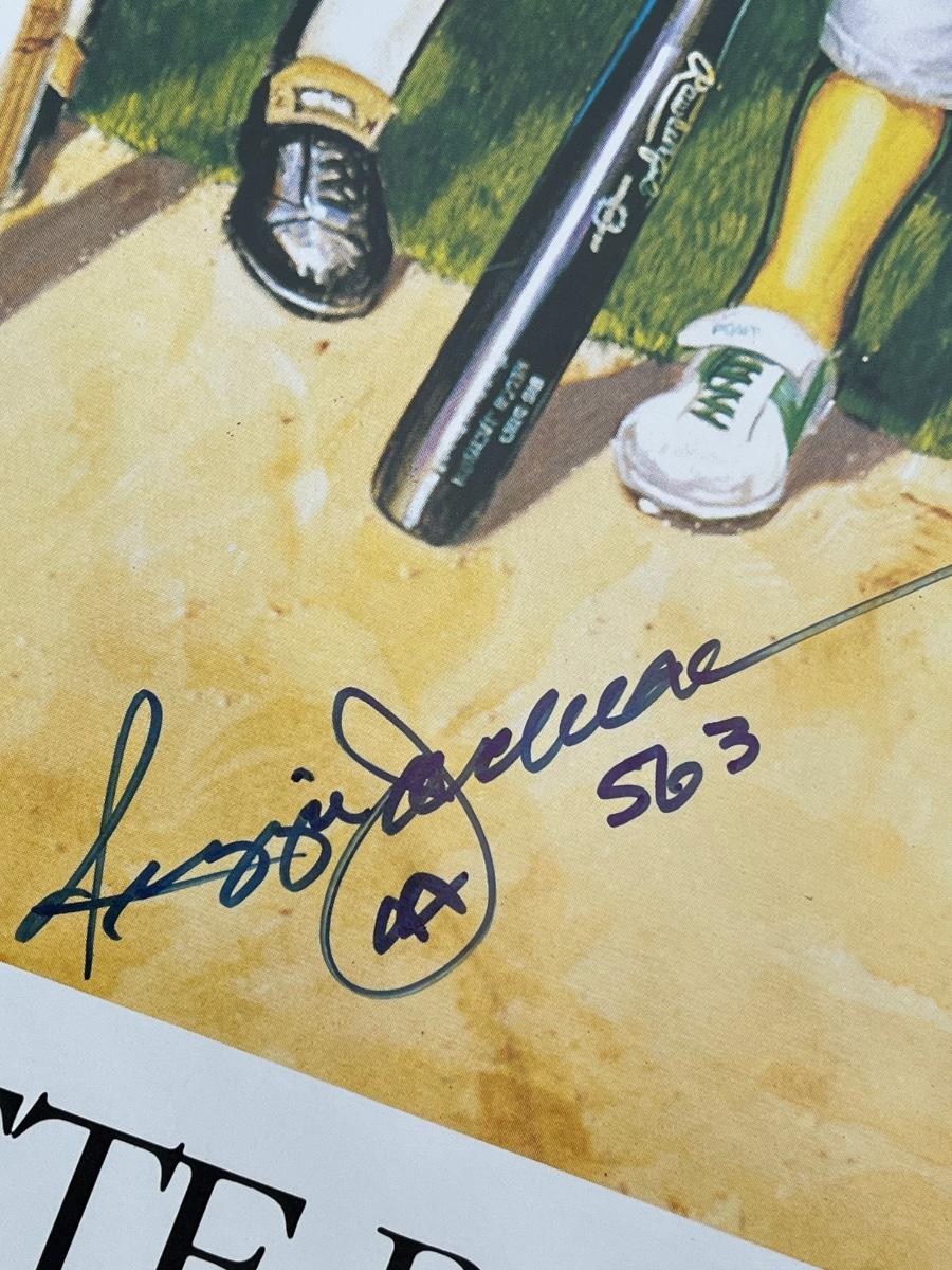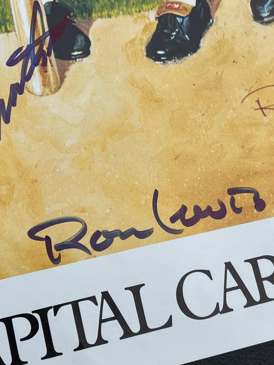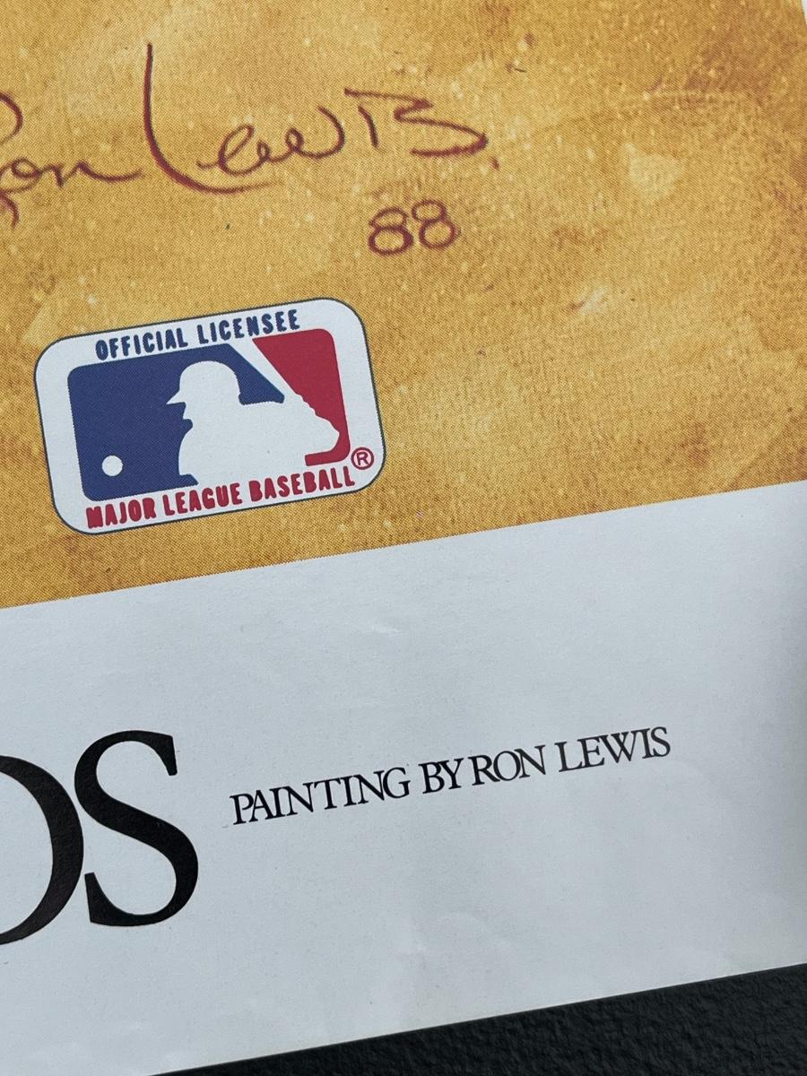 Has autographs of all 11 members of the 500 homerun club featured on the print - Ted Williams, Frank Robinson, Harmon Killebrew, Reggie Jackson, Mickey Mantle, Willie Mays, Hank Aaron, Mike Schmidt, Ernie Banks, Eddie Mathews and Willie McCovey - in blue ink, along with the signature of the artist - Ron Lewis.