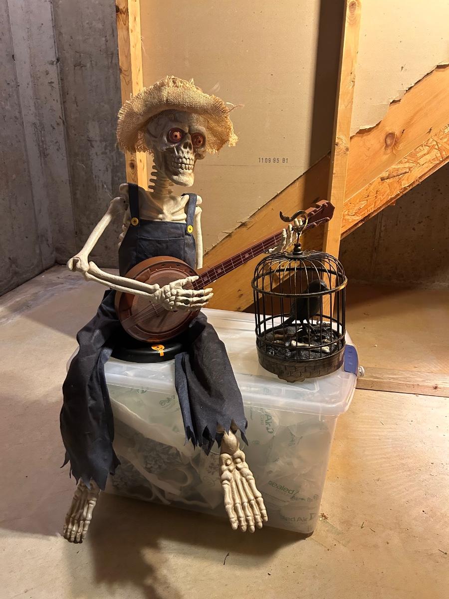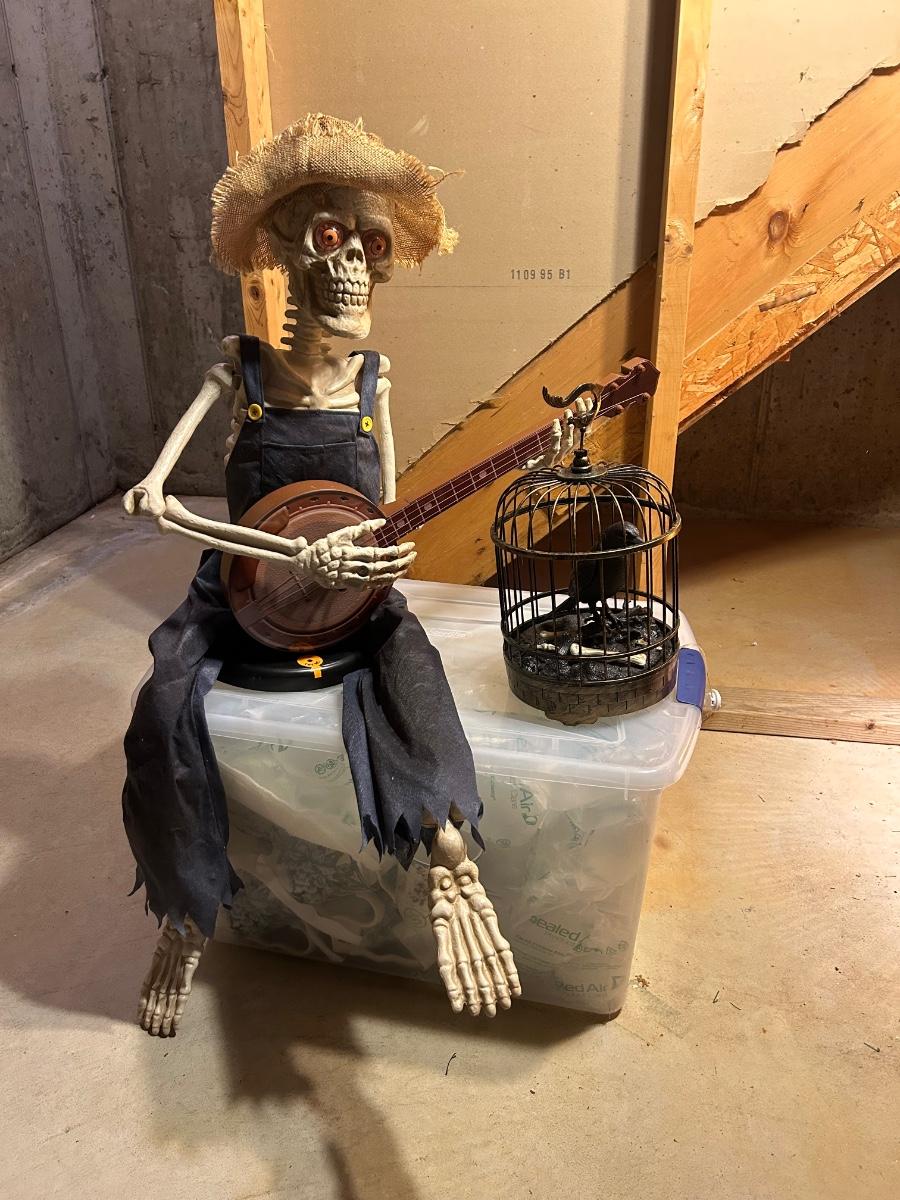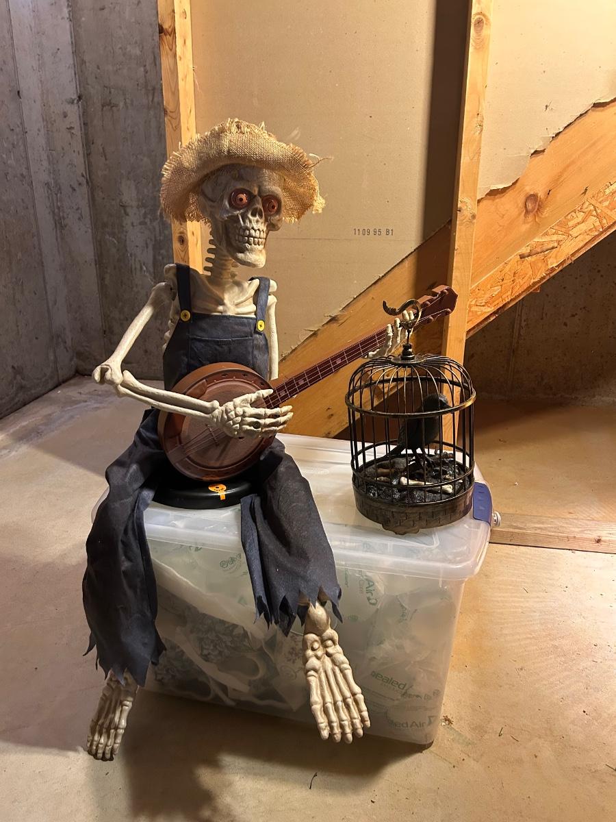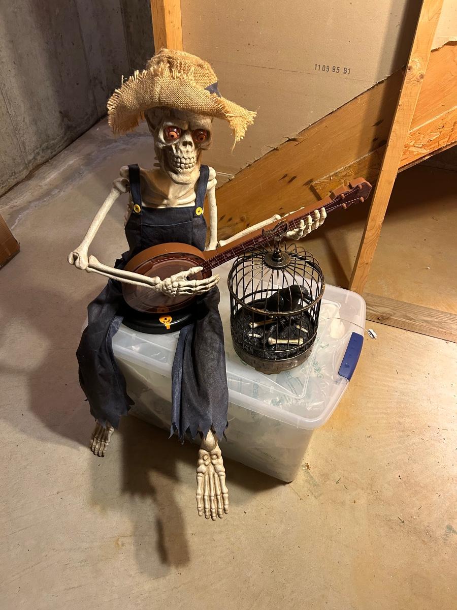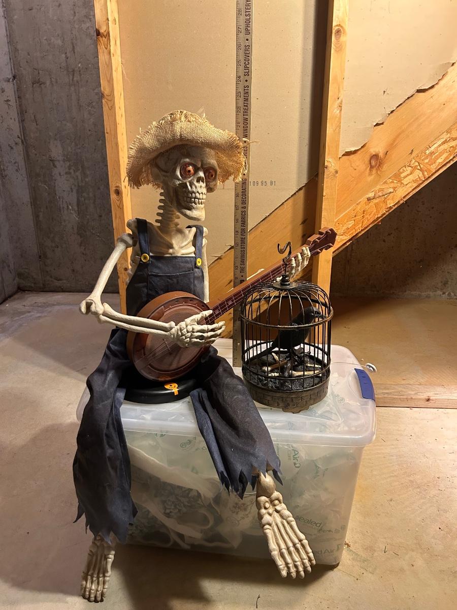 LOT 28: Musical, Animated Banjo Playing Skeliton & Bird Cage