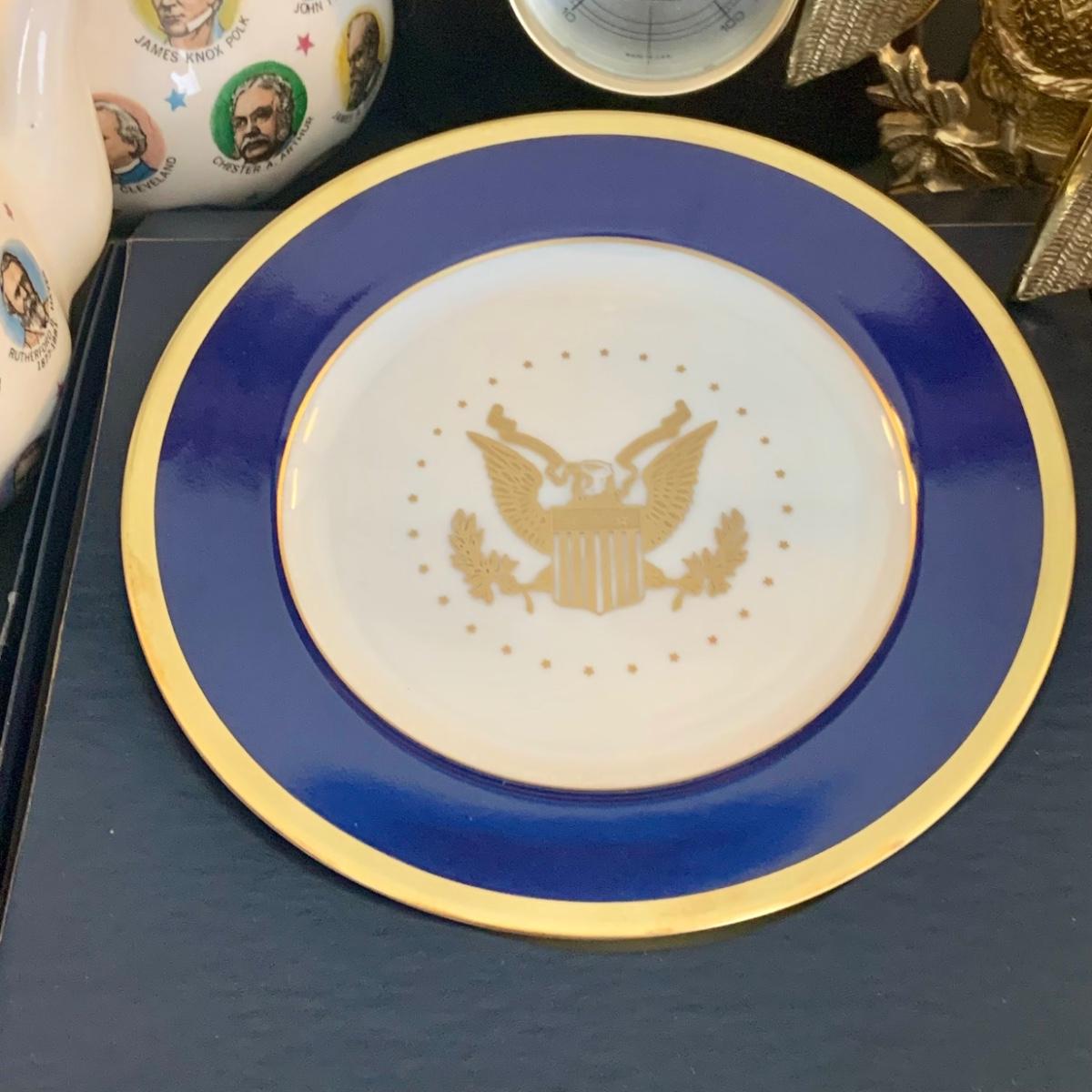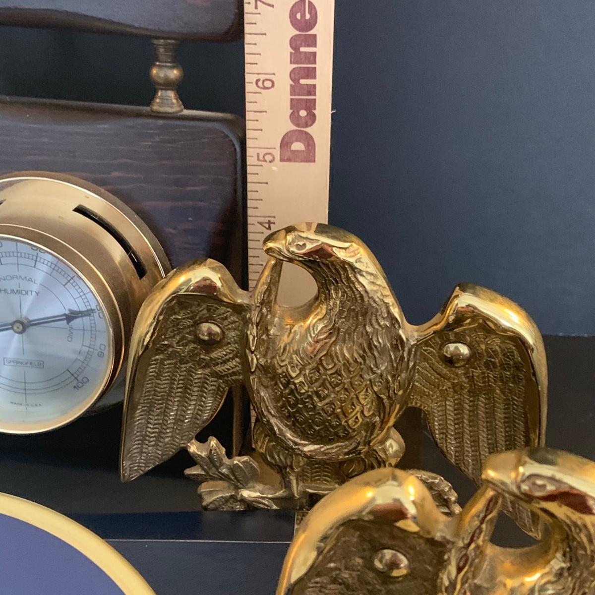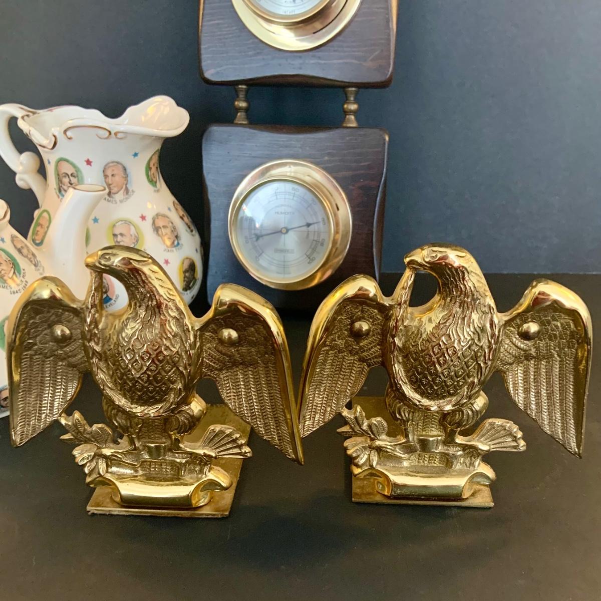LOT:33: Americana Collection Featuring Baldwin Brass Bookends, Springfield Instruments Barometer. Chadwick-Miller 1965 Presidents Teapot and Creamer and Clinton Inaugural Plate with COA