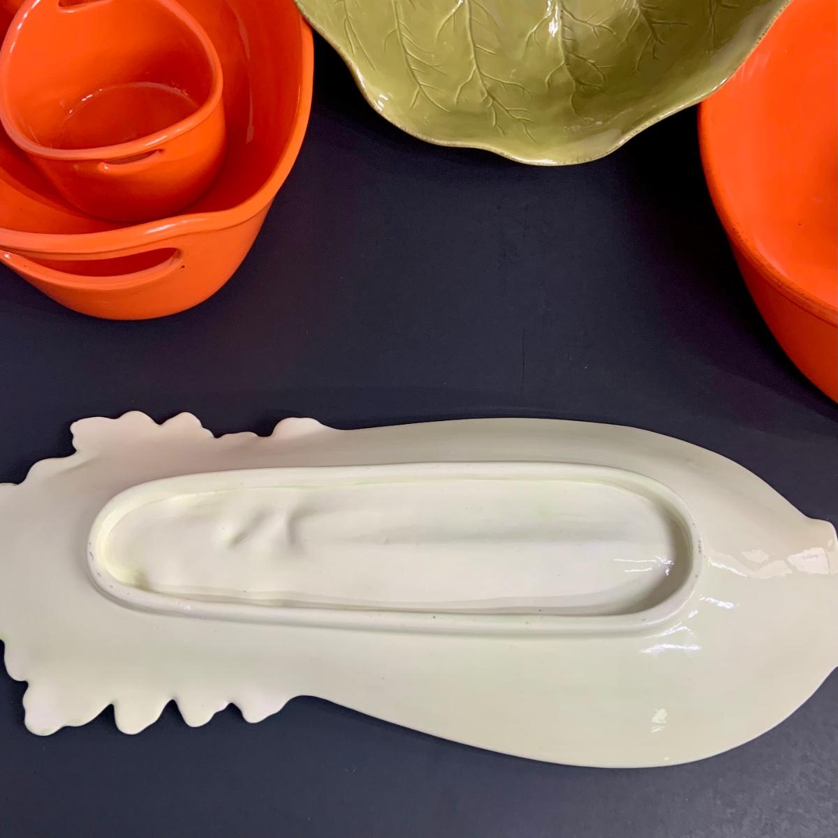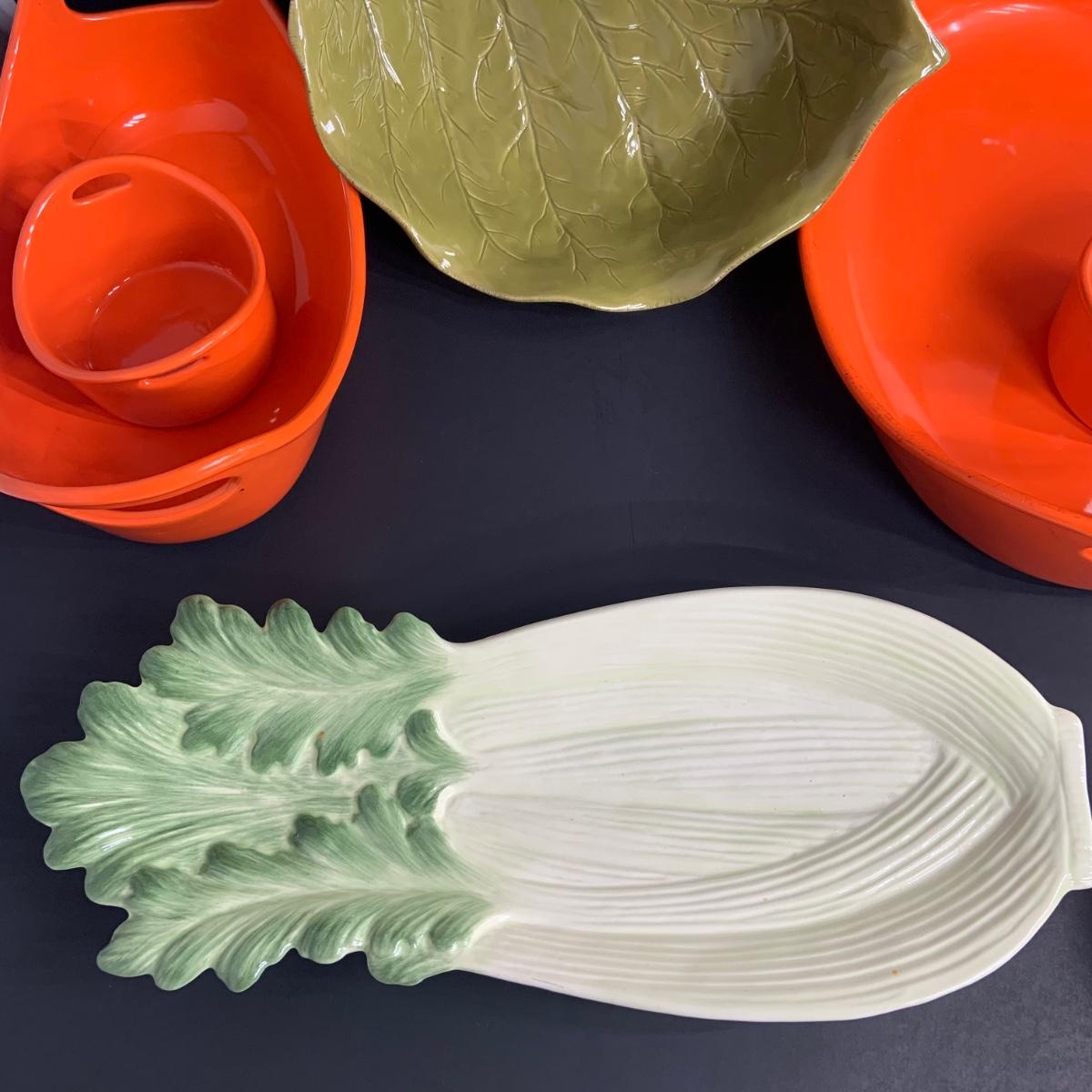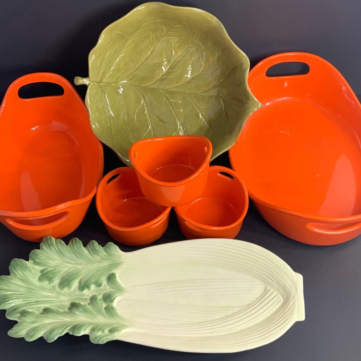 LOT:38: Rachel Ray Orange Stoneware Ceramic Oval Baker Set and Ramekins, Cabbage Bowl and Celery Serving Plate
