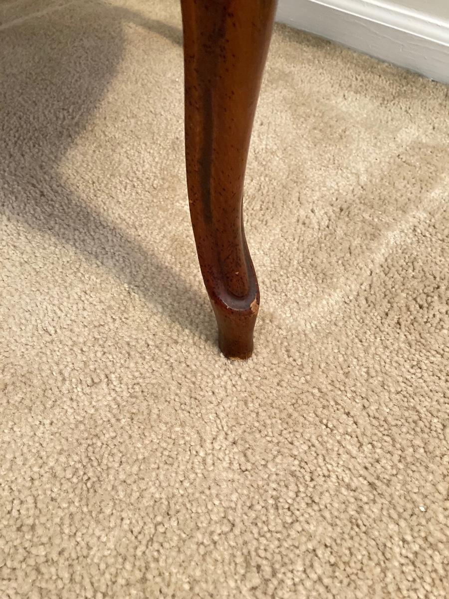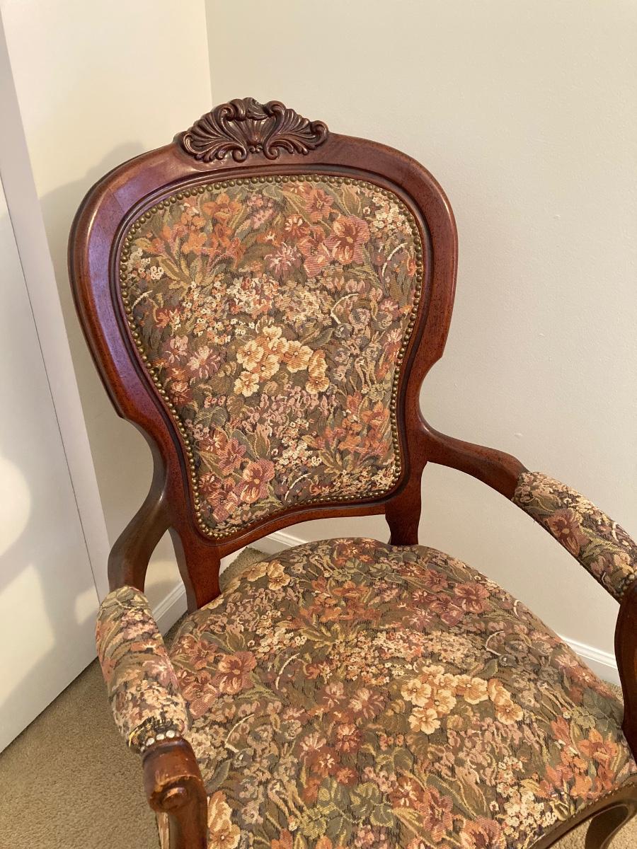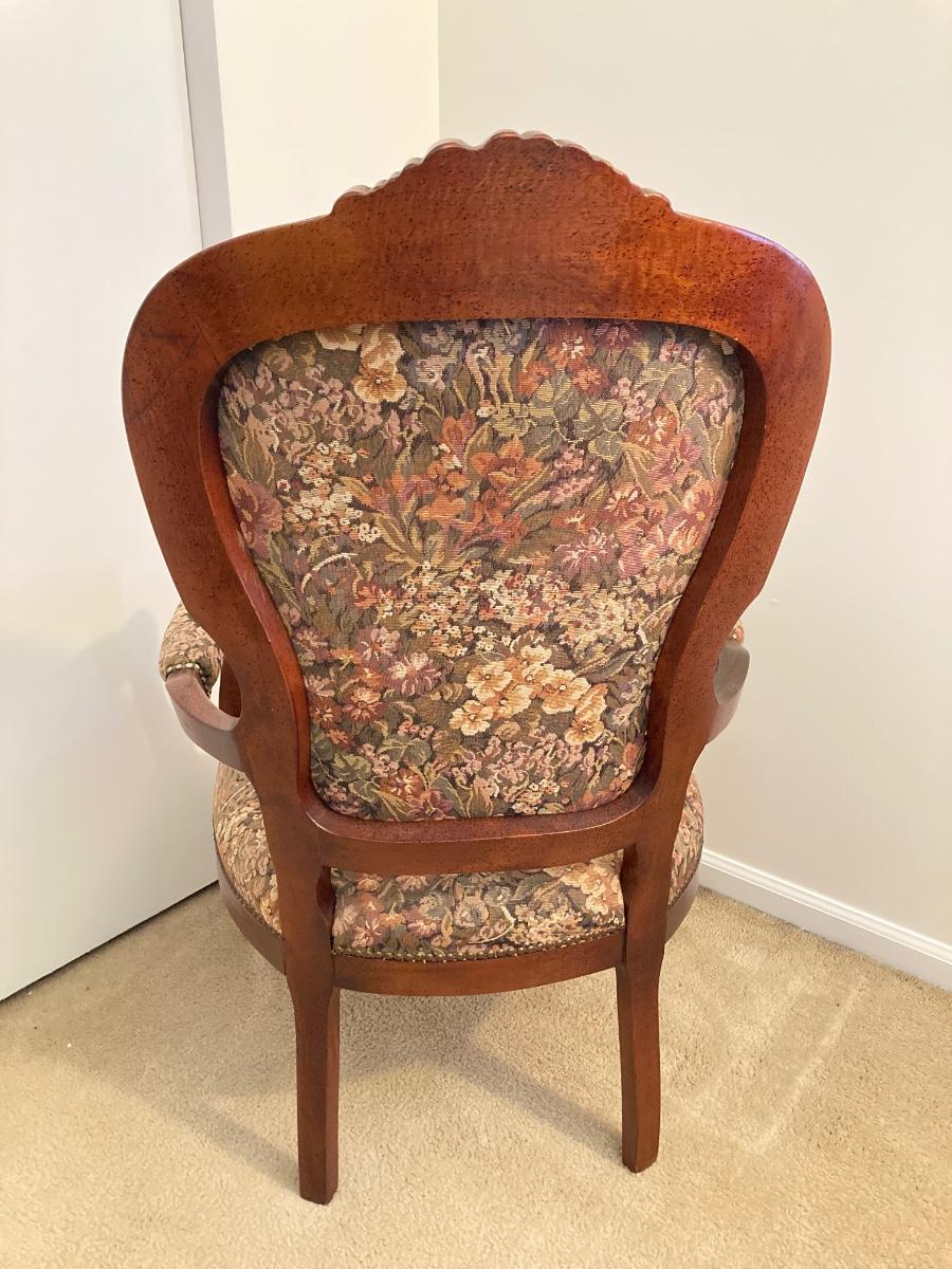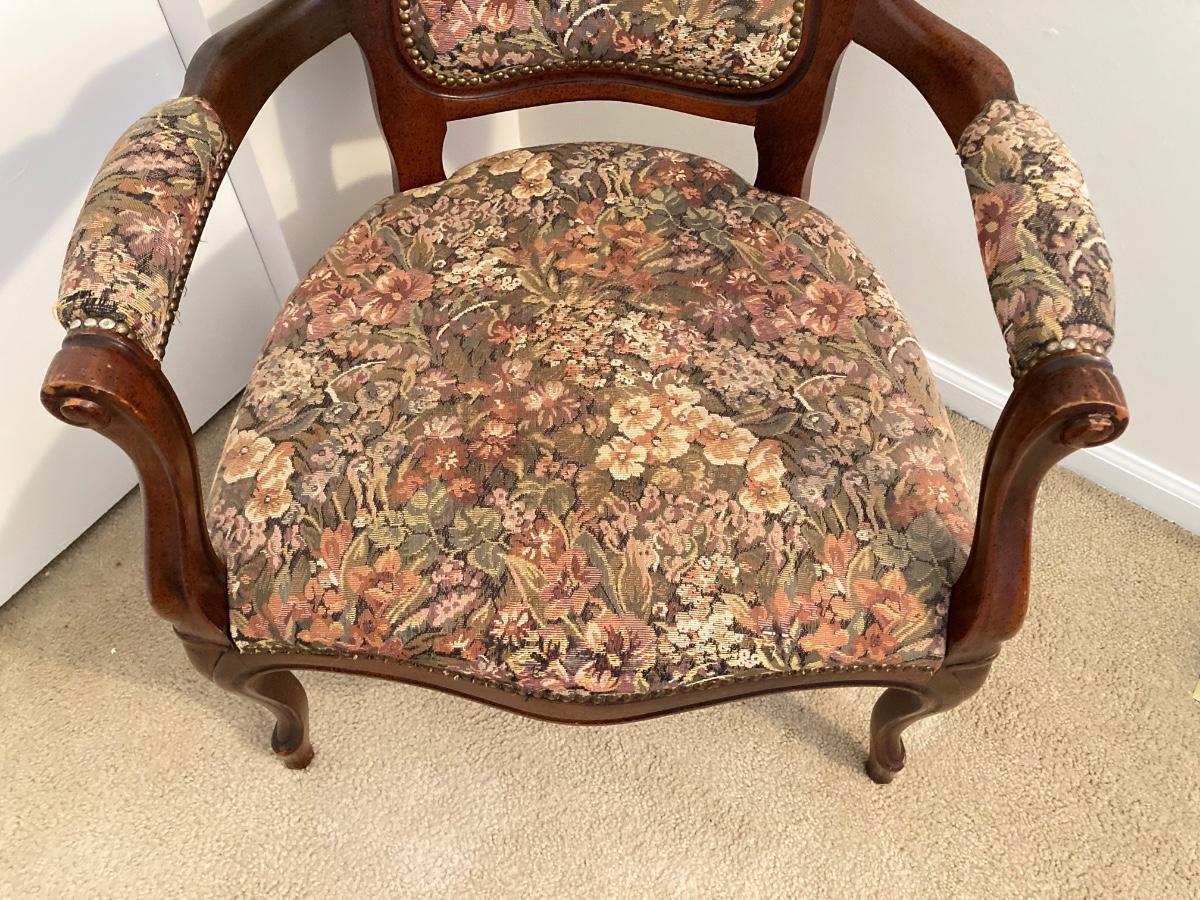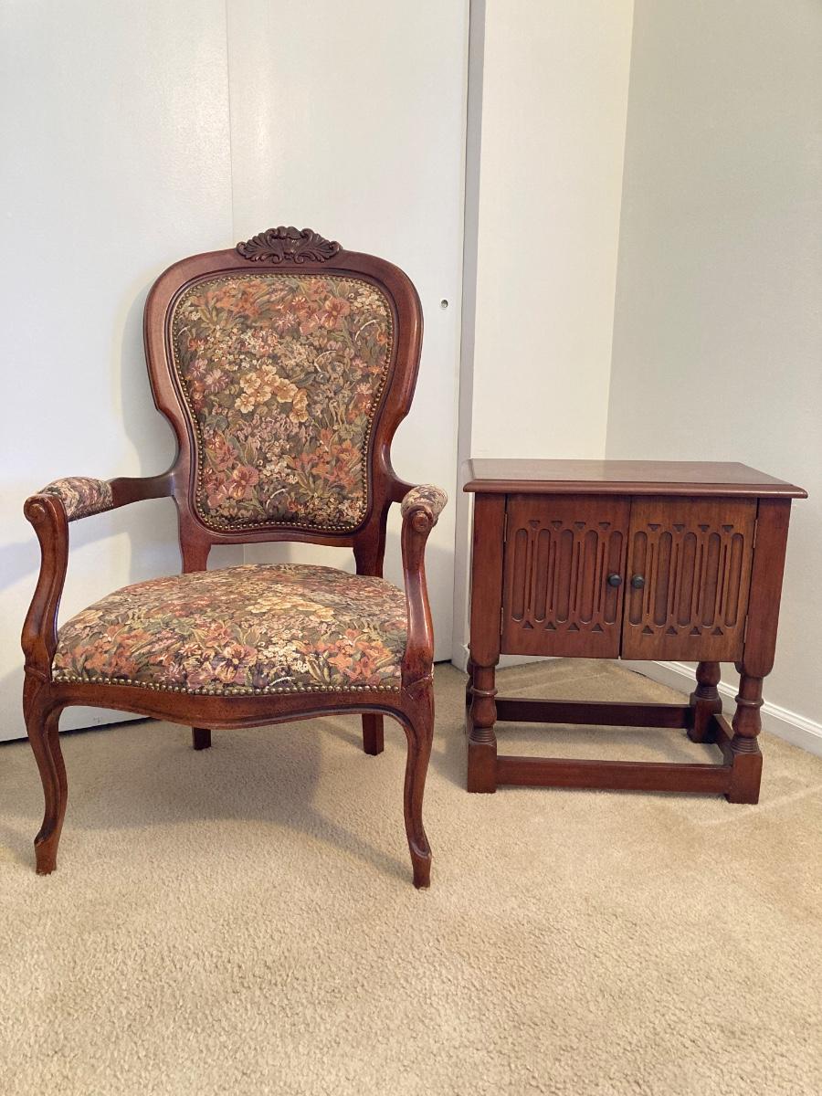 LOT 56: Italy Queen Anne Wood Carved Floral Print Arm Chair (Pulaski Furniture) and Wood Side Table