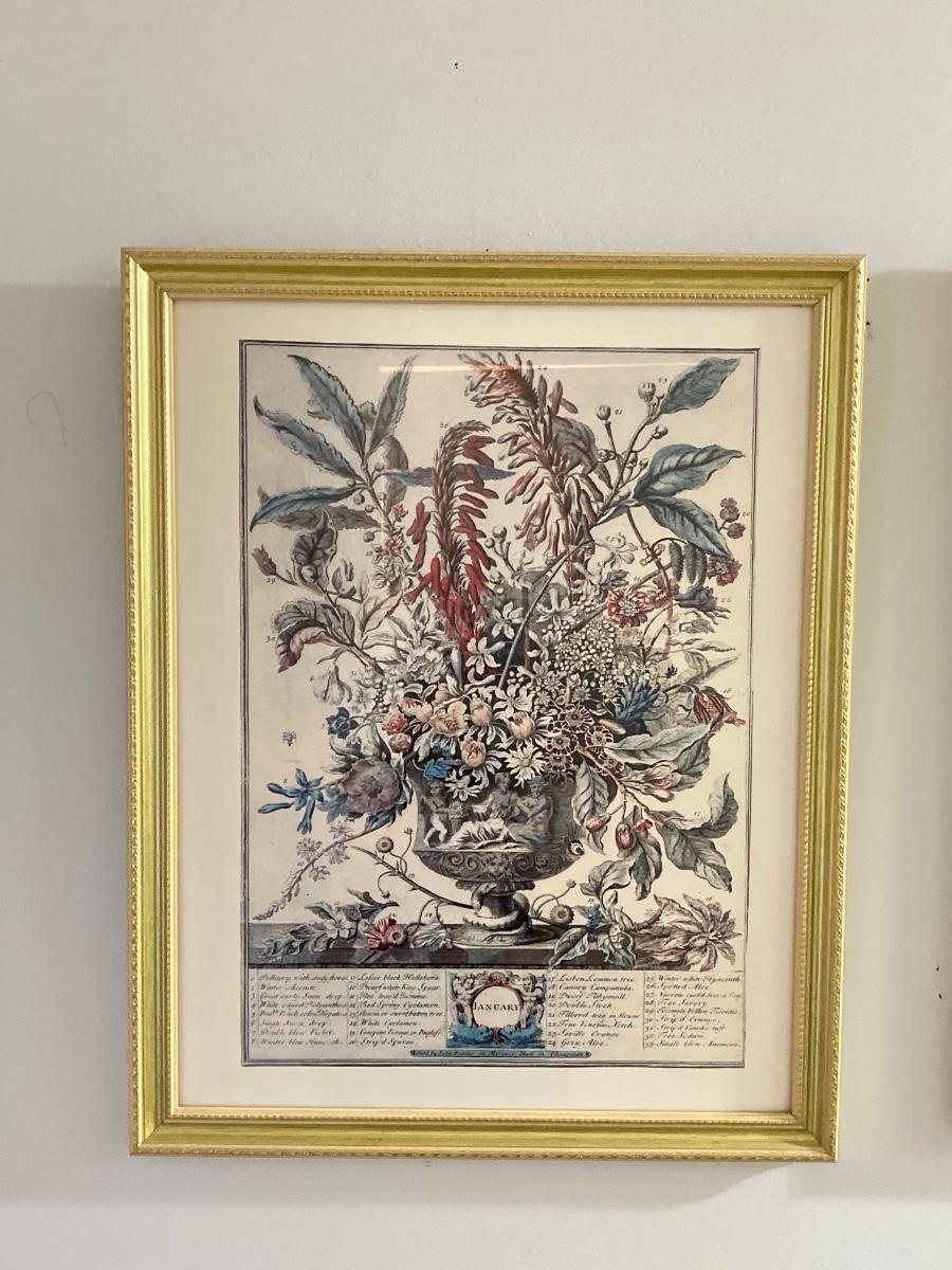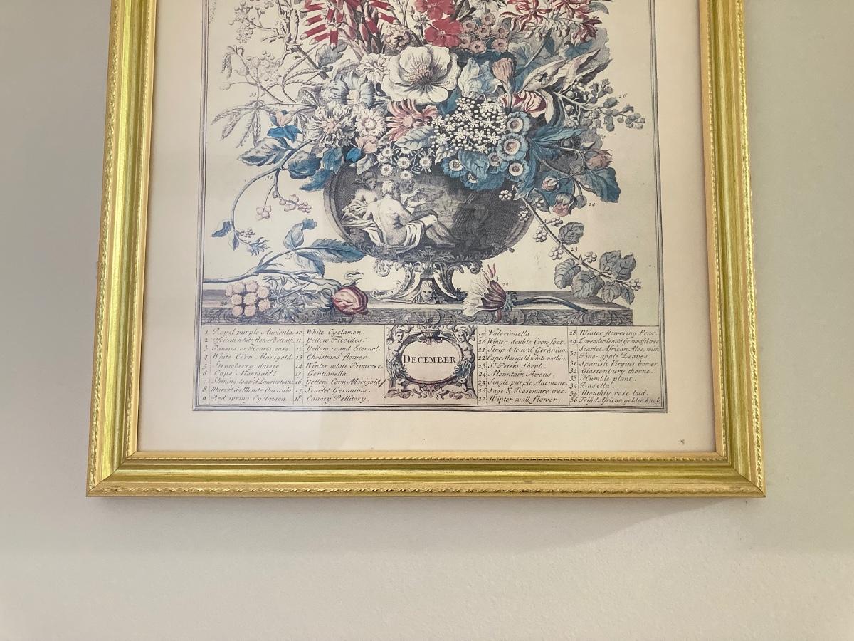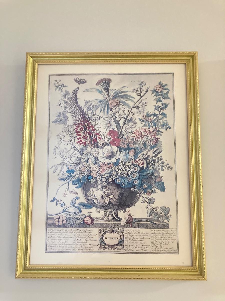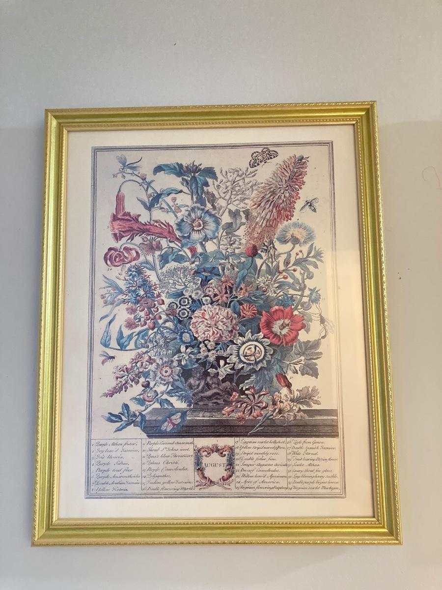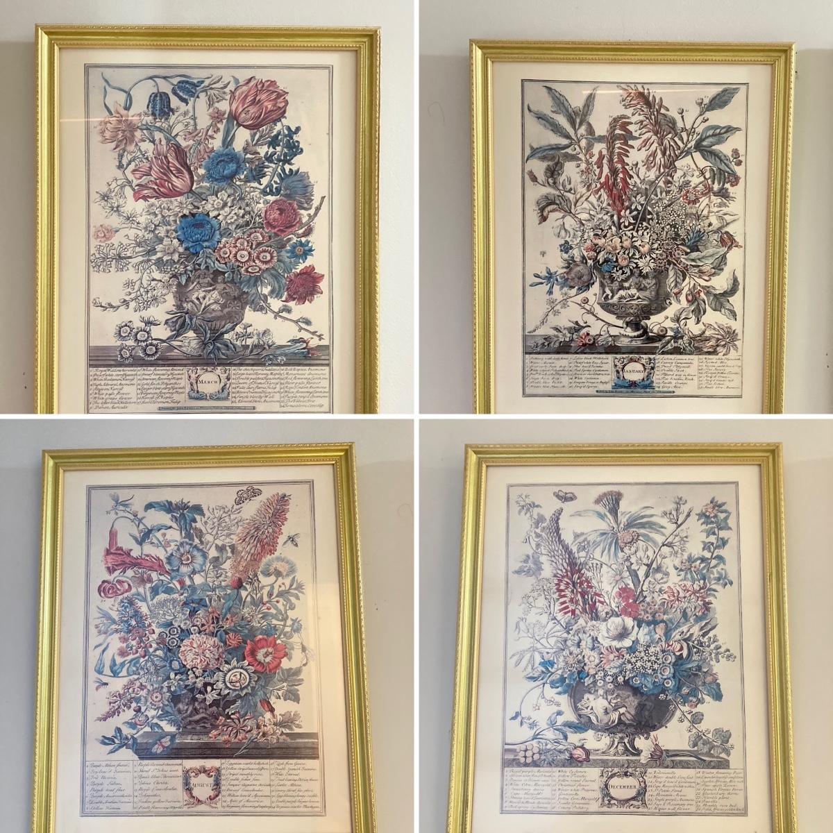 LOT 60: Four Botanical Gold Tone Framed Prints (January, March, August and December)