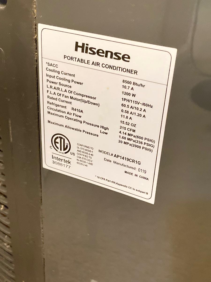 LOT 62: Hisense Portable Air Conditioner Model # AP1419CR1G