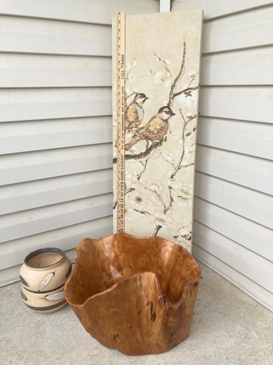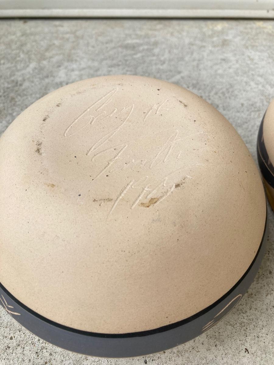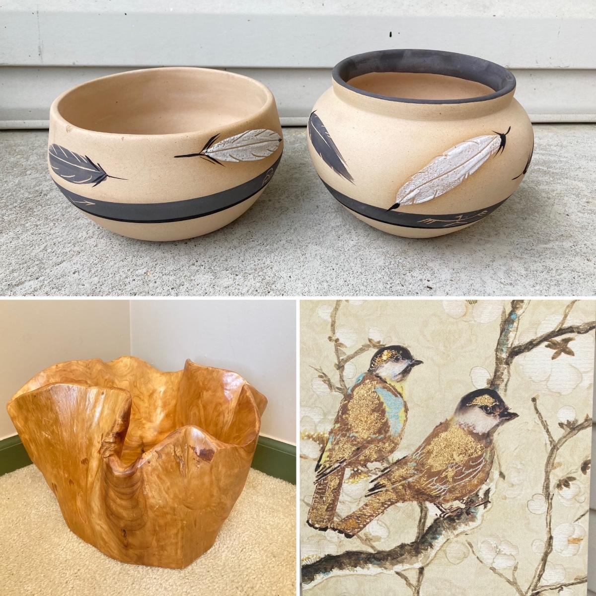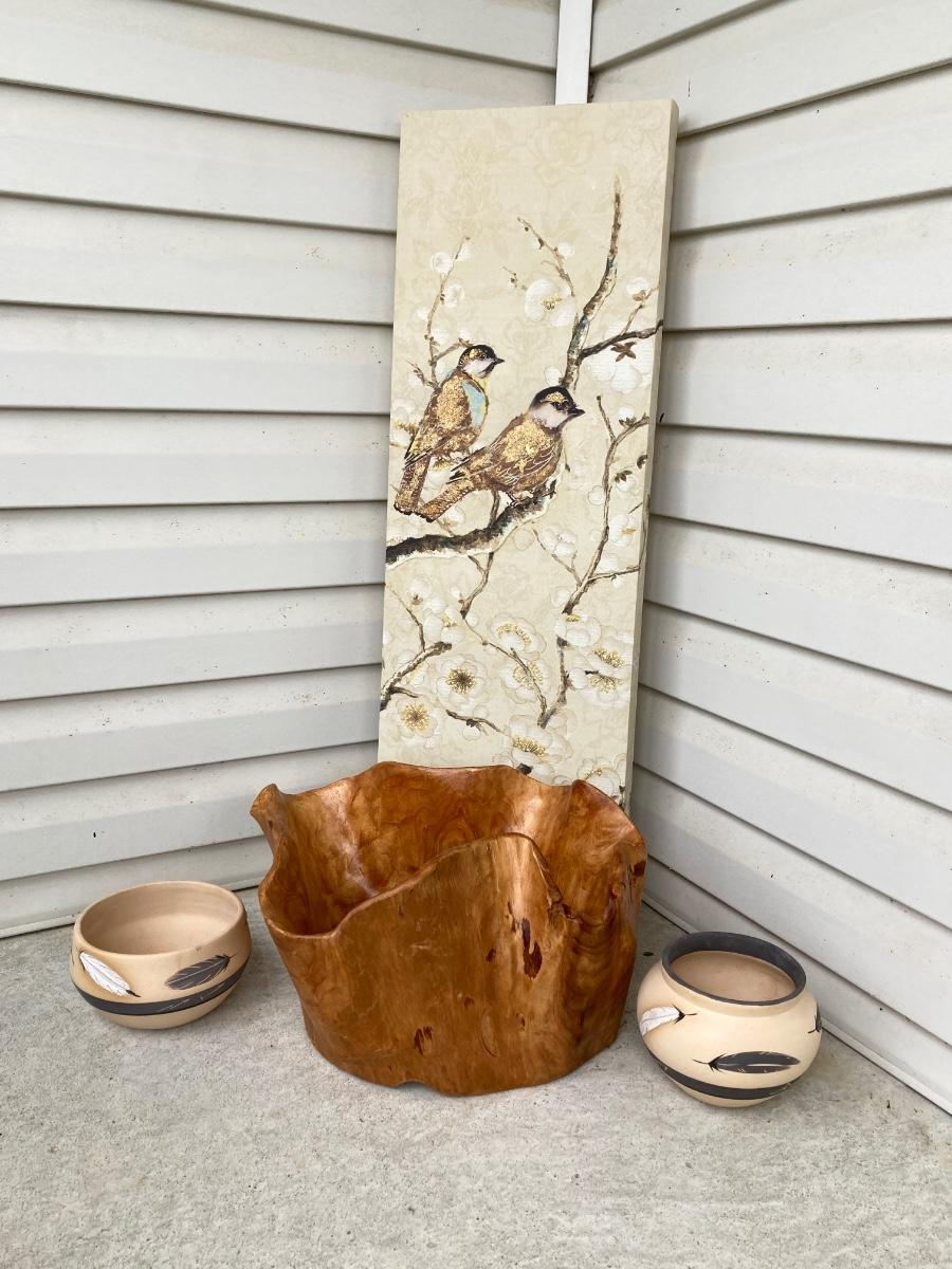 LOT 87: D'Ecco Decorative Wooden Bowl, Pair of Signed Pottery Bowls and Painted Canvas Wall Art