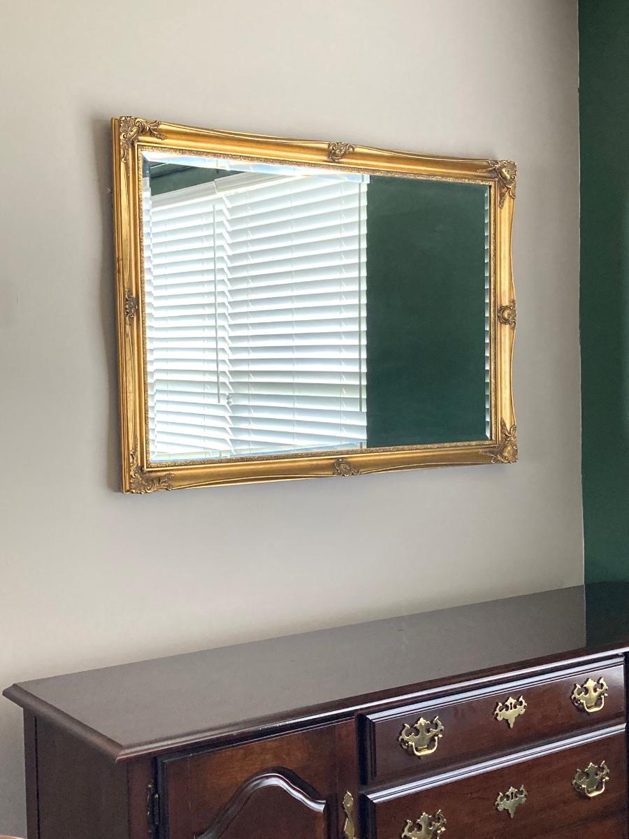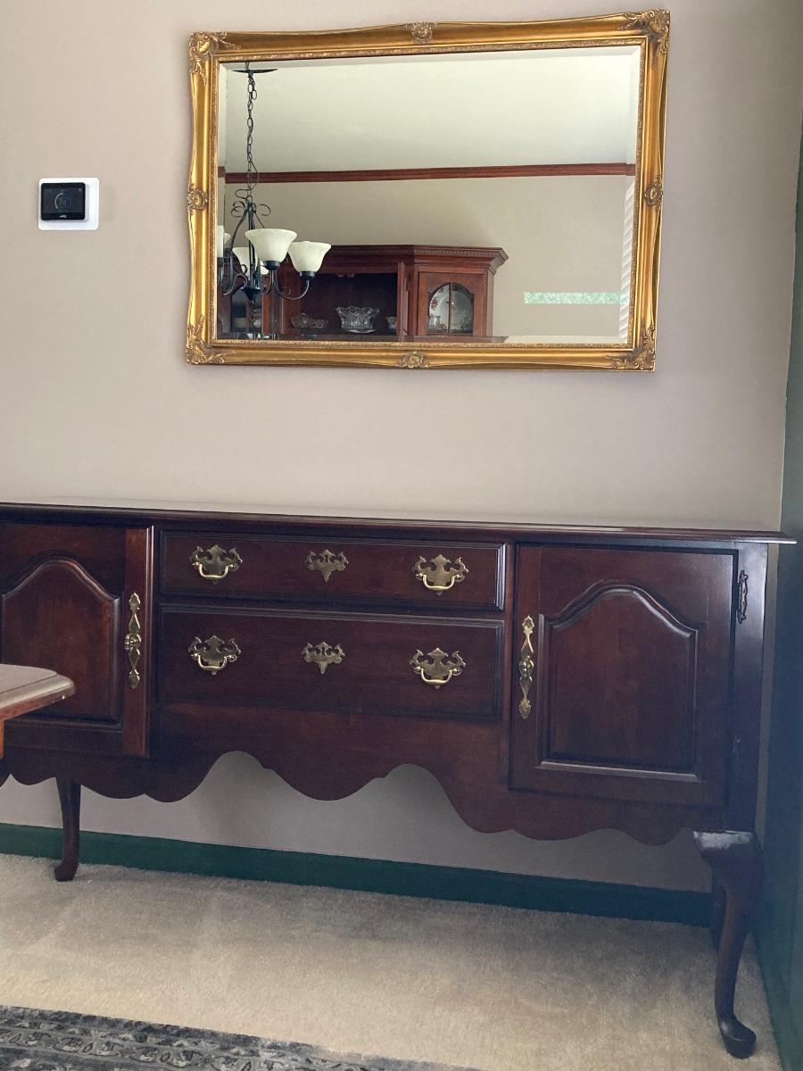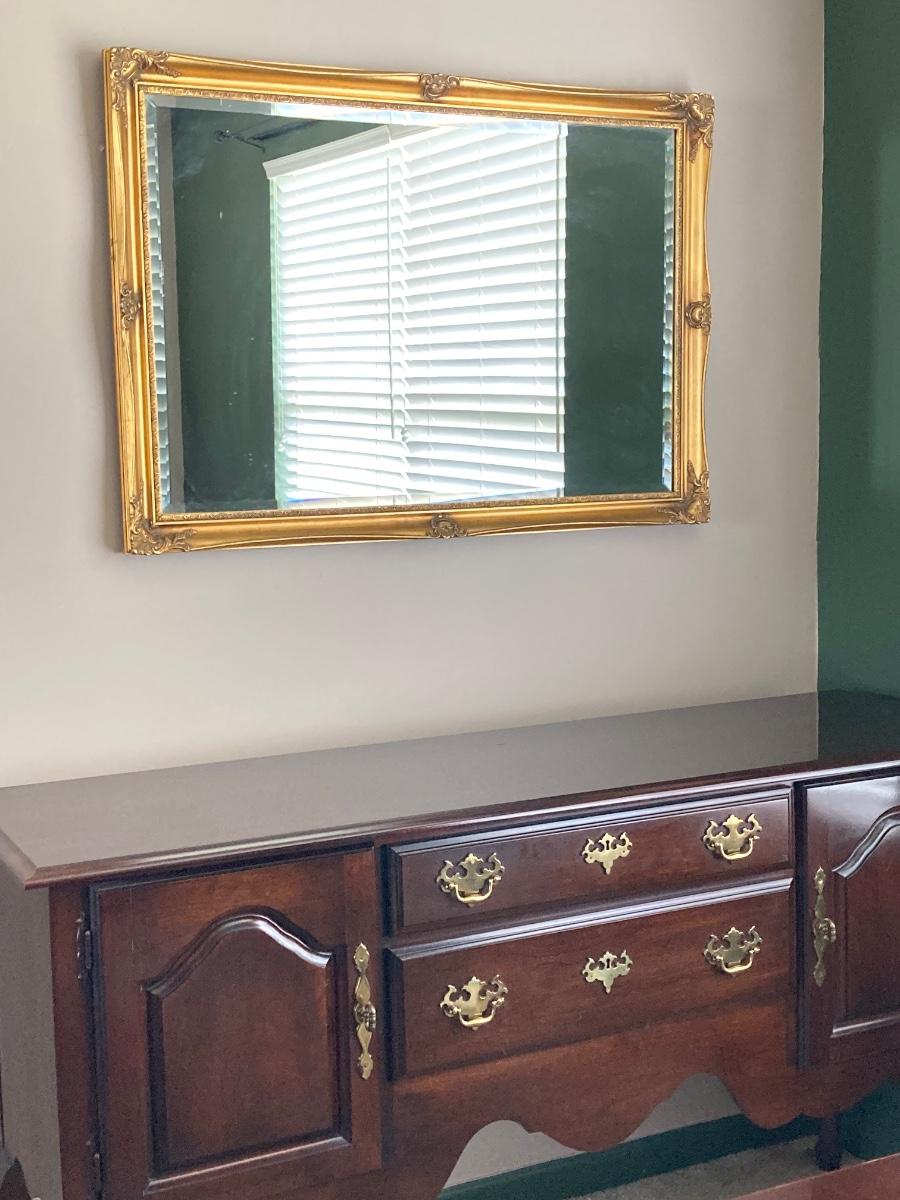 LOT 100: Wood Side / Serving Table with Decorative Gold Framed Mirror