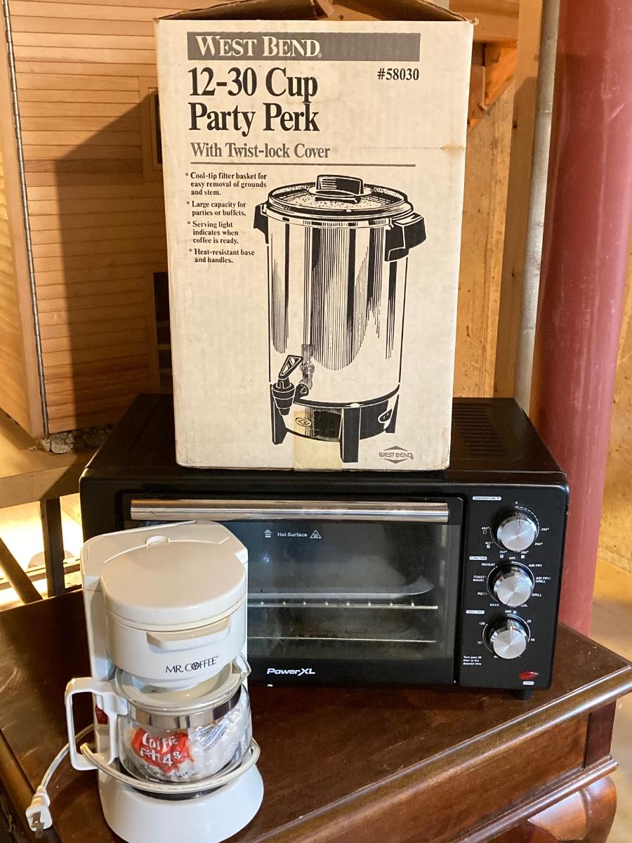 LOT 106: PowerXL Toaster Oven, 12-30 Cup Party Perk Coffee Maker and Small Mr. Coffee Coffee Maker