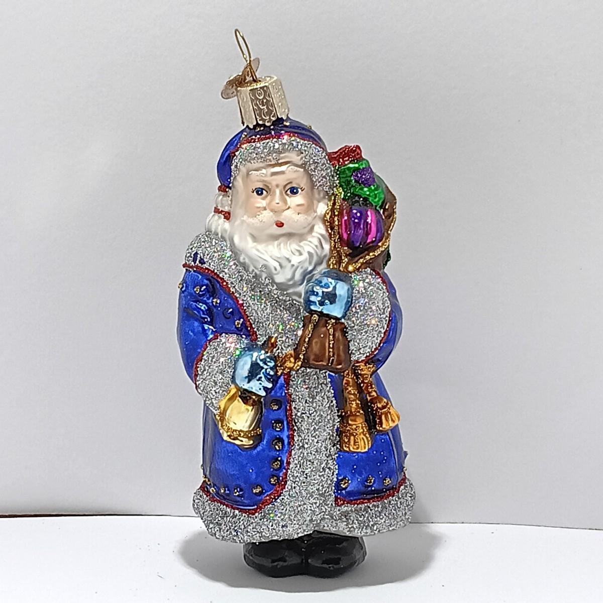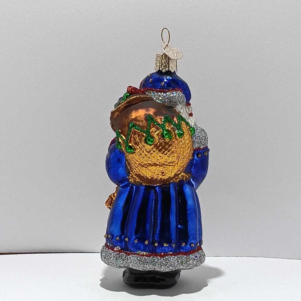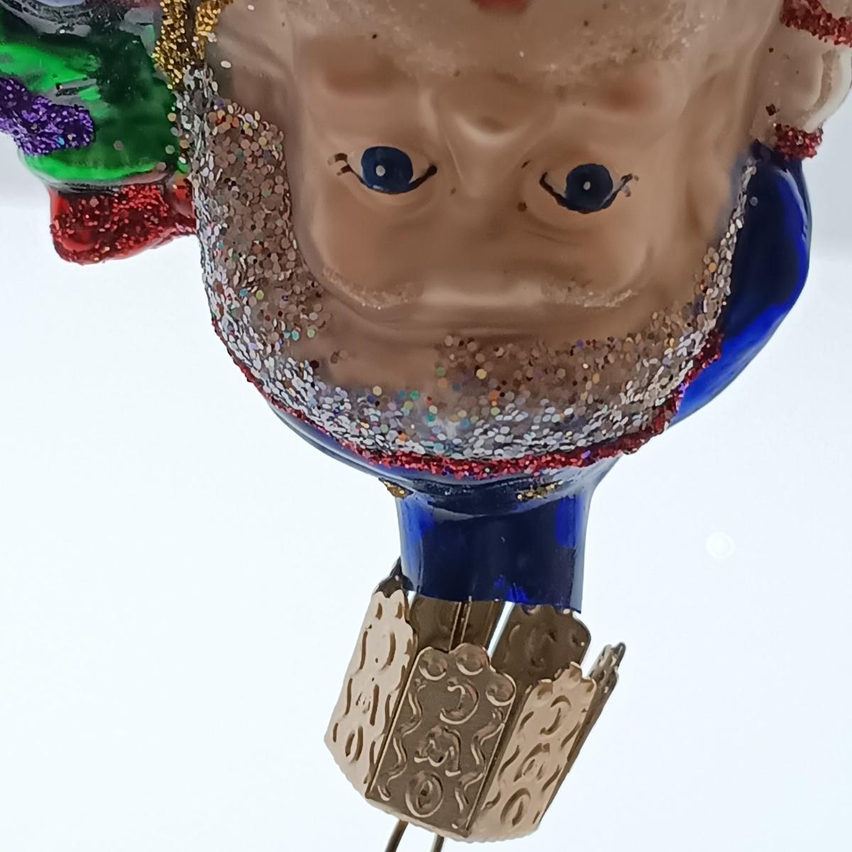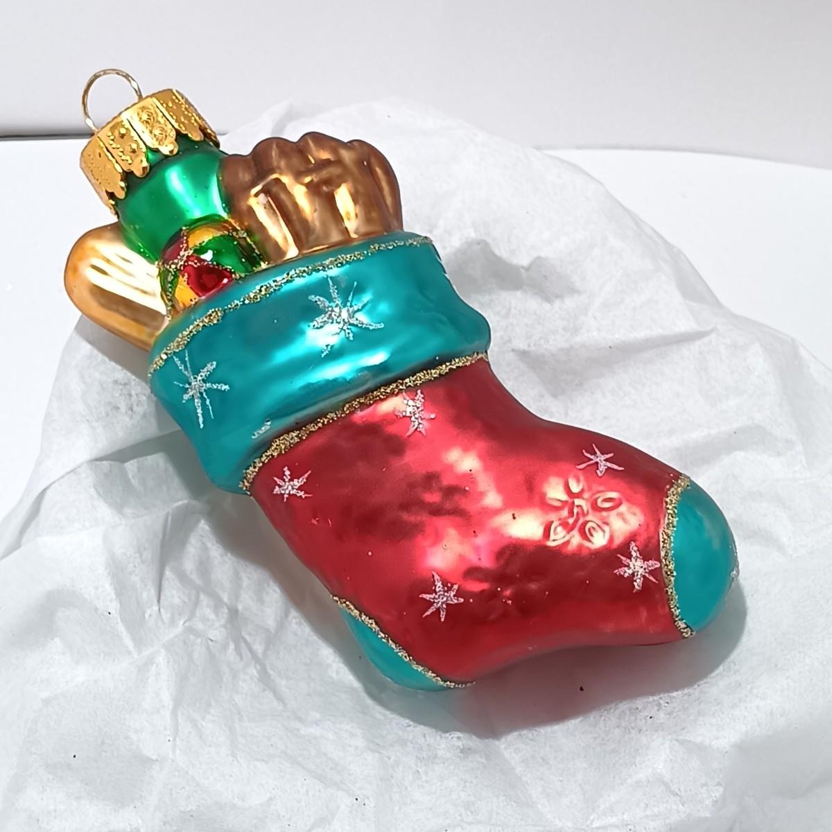 Please note: The top of the Father Christmas ornament has a chip under the cap, and the stocking is beginning to lose paint near the bottom.