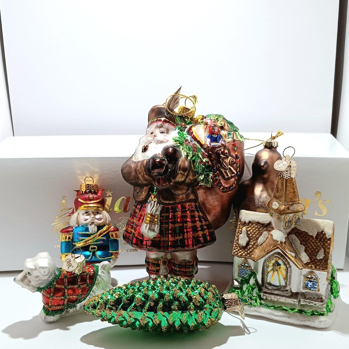 LOT 114: Vintage Highland Santa w/ Old World Chistmas Ornaments & More