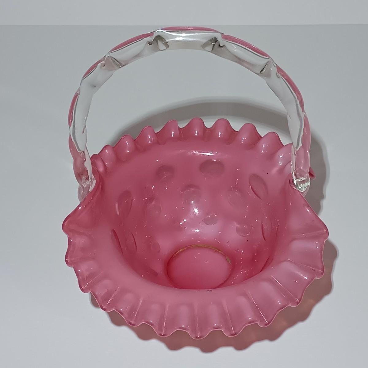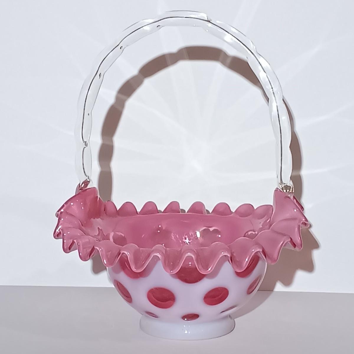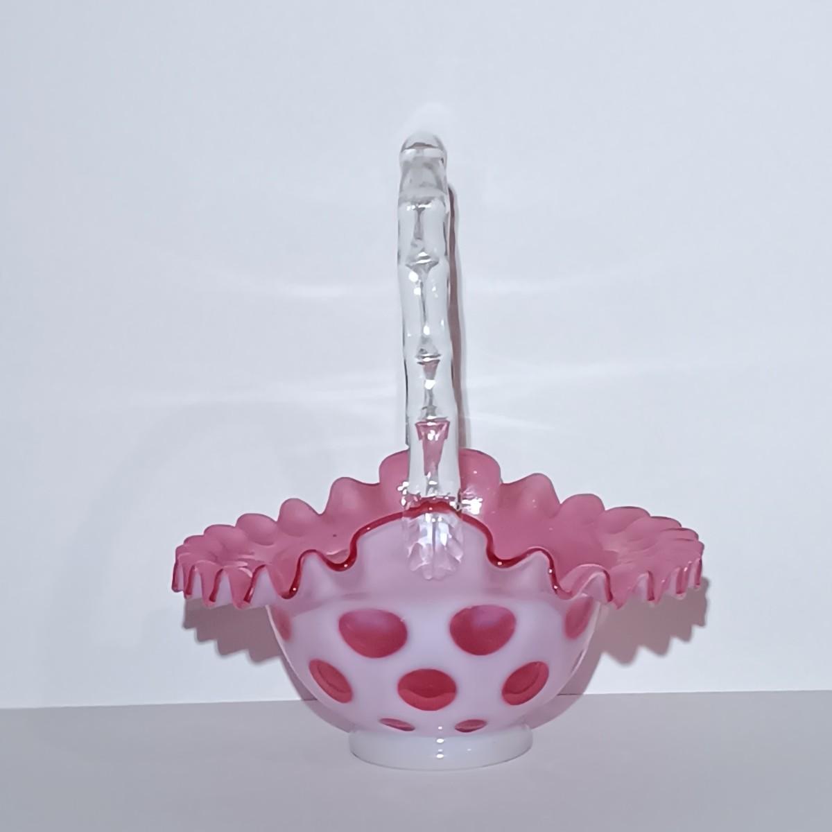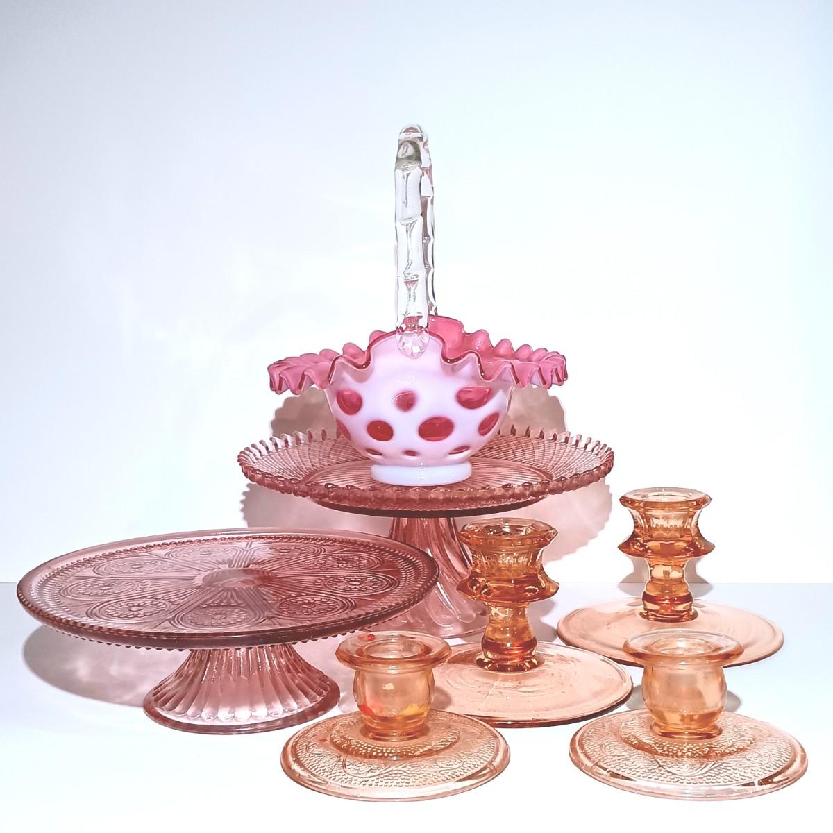 LOT 131: Vintage Cranberry Glass Coin Dot Basket w/ Pink Glass Cake Stands & Candlestick Holders