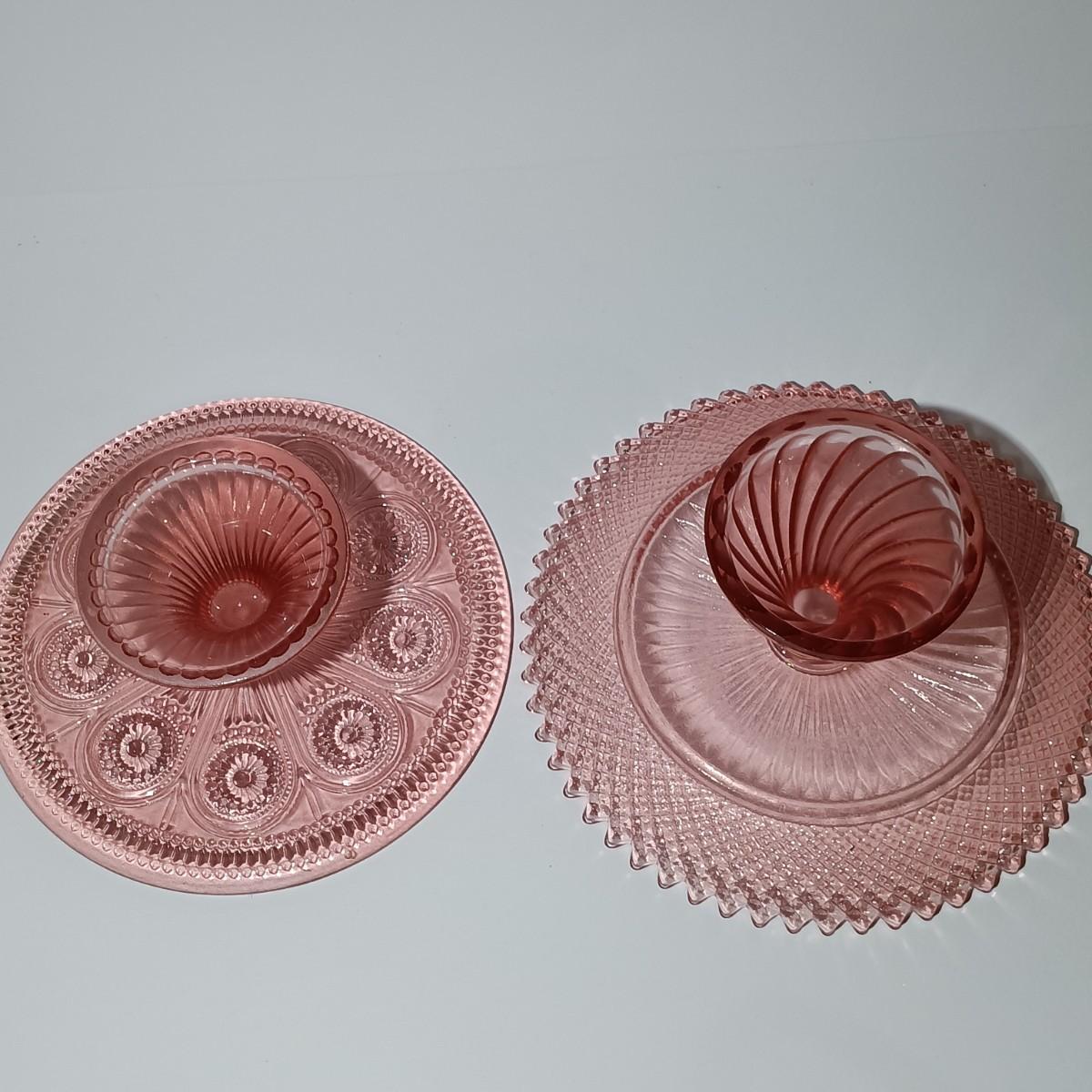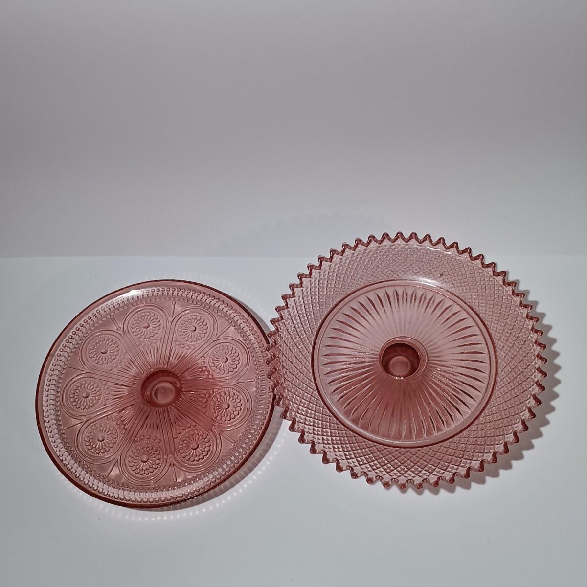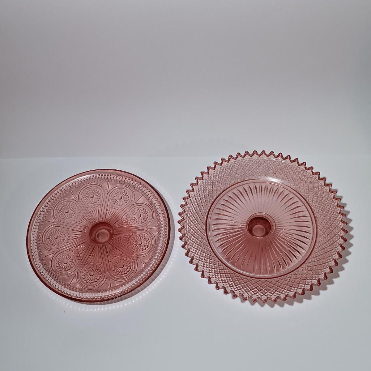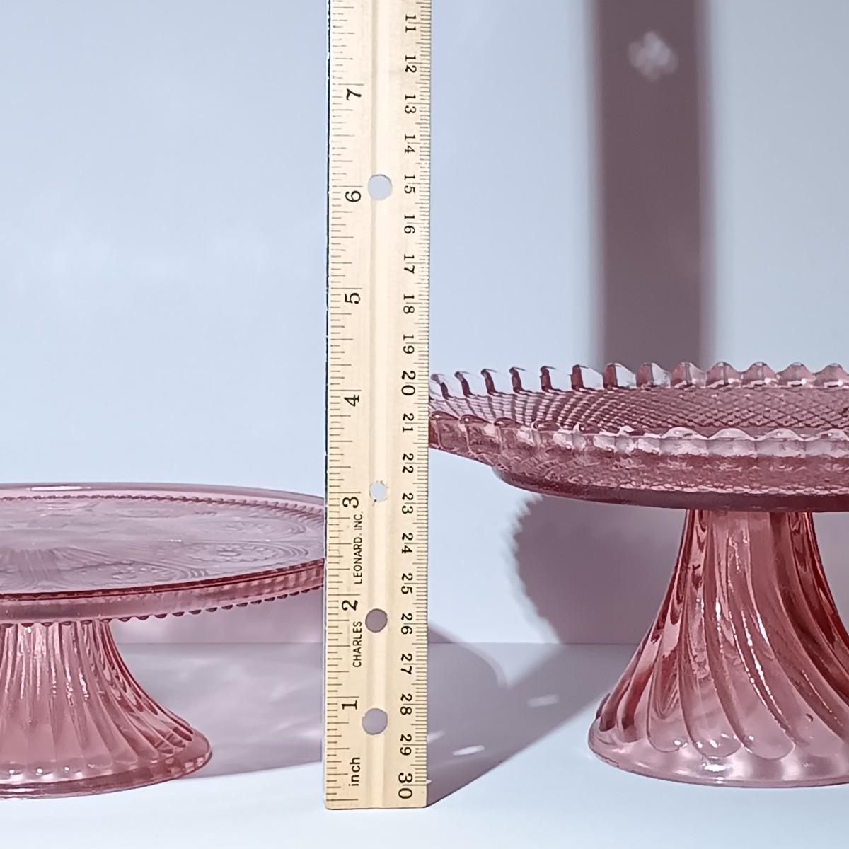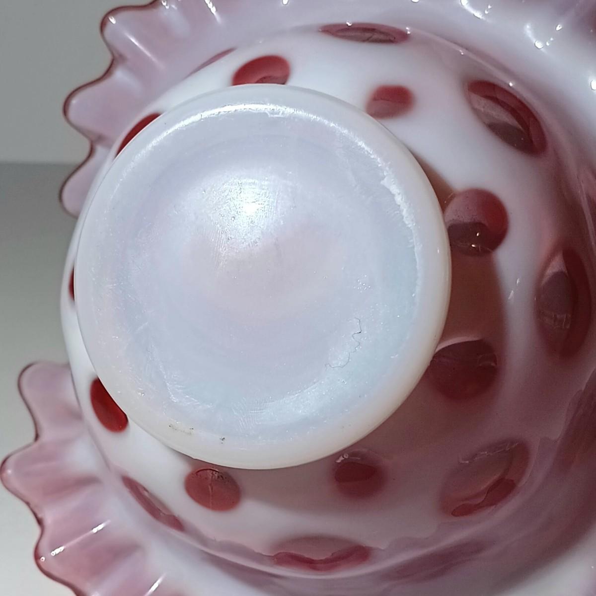 LOT 131: Vintage Cranberry Glass Coin Dot Basket w/ Pink Glass Cake Stands & Candlestick Holders