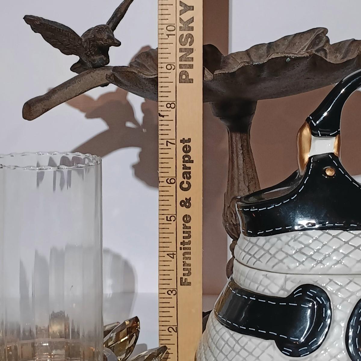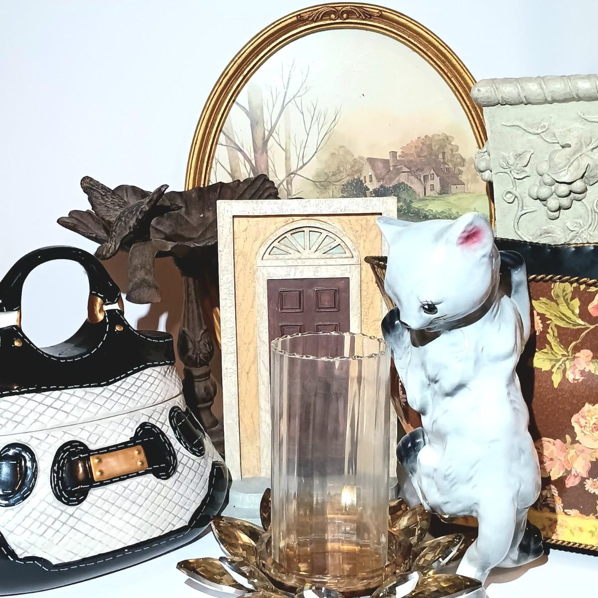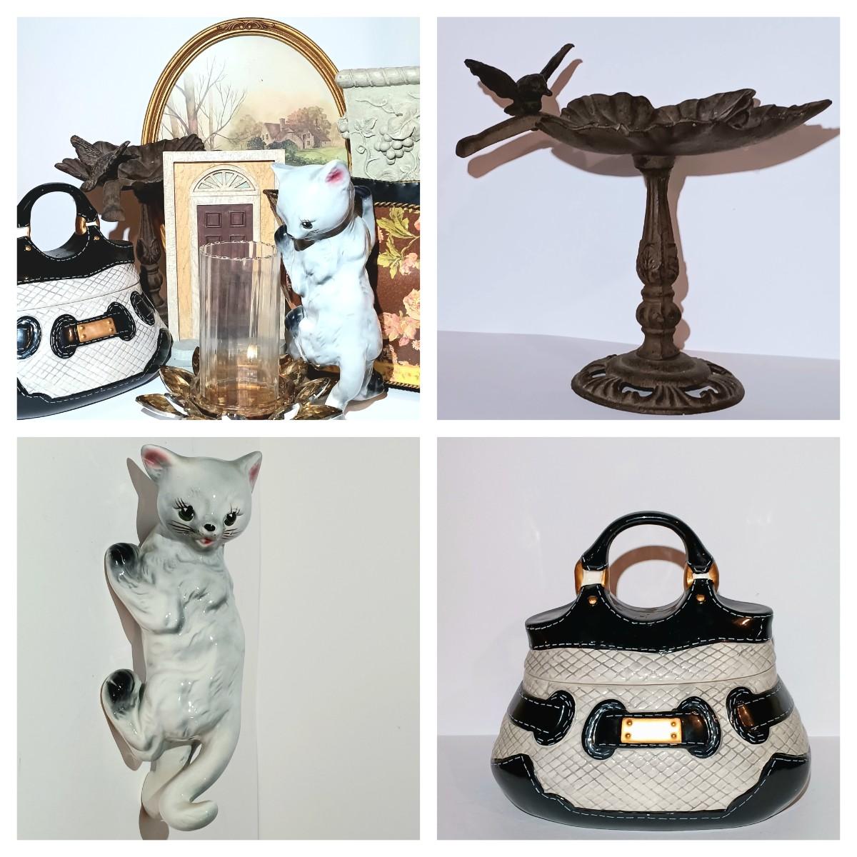 LOT 134: Vintage Ceramic Climbing Cat, Cast Iron Bird Feeder, Cookie Jar Purse & More