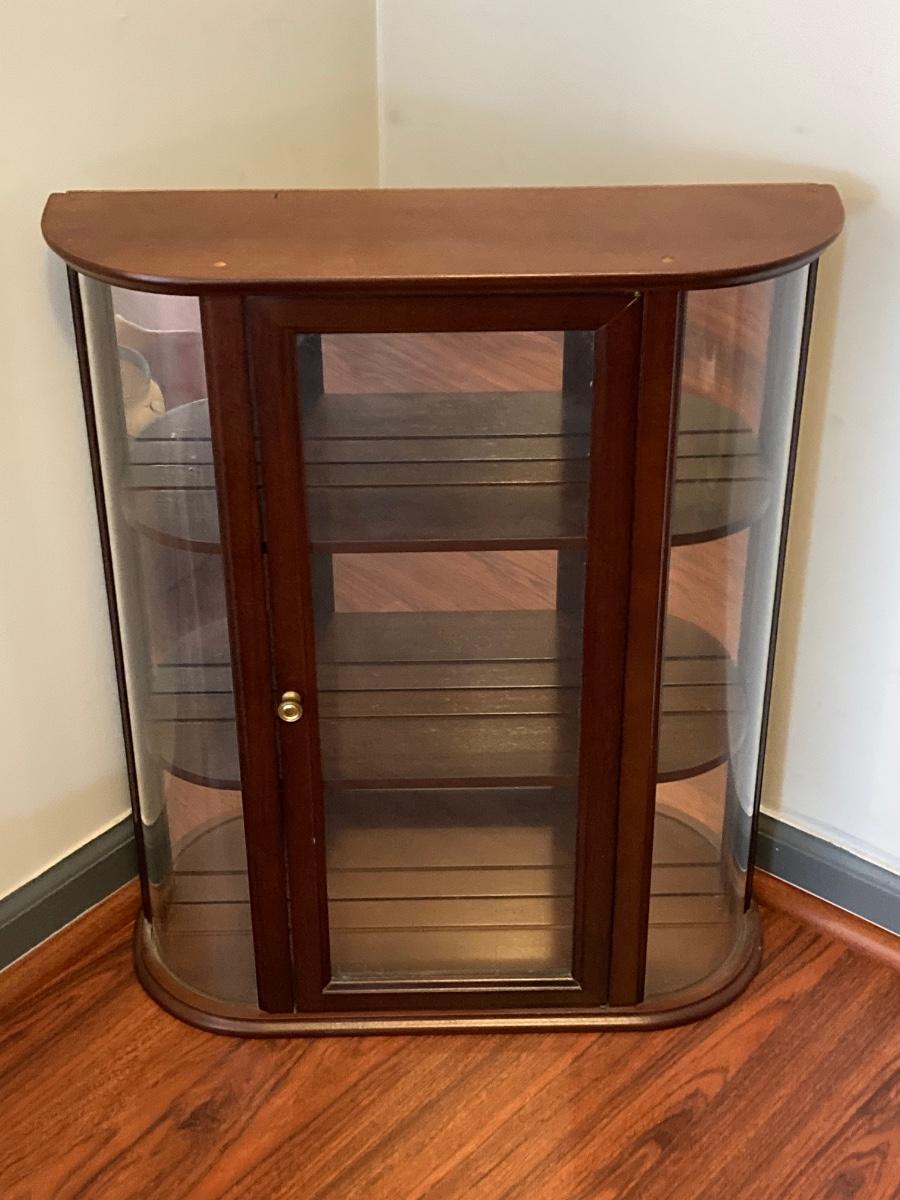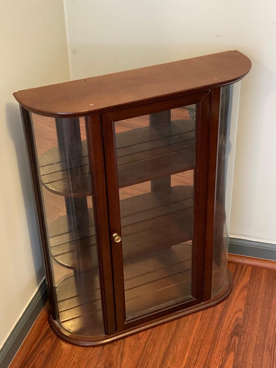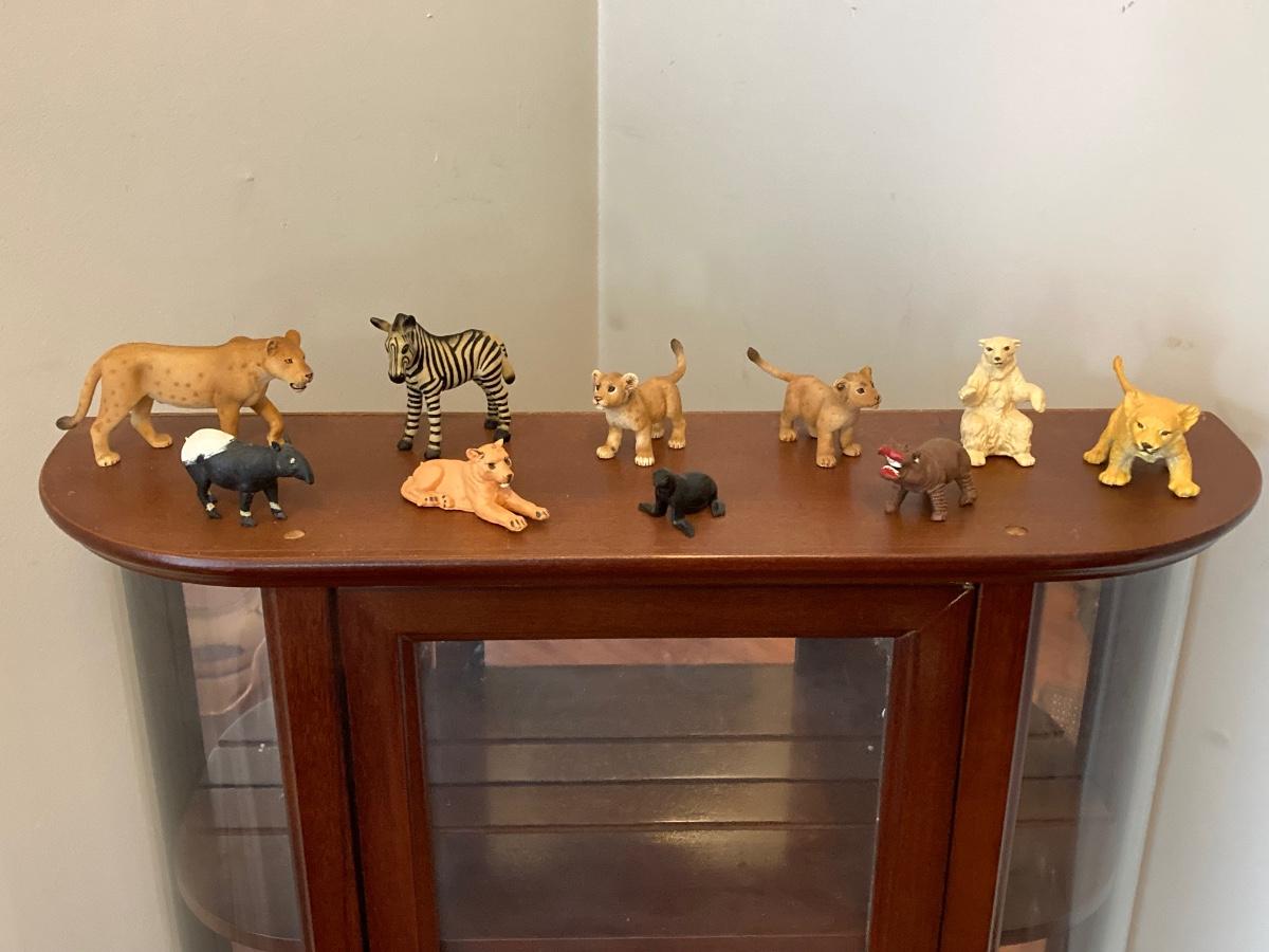 LOT 163: The Bombay Company's Wooden Display Cabinet with Glass Shelves and Curved Glass Sides with Collection of Animal Figurines (Britains, Schleich and More)