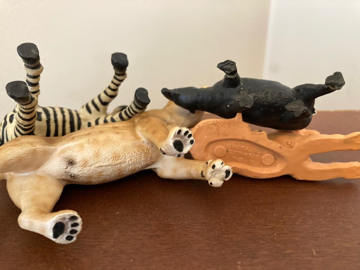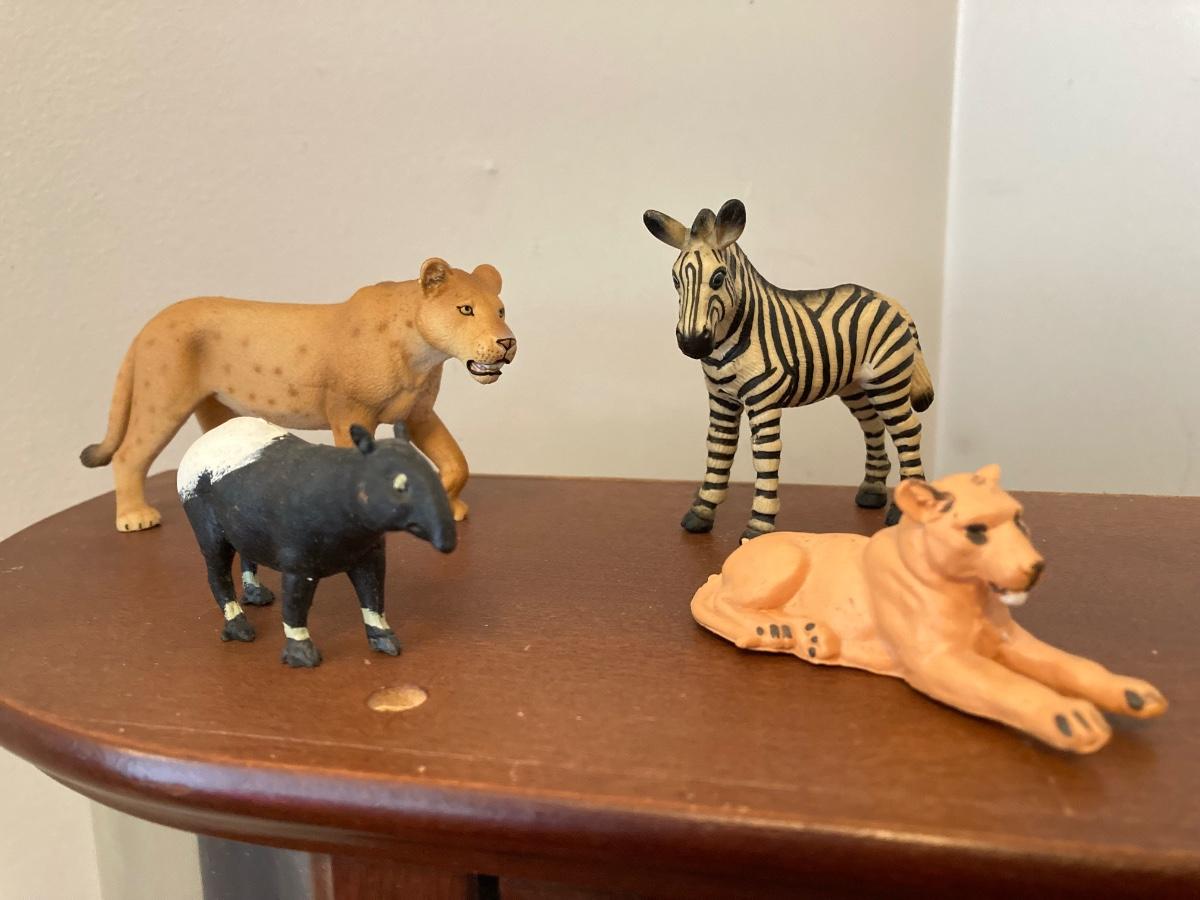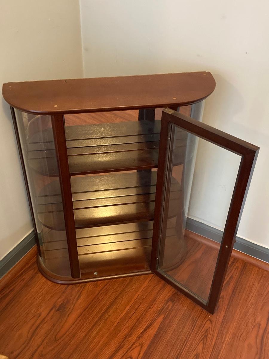 LOT 163: The Bombay Company's Wooden Display Cabinet with Glass Shelves and Curved Glass Sides with Collection of Animal Figurines (Britains, Schleich and More)