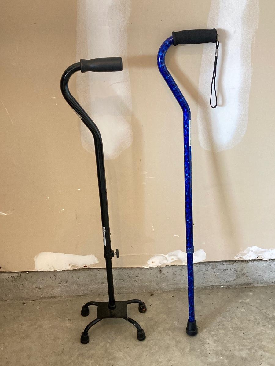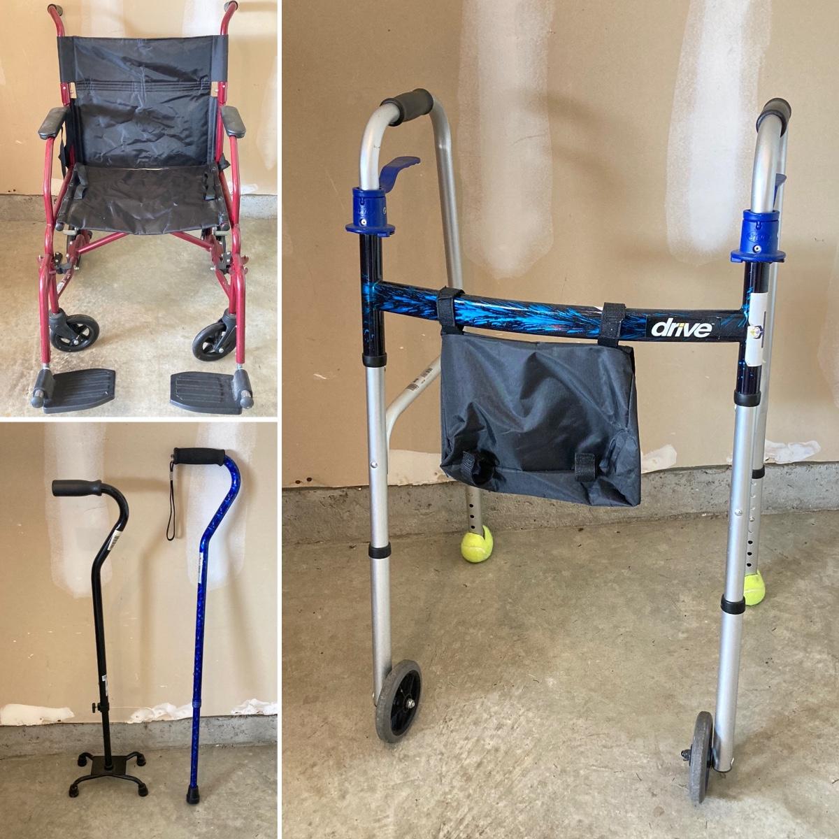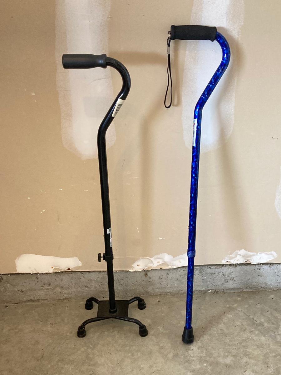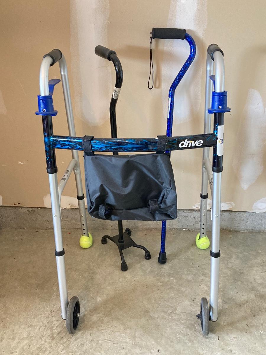 LOT 90: Folding Drive Walker, Transporter, Cup Holder and Two Canes
