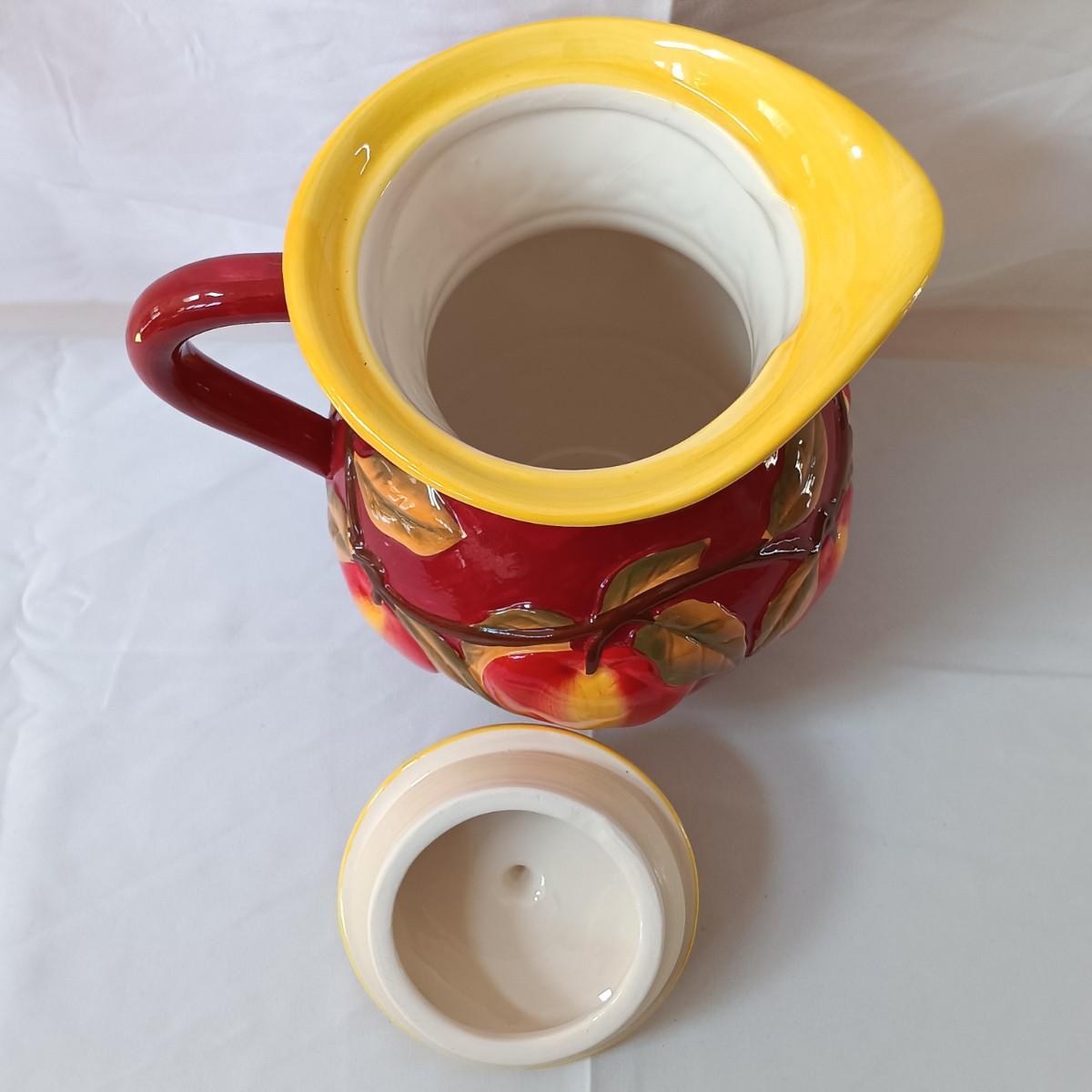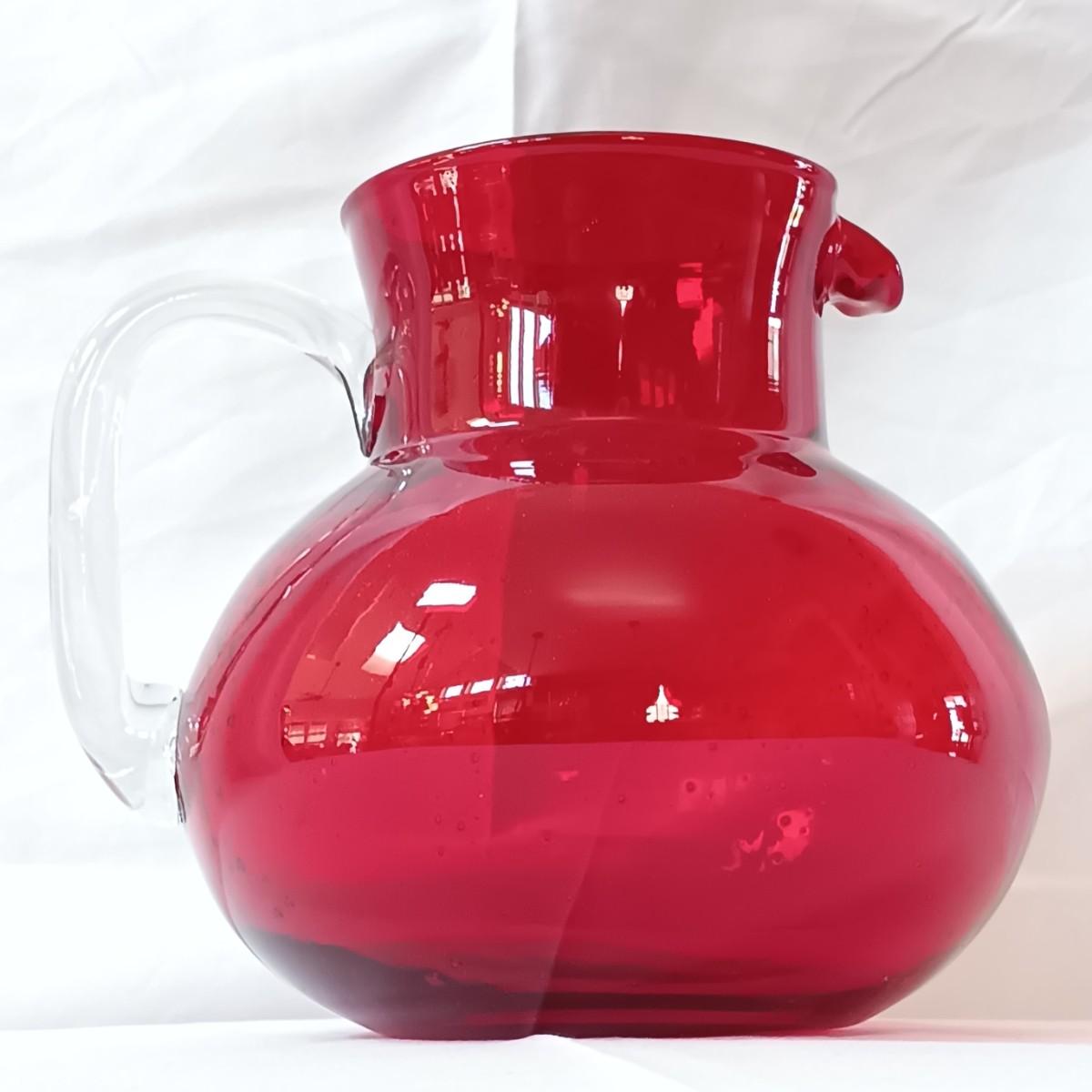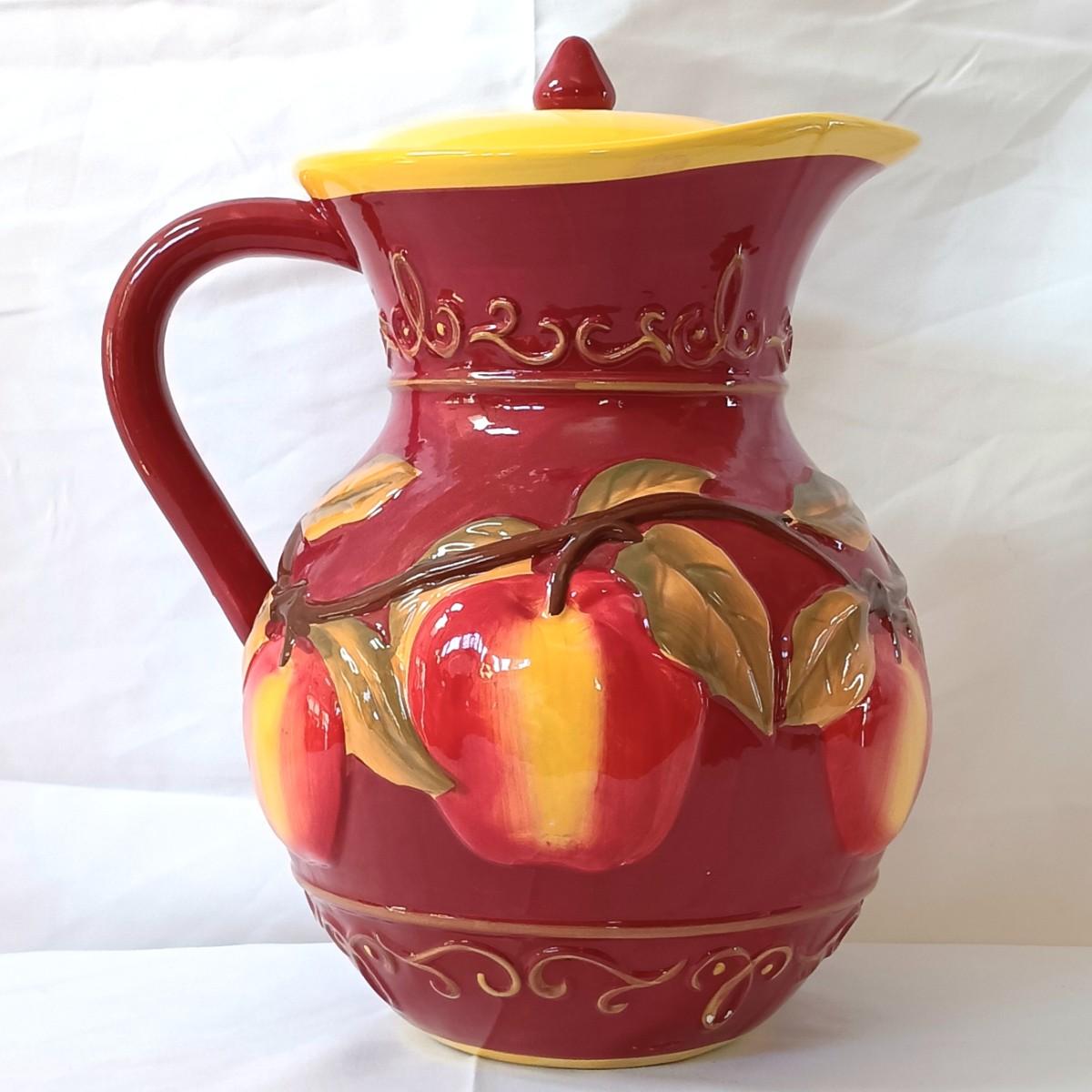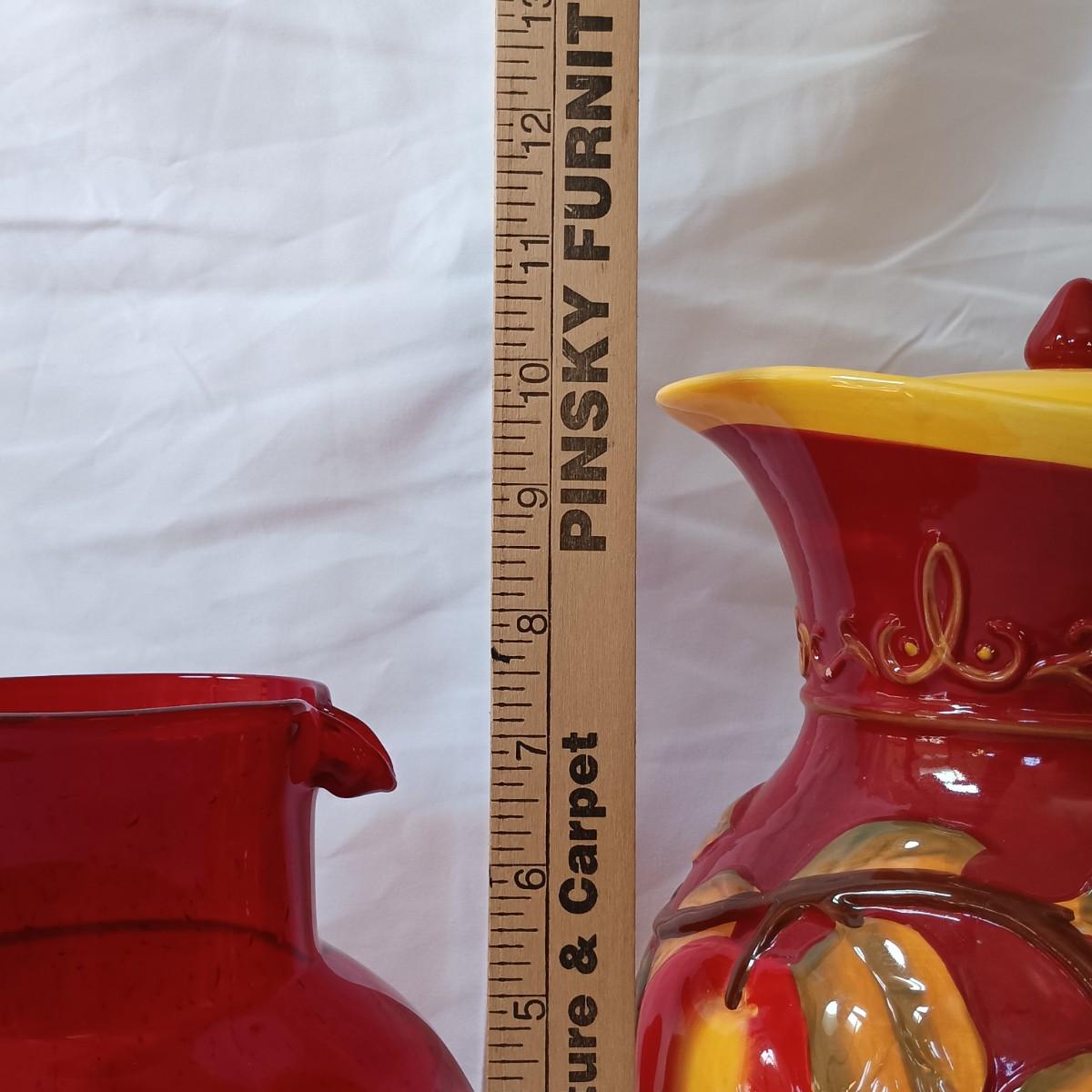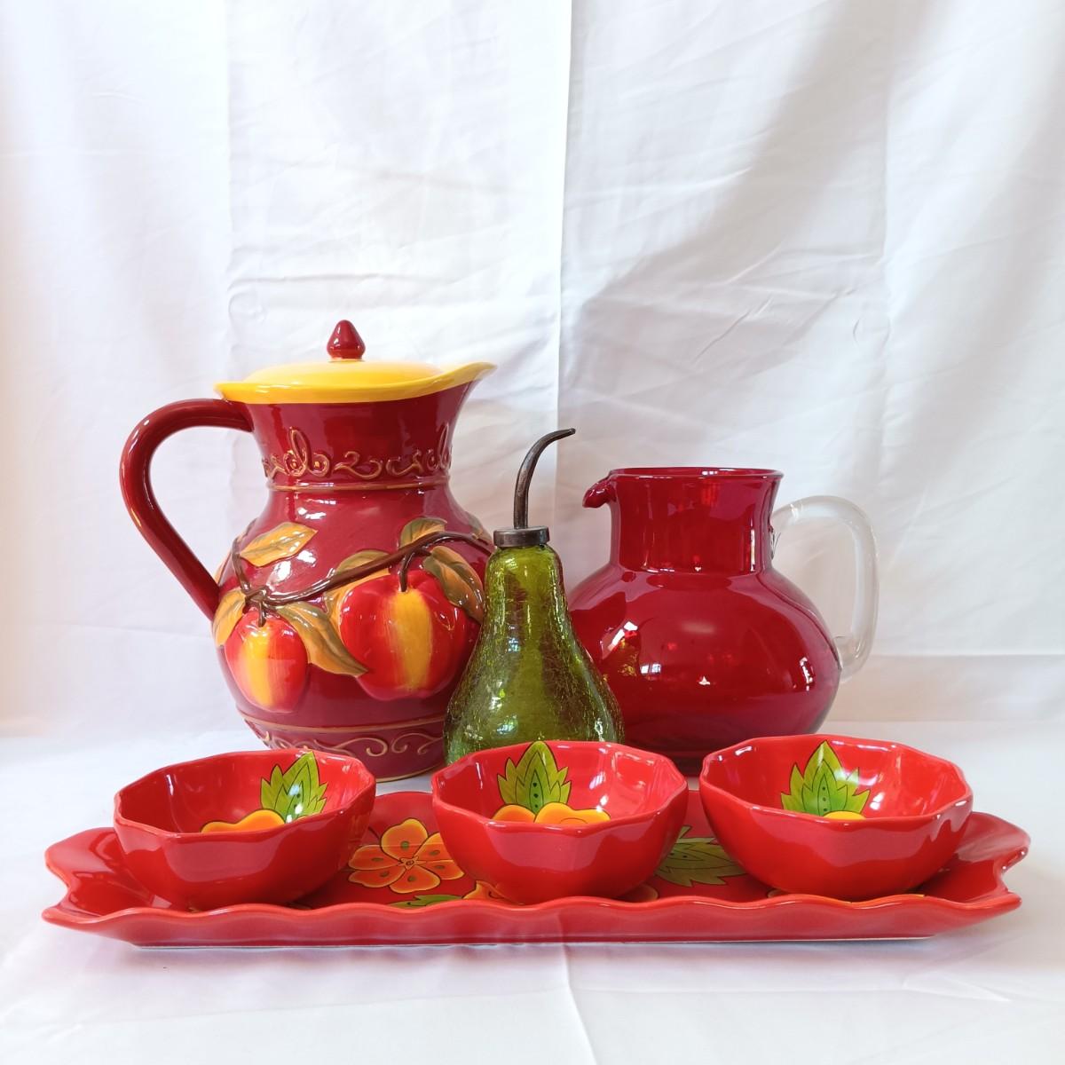 LOT 128: Nonnis Handpainted Pitcher w/ Temp-Tations Poppy Passion Serving Set, Crackle Glass Pear Fruit Fly Trap & Ruby Glass Pitcher