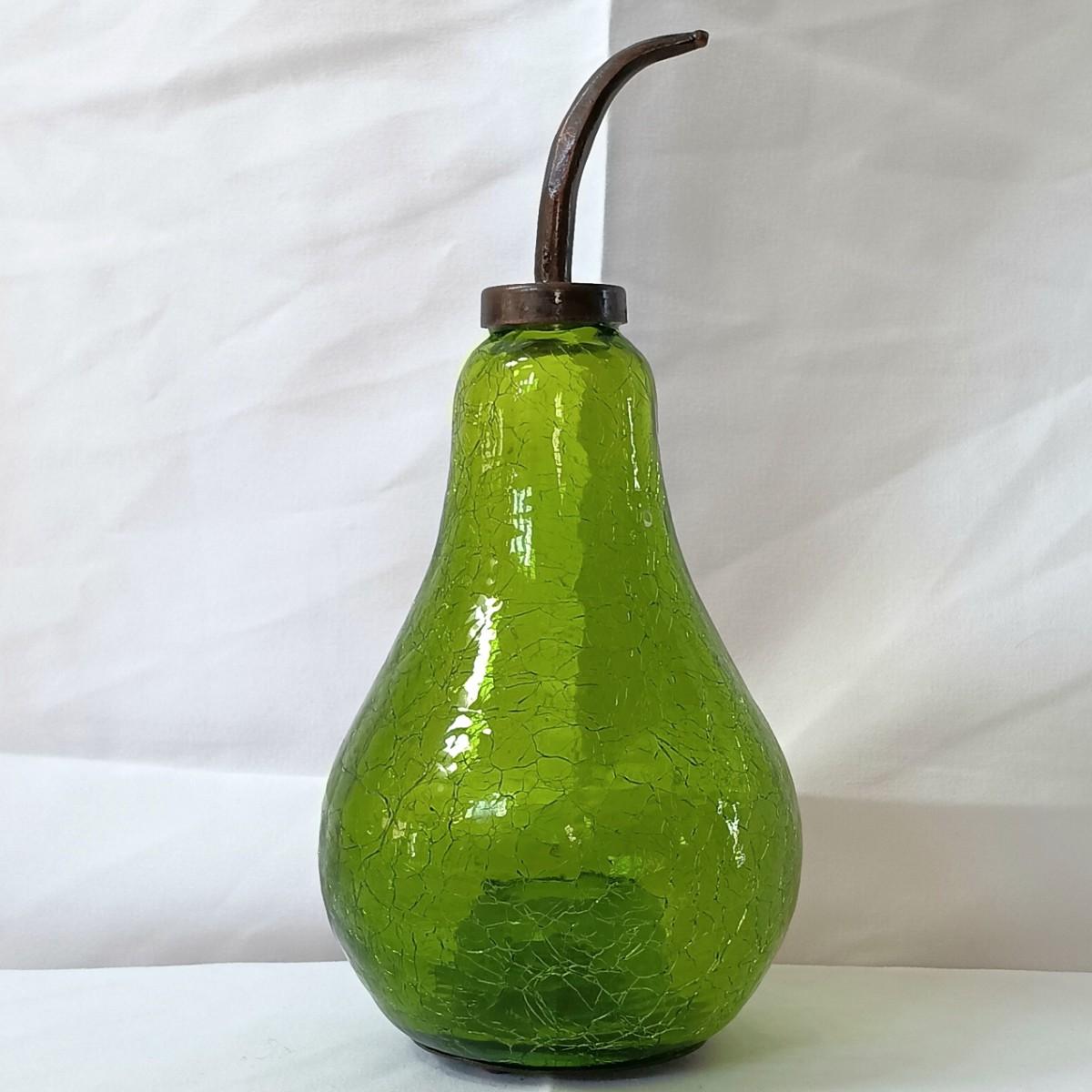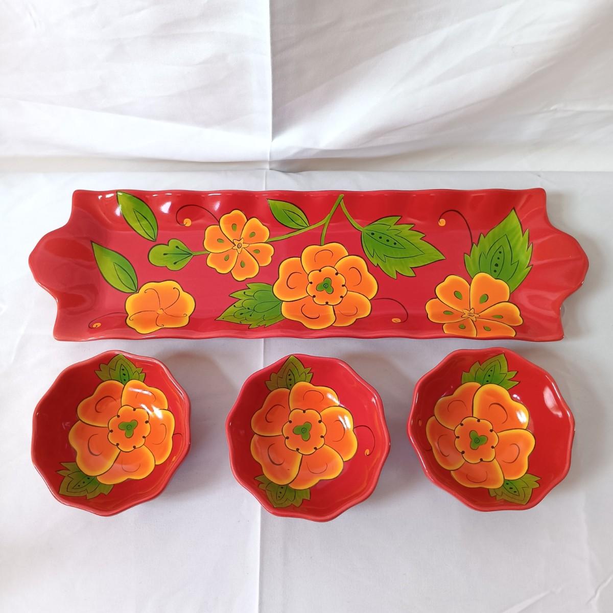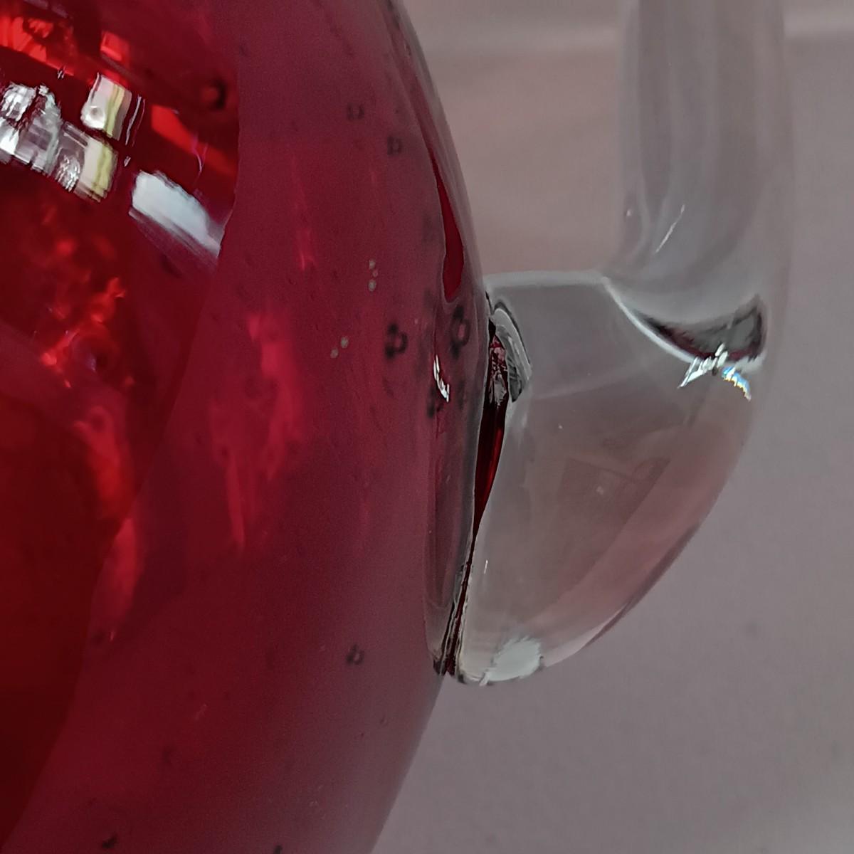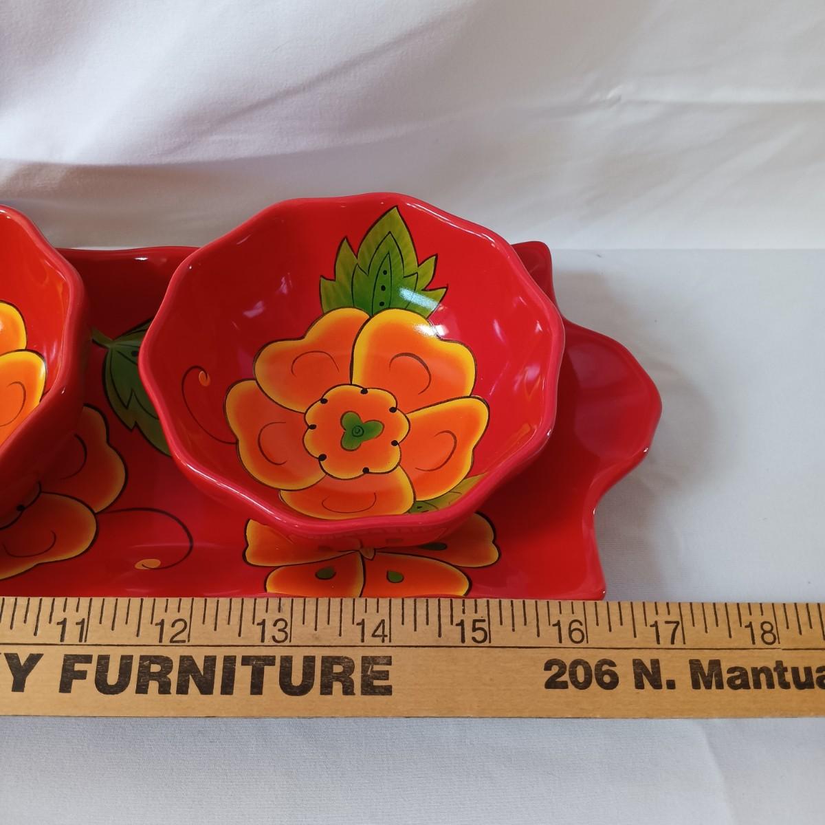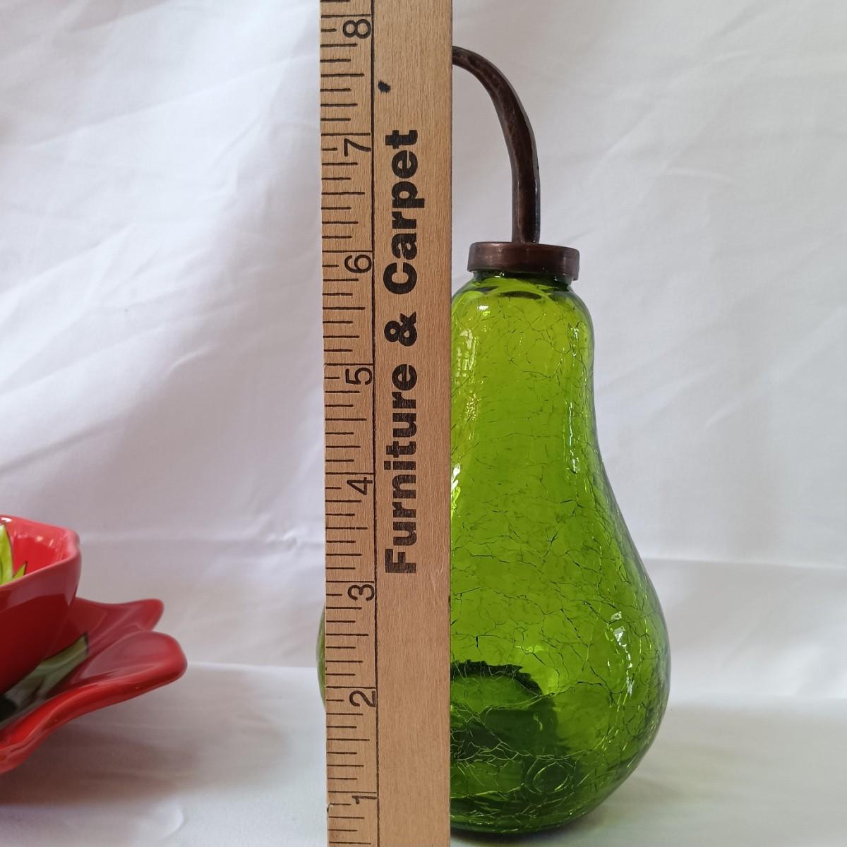 LOT 128: Nonnis Handpainted Pitcher w/ Temp-Tations Poppy Passion Serving Set, Crackle Glass Pear Fruit Fly Trap & Ruby Glass Pitcher