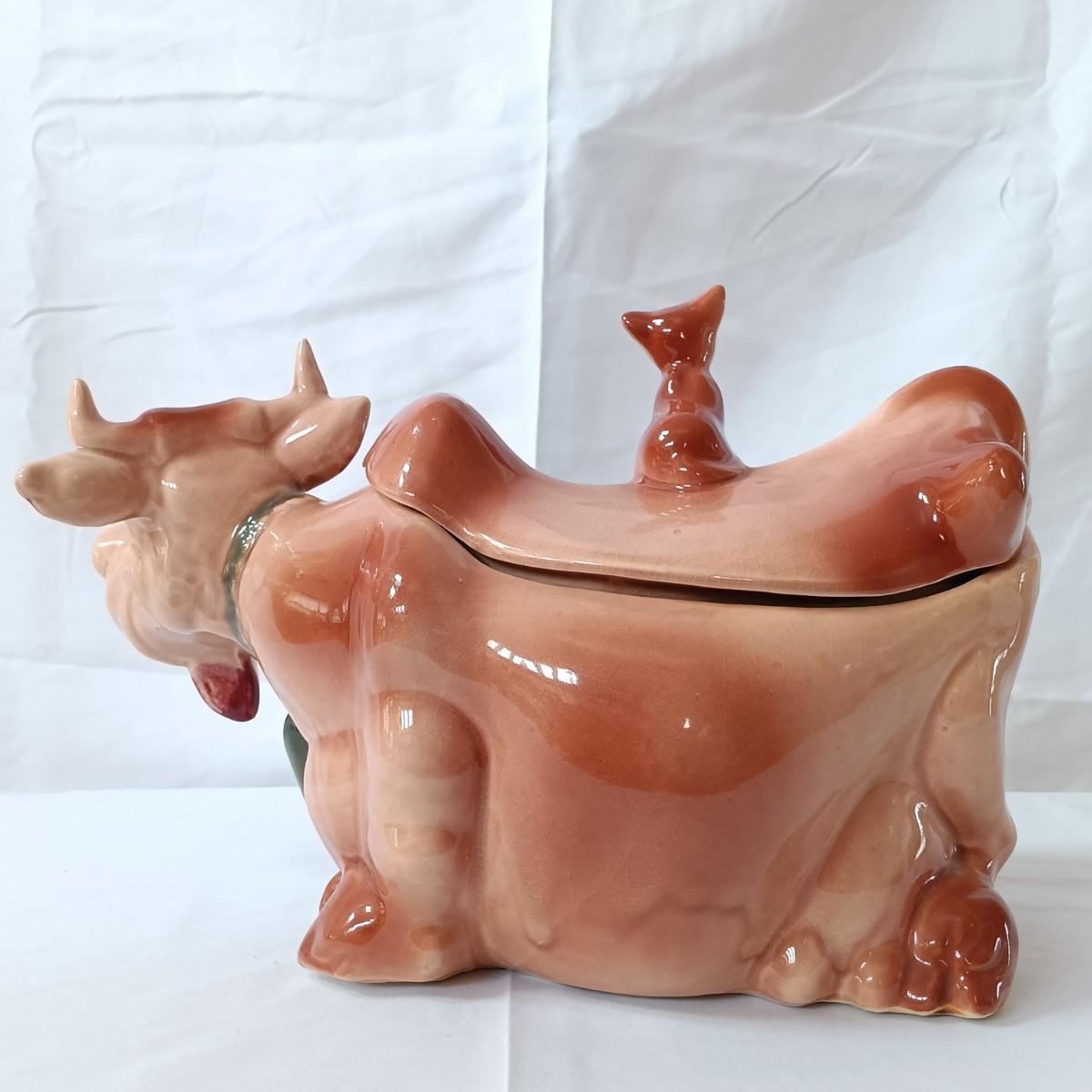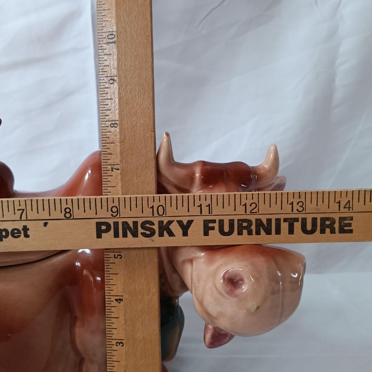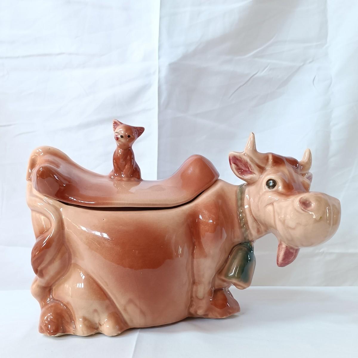 LOT 129: Vintage Brush McCoy Brown Cow with Winking Cat Cookie Jar
